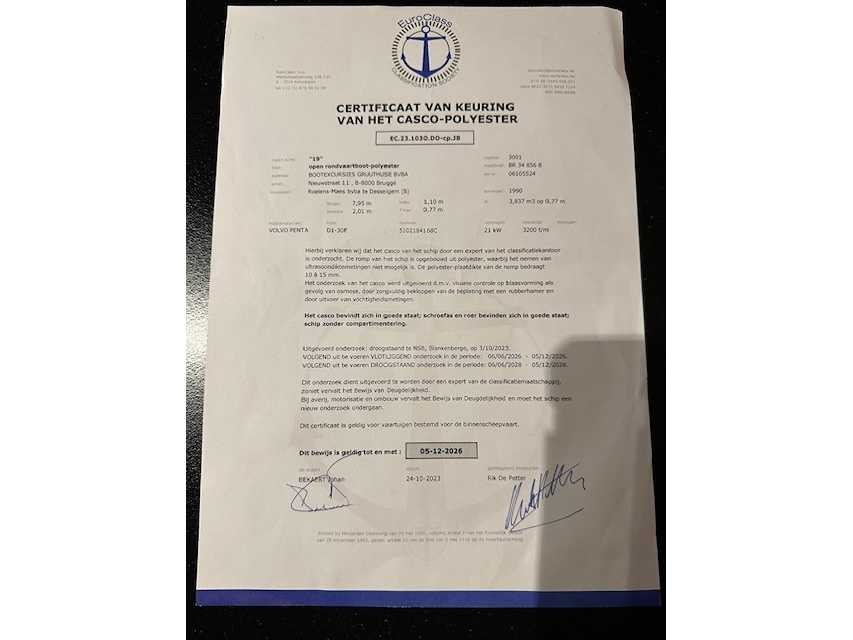 Bouwjaar 1990. Doorvaardiepte 77 cm. Volvo Penta D1 diesel 30 Pk. Gekeurd tot 5-12-2026. Geschikt voor 40 personen. Afhalen alleen mogelijk op afspraak. Rompmateriaal: Polyester Brandstof: Diesel Lengte over alles: 7.95m Breedte formaat: 2.01m Doorvaarthoogte: 1.10m Type motor: Volvo Penta D1-30F