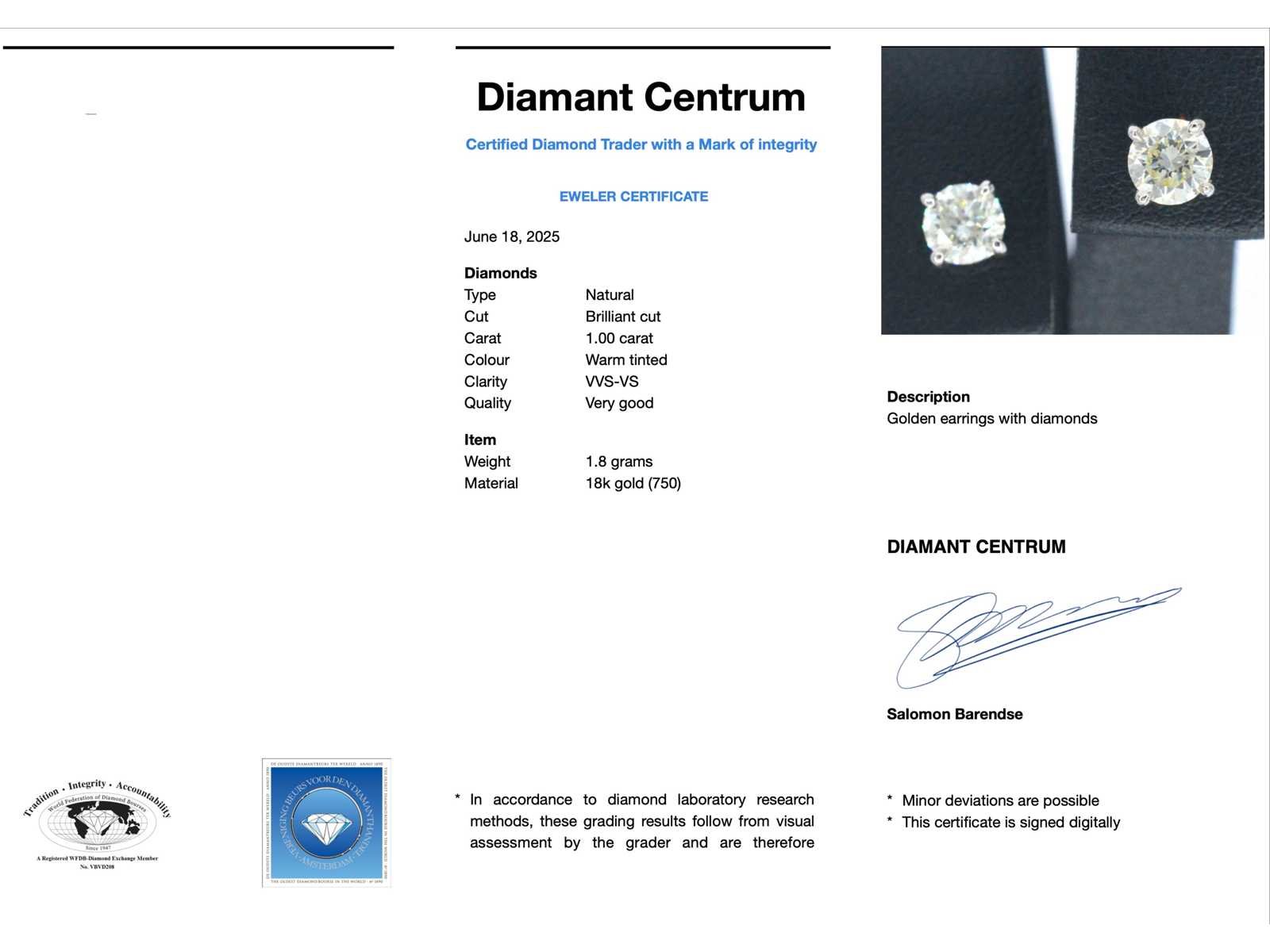 Samenvatting van gegevens Witgouden diamanten oorbellen van 1.00 carat Diamant: Natuurlijk; Aantal: 2 stuks; Slijpvorm: Briljant geslepen; Gewicht (carat): 1.00 carat; Kleur: Warm getint; Zuiverheid: VVS-VS; Slijpkwaliteit: Zeer mooi; Juweel: Oorbellen; Gewicht: 1.8 gram; Materiaal: 18K goud (750); Conditie: Nieuw; Verpakking: Luxe sieradendoos; Toelichting: De kwaliteit is overgenomen van het rapport behorend bij item. De waardebepaling is een beoordeling van een gecertificeerde diamantair, gebaseerd op consumentenprijzen.; Consumentenprijs: € 6.930,- Within 14 days Materiaal: Goud Voornaamste diamant: Natuurlijk Kleur diamant: Warm getint Gewicht diamant: 1.00ct Slijpvorm diamant: Briljant geslepen Slijpkwaliteit diamant: Zeer mooi Zuiverheidsgraad diamant: VVS-VS Totaal gewicht: 1.8g Keurmerk: 750 Lage schatting: 5544€ Hoge schatting: 6930€