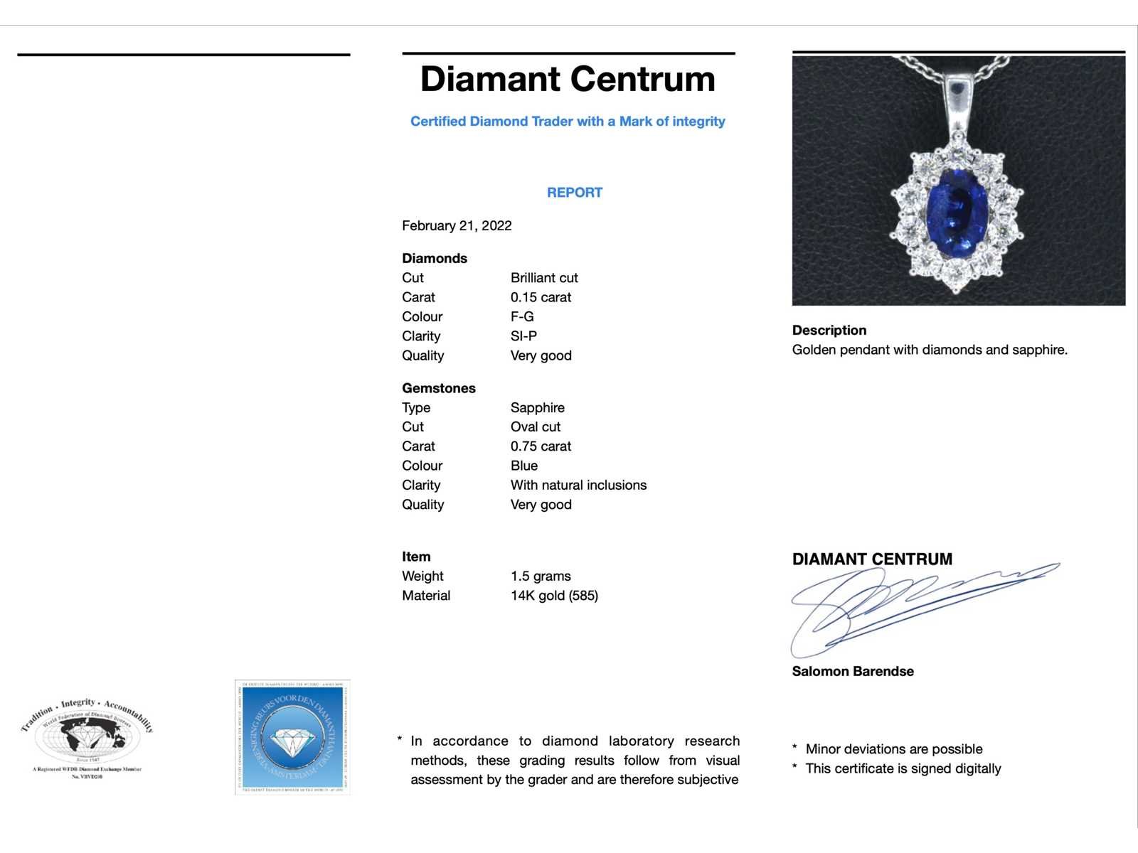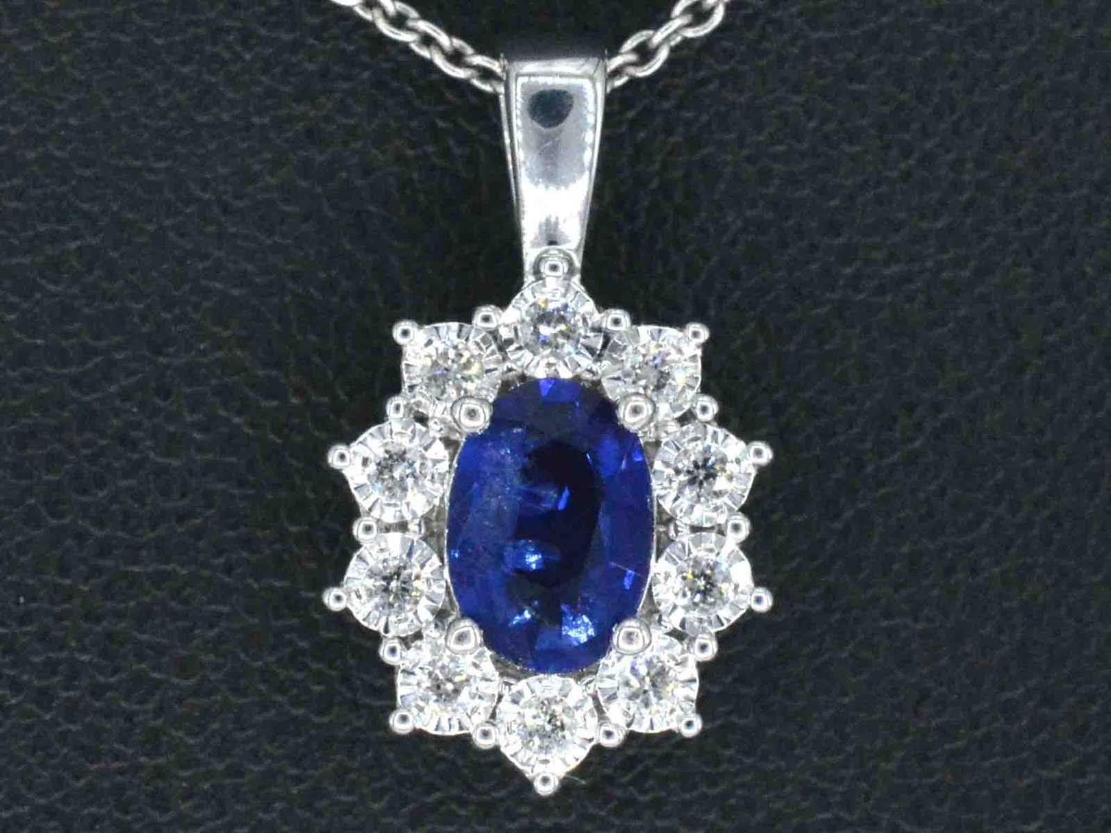 Samenvatting van gegevens Witgouden entourage hanger met diamanten en saffier Diamant: Natuurlijk; Aantal: 10 stuks; Slijpvorm: Briljant geslepen; Gewicht (carat): 0.15 carat; Kleur: F-G; Zuiverheid: SI-P; Slijpkwaliteit: Zeer mooi; Edelsteen: Saffier; Slijpvorm: Ovaal geslepen; Gewicht (carat): 0.75 carat; Kleur: Blauw; Juweel: Hanger (excl. ketting); Gewicht: 1.5 gram; Afmetingen/lengte: 1.6 x 0.9 cm; Materiaal: 14 karaat (585); Conditie: Nieuw; Verpakking: Luxe sieradendoos; Toelichting: De kwaliteit is overgenomen van het rapport behorend bij item. De waardebepaling is een beoordeling van een gecertificeerde diamantair, gebaseerd op consumentenprijzen.; Consumentenprijs: € 1.540,- Within 14 days Voornaamste diamant: Natuurlijk Kleur diamant: F-G Gewicht diamant: 0.15ct Slijpvorm diamant: Briljant geslepen Slijpkwaliteit diamant: Zeer mooi Zuiverheidsgraad diamant: SI-P Edelsteen: Saffier Kleur edelsteen: Blauw Slijpvorm edelsteen: Ovaal geslepen Totaal gewicht: 1.5g Keurmerk: 585 Lage schatting: 1232€ Hoge schatting: 1540€