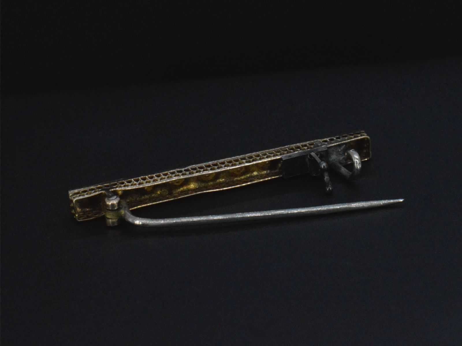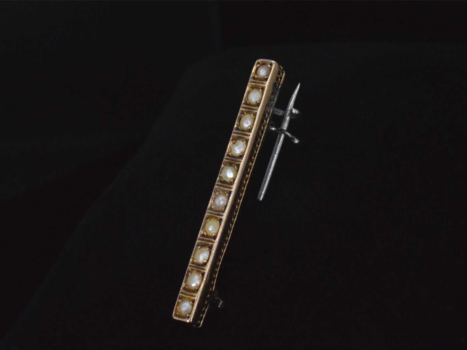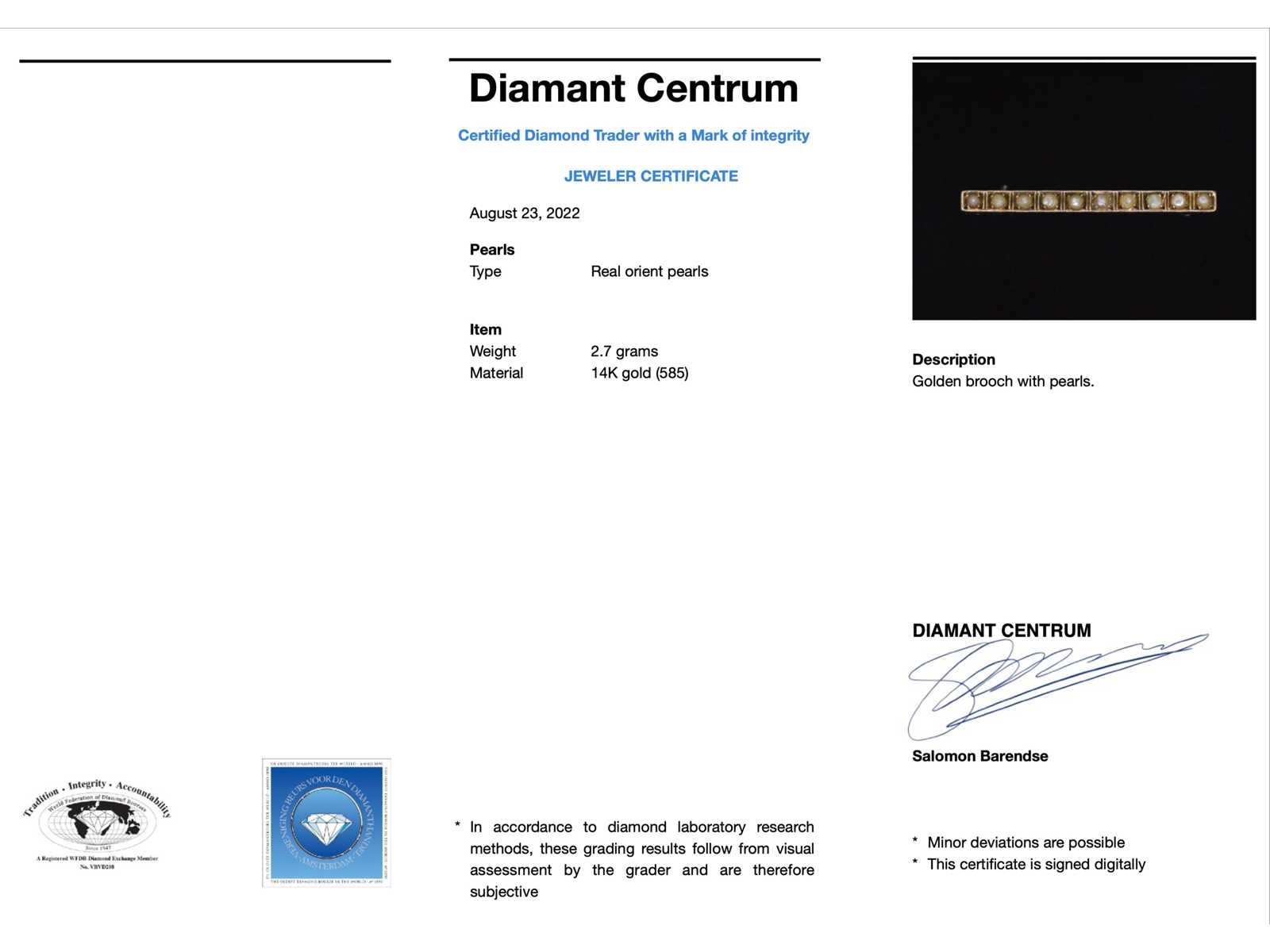 Samenvatting van gegevens Gouden broche met parels Parel: Echte orient parels; Juweel: Broche; Gewicht: 2.7 gram; Afmetingen/lengte: 40 x 4 mm; Materiaal: 14k goud (585); Conditie: Vintage; Verpakking: Luxe sieradendoos; Toelichting: De kwaliteit is overgenomen van het rapport behorend bij item. De waardebepaling is een beoordeling van een gecertificeerde diamantair, gebaseerd op consumentenprijzen.; Extra informatie: Mechaniek niet edel; Consumentenprijs: € 3.300,- Within 14 days Materiaal: Goud Totaal gewicht: 2.7g Keurmerk: 585 Lage schatting: 2640€ Hoge schatting: 3300€
