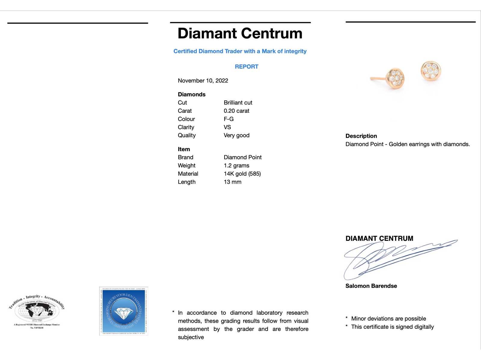 Samenvatting van gegevens Rosé gouden oorbellen met diamanten Diamant: Natuurlijk; Aantal: 14 stuks; Slijpvorm: Briljant geslepen; Gewicht (carat): 0.20 carat; Kleur: F-G; Zuiverheid: VS; Slijpkwaliteit: Zeer mooi; Juweel: Oorbellen; Merk: Diamond Point; Gewicht: 1.2 gram; Materiaal: 14K goud (585); Conditie: Zo goed als nieuw; Verpakking: Luxe sieradendoos; Toelichting: De kwaliteit is overgenomen van het rapport behorend bij item. De waardebepaling is een beoordeling van een gecertificeerde diamantair, gebaseerd op consumentenprijzen.; Consumentenprijs: € 2.310,- Within 14 days Materiaal: Goud Voornaamste diamant: Natuurlijk Kleur diamant: F-G Gewicht diamant: 0.20ct Slijpvorm diamant: Briljant geslepen Slijpkwaliteit diamant: Zeer mooi Zuiverheidsgraad diamant: VS Totaal gewicht: 1.2g Keurmerk: 585 Lage schatting: 1848€ Hoge schatting: 2310€