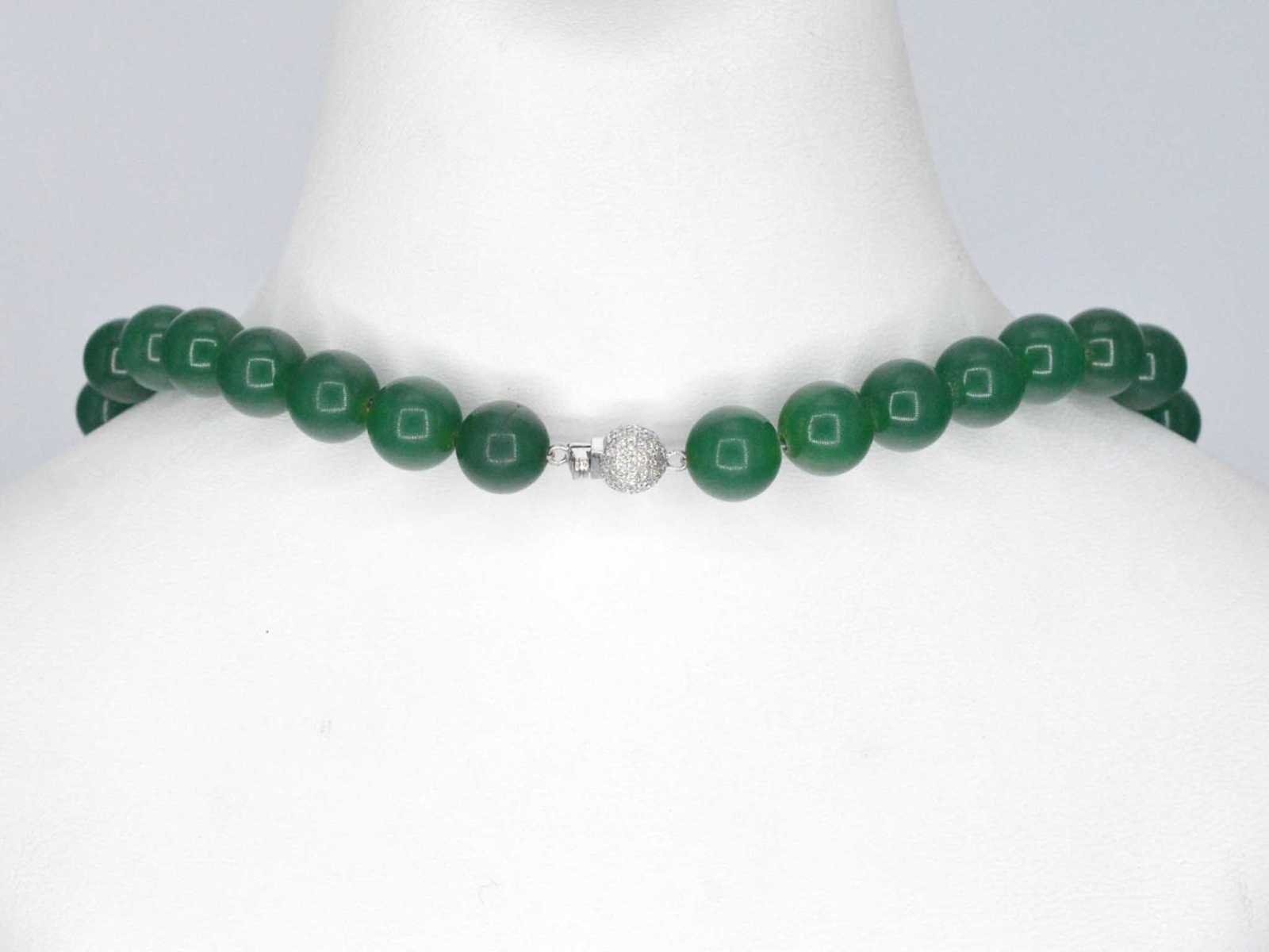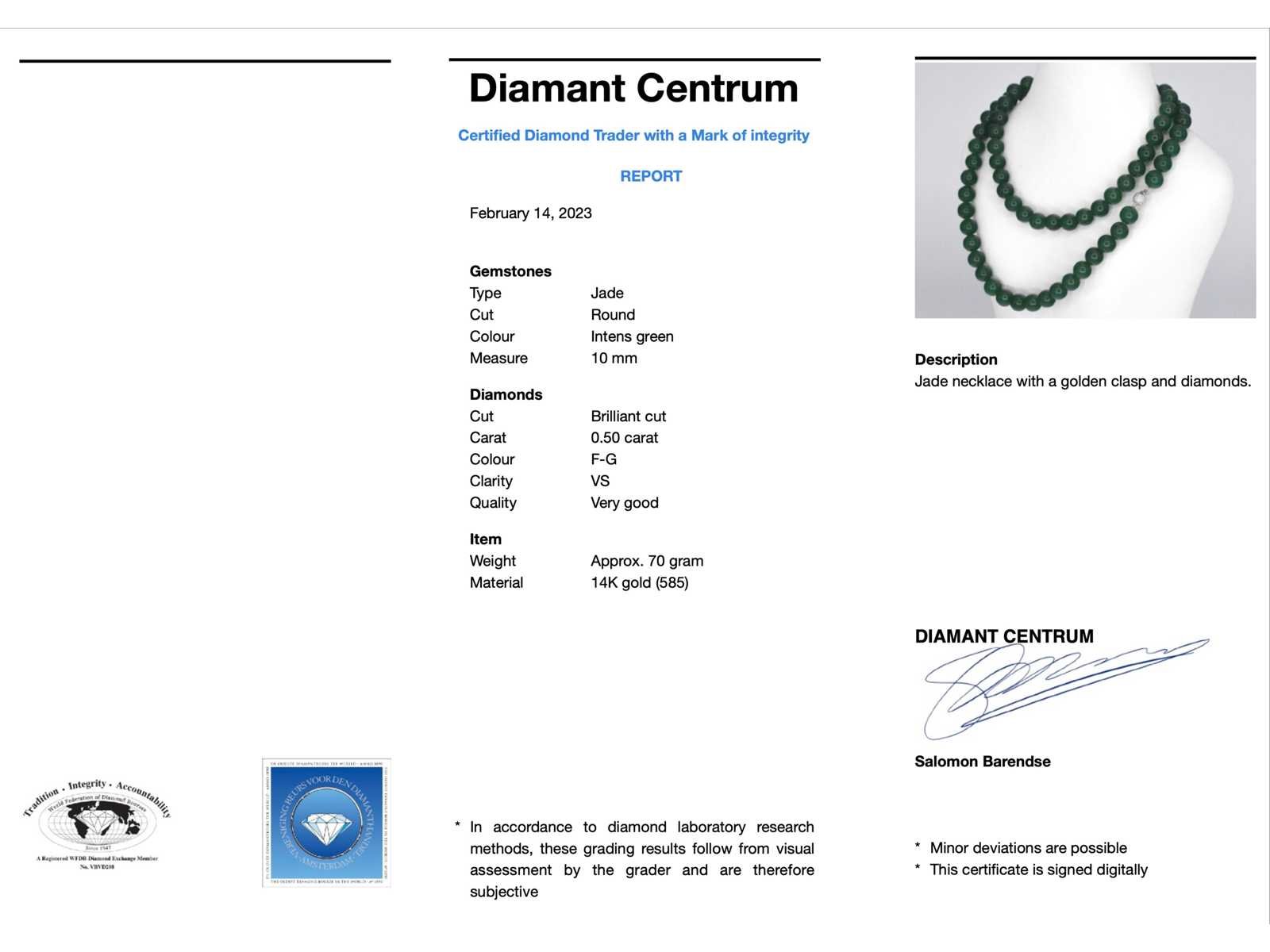 Samenvatting van gegevens Ketting met jade edelsteen en een diamanten sluiting Diamant: Natuurlijk; Slijpvorm: Briljant geslepen; Gewicht (carat): 0.50 carat; Kleur: F-G; Zuiverheid: VS; Slijpkwaliteit: Heel goed; Edelsteen: Jade; Slijpvorm: Rond; Kleur: Intens groen; Afmetingen: 10 mm; Kwaliteit: Mooi glanzend; Juweel: Collier; Gewicht: ca. 80 gram; Afmetingen/lengte: ca. 70.0 cm; Materiaal: 14k goud (585); Conditie: Nieuw; Verpakking: Luxe sieradendoos; Toelichting: De kwaliteit is overgenomen van het rapport behorend bij item. De waardebepaling is een beoordeling van een gecertificeerde diamantair, gebaseerd op consumentenprijzen.; Extra informatie: Sluiting: 14K goud (585) met diamanten; Consumentenprijs: € 3.080,- Within 14 days Materiaal: Goud Voornaamste diamant: Natuurlijk Kleur diamant: F-G Gewicht diamant: 0.50ct Slijpvorm diamant: Briljant geslepen Slijpkwaliteit diamant: Heel goed Zuiverheidsgraad diamant: VS Edelsteen: Jade Kleur edelsteen: Intens groen Totaal gewicht: ca.g Keurmerk: 585 Lage schatting: 2464€ Hoge schatting: 3080€ Slijpvorm edelsteen: Rond