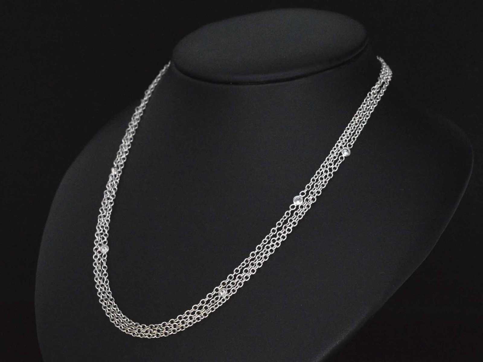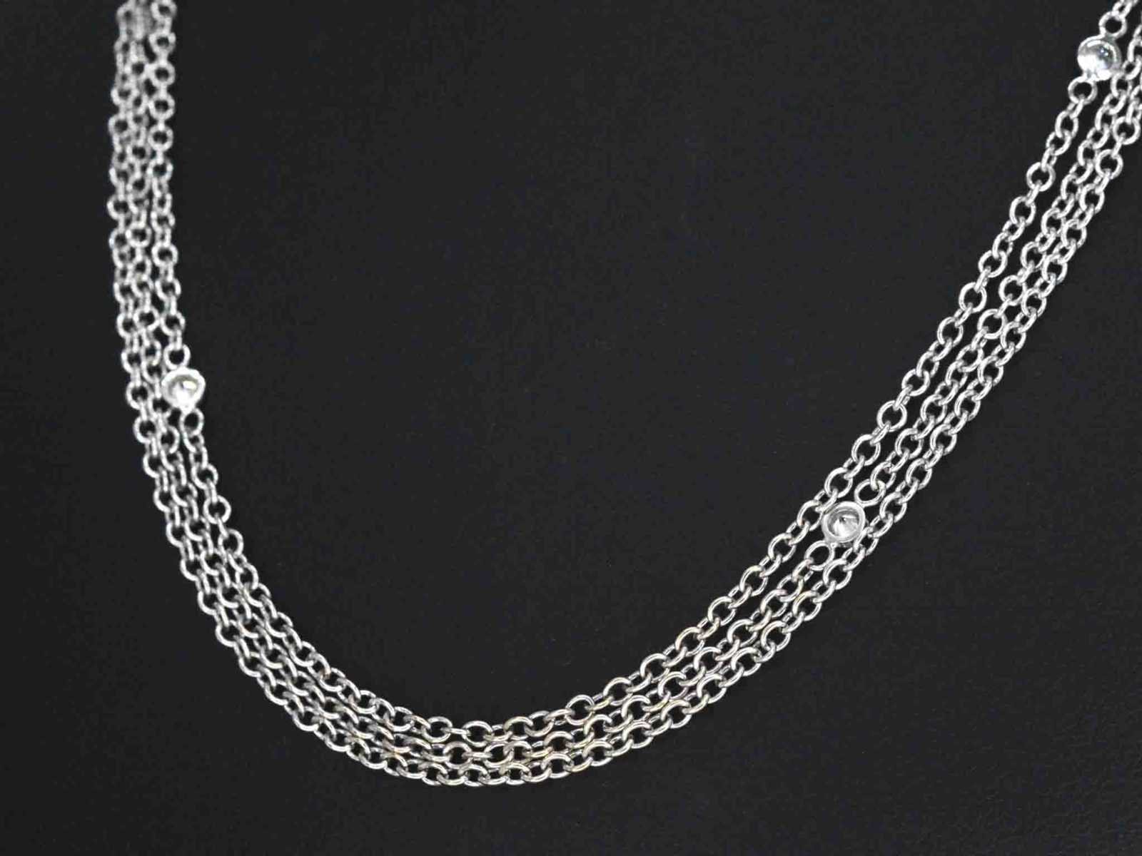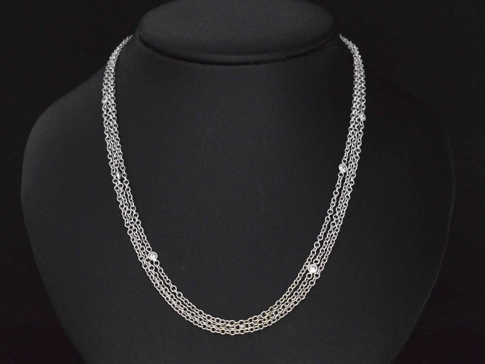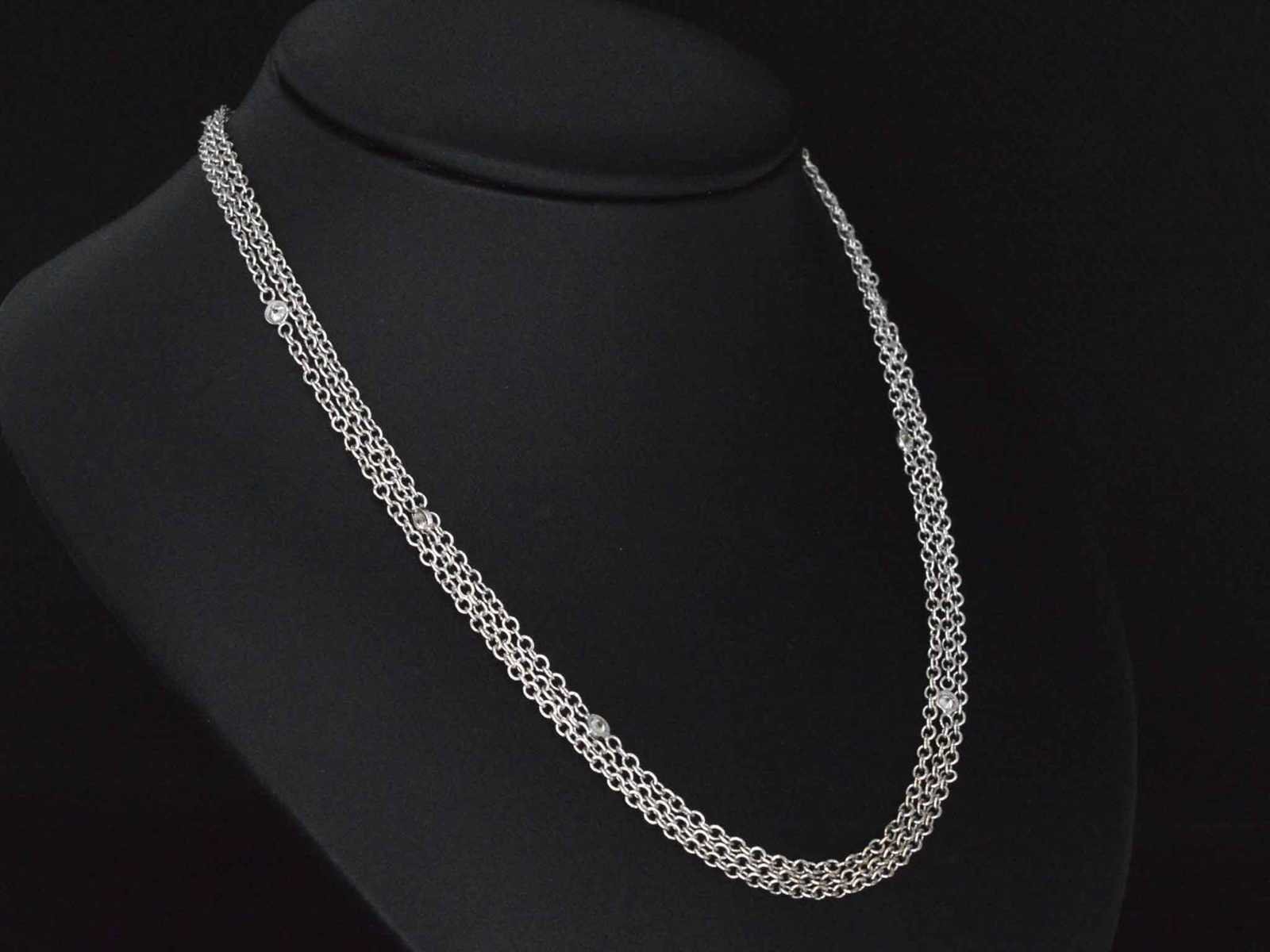 Samenvatting van gegevens Witgouden collier met diamanten Diamant: Natuurlijk; Aantal: 6 stuk; Slijpvorm: Briljant geslepen; Gewicht (carat): 0.30 carat; Kleur: F; Zuiverheid: VVS; Slijpkwaliteit: Zeer mooi; Juweel: Collier; Gewicht: 10.4 gram; Afmetingen/lengte: 45.7 cm; Materiaal: 18k goud (750); Conditie: Zo goed als nieuw; Verpakking: Luxe sieradendoos; Toelichting: De kwaliteit is overgenomen van het rapport behorend bij item. De waardebepaling is een beoordeling van een gecertificeerde diamantair, gebaseerd op consumentenprijzen.; Consumentenprijs: € 7.000,- Within 14 days Materiaal: Goud Voornaamste diamant: Natuurlijk Kleur diamant: F Gewicht diamant: 0.30ct Slijpvorm diamant: Briljant geslepen Slijpkwaliteit diamant: Zeer mooi Zuiverheidsgraad diamant: VVS Totaal gewicht: 10.4g Keurmerk: 750 Lage schatting: 5600€ Hoge schatting: 7000€