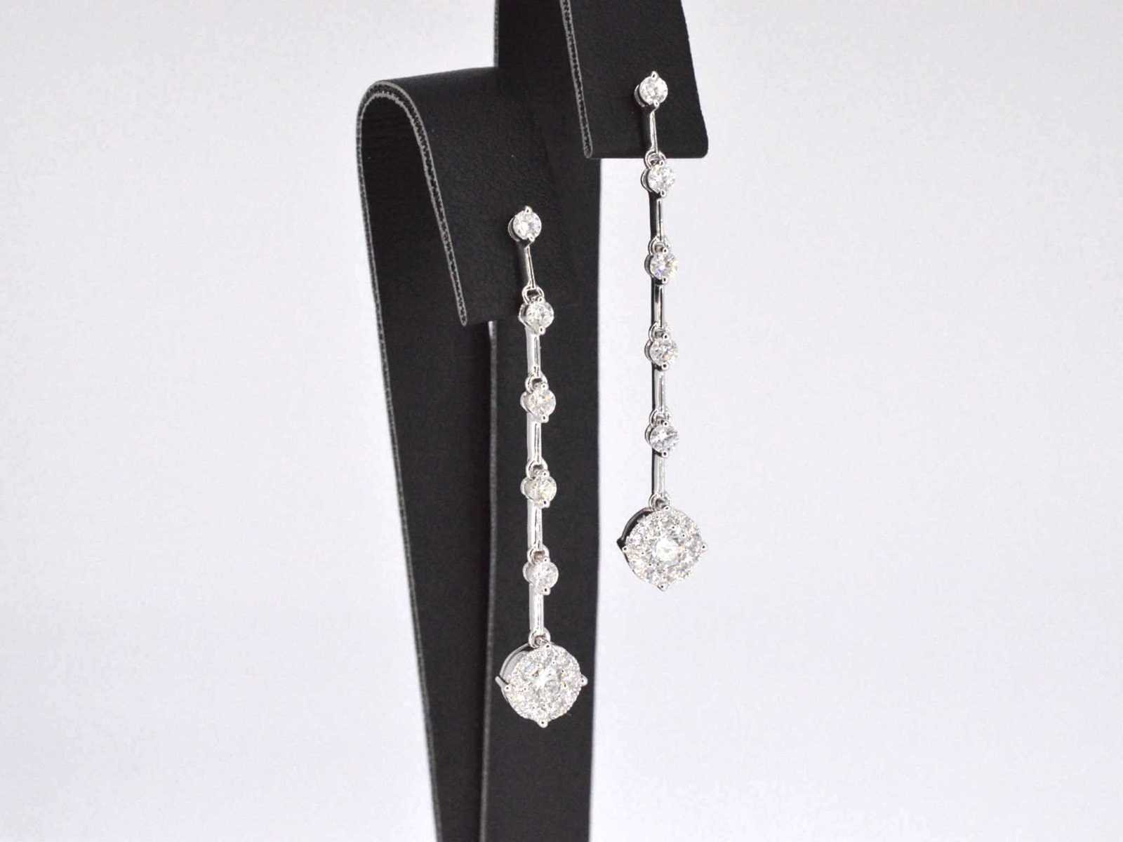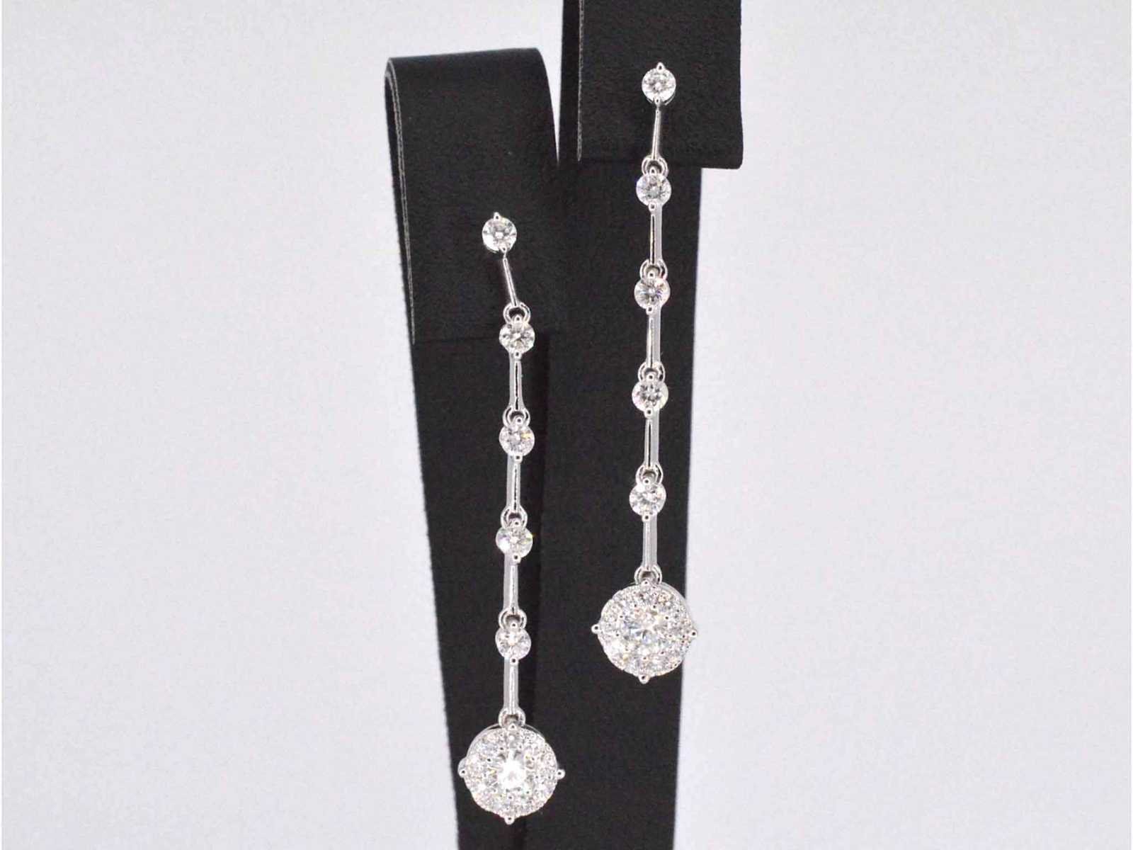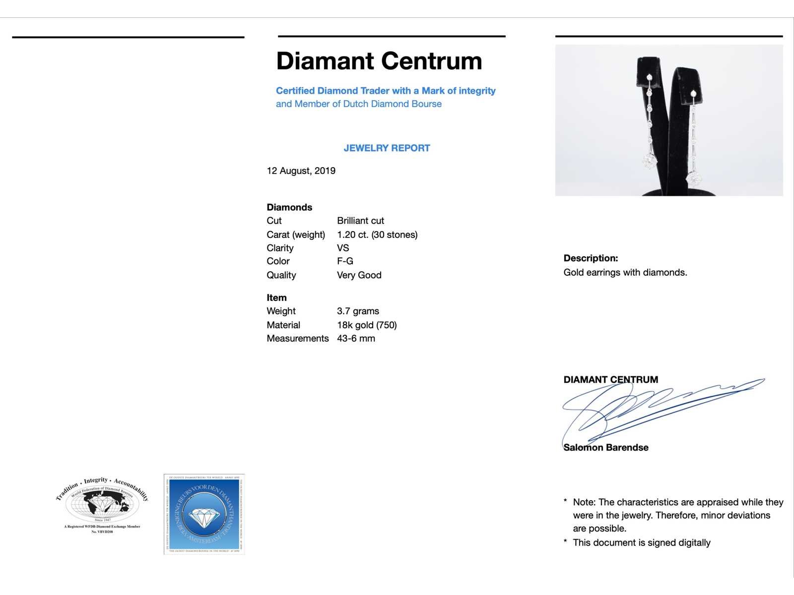 Samenvatting van gegevens Witgouden oorhangers met diamanten Diamant: Natuurlijk; Aantal: 30 stuks; Slijpvorm: Briljant geslepen; Gewicht (carat): 1.20 carat; Kleur: F-G; Zuiverheid: VS; Slijpkwaliteit: Zeer mooi; Juweel: Oorhanger; Gewicht: 3.7 gram; Afmetingen/lengte: 43 mm; Materiaal: 18K goud (750); Conditie: Nieuw; Verpakking: Luxe sieradendoos; Toelichting: De kwaliteit is overgenomen van het rapport behorend bij item. De waardebepaling is een beoordeling van een gecertificeerde diamantair, gebaseerd op consumentenprijzen.; Consumentenprijs: € 9.398,- Within 14 days Materiaal: Goud Voornaamste diamant: Natuurlijk Kleur diamant: F-G Gewicht diamant: 1.20ct Slijpvorm diamant: Briljant geslepen Slijpkwaliteit diamant: Zeer mooi Zuiverheidsgraad diamant: VS Totaal gewicht: 3.7g Keurmerk: 750 Lage schatting: 7518.400000000001€ Hoge schatting: 9398€