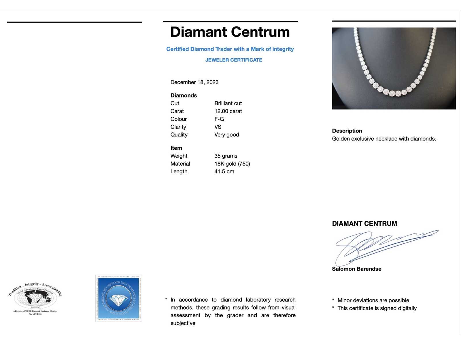 Samenvatting van gegevens Diamanten collier met 800 briljant geslepen diamanten 12.00 carat Diamant: Natuurlijk oplopend van klein naar groot; Aantal: 800 stuks; Slijpvorm: Briljant geslepen; Gewicht (carat): 12.00 carat; Kleur: F-G; Zuiverheid: VS; Slijpkwaliteit: Zeer mooi; Juweel: Collier; Gewicht: 35 gram; Afmetingen/lengte: 41,5 cm; Materiaal: 18K goud (750); Conditie: Nieuw; Verpakking: Luxe sieradendoos; Toelichting: De kwaliteit is overgenomen van het rapport behorend bij item. De waardebepaling is een beoordeling van een gecertificeerde diamantair, gebaseerd op consumentenprijzen.; Consumentenprijs: € 67.813,- Within 14 days Materiaal: Goud Voornaamste diamant: Natuurlijk oplopend van klein naar groot Kleur diamant: F-G Gewicht diamant: 12.00ct Slijpvorm diamant: Briljant geslepen Slijpkwaliteit diamant: Zeer mooi Zuiverheidsgraad diamant: VS Totaal gewicht: 35g Keurmerk: 750 Lage schatting: 54250.4€ Hoge schatting: 67813€
