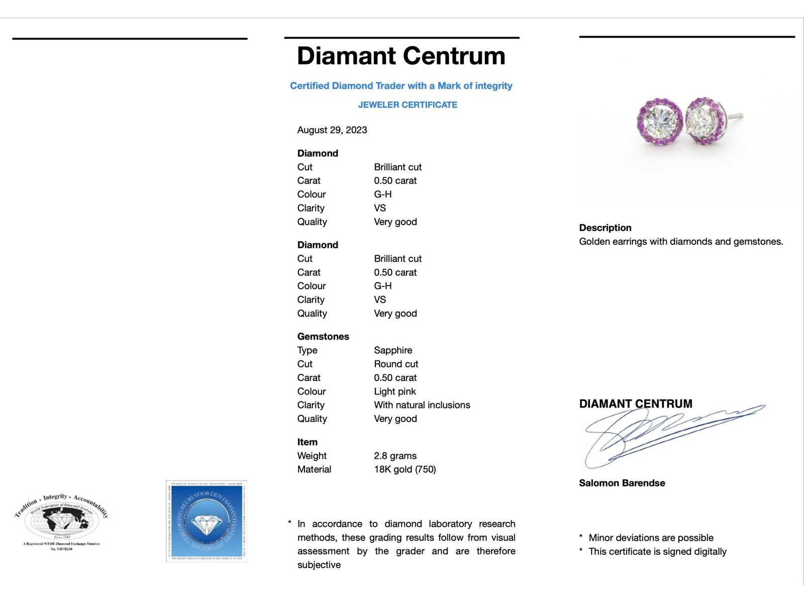 Samenvatting van gegevens Witgouden oorbellen met diamanten en roze saffieren Diamant: Natuurlijk; Aantal: 2 stuks; Slijpvorm: Briljant geslepen; Gewicht (carat): 1.00 carat; Kleur: G-H; Zuiverheid: VS; Slijpkwaliteit: Zeer mooi; Edelsteen: Roze saffier; Slijpvorm: Rond geslepen; Gewicht (carat): 0.50 carat; Kleur: Licht roze; Zuiverheid: Met natuurlijke insluitsels; Juweel: Oorbellen; Gewicht: 2.8 gram; Materiaal: 18k goud (750); Conditie: Nieuw; Verpakking: Luxe sieradendoos; Toelichting: De kwaliteit is overgenomen van het rapport behorend bij item. De waardebepaling is een beoordeling van een gecertificeerde diamantair, gebaseerd op consumentenprijzen.; Consumentenprijs: € 9.450,- Within 14 days Materiaal: Goud Voornaamste diamant: Natuurlijk Kleur diamant: G-H Gewicht diamant: 1.00ct Slijpvorm diamant: Briljant geslepen Slijpkwaliteit diamant: Zeer mooi Zuiverheidsgraad diamant: VS Edelsteen: Roze saffier Kleur edelsteen: Licht roze Slijpvorm edelsteen: Rond geslepen Zuiverheidsgraad edelsteen: Met natuurlijke insluitsels Totaal gewicht: 2.8g Keurmerk: 750 Lage schatting: 7560€ Hoge schatting: 9450€