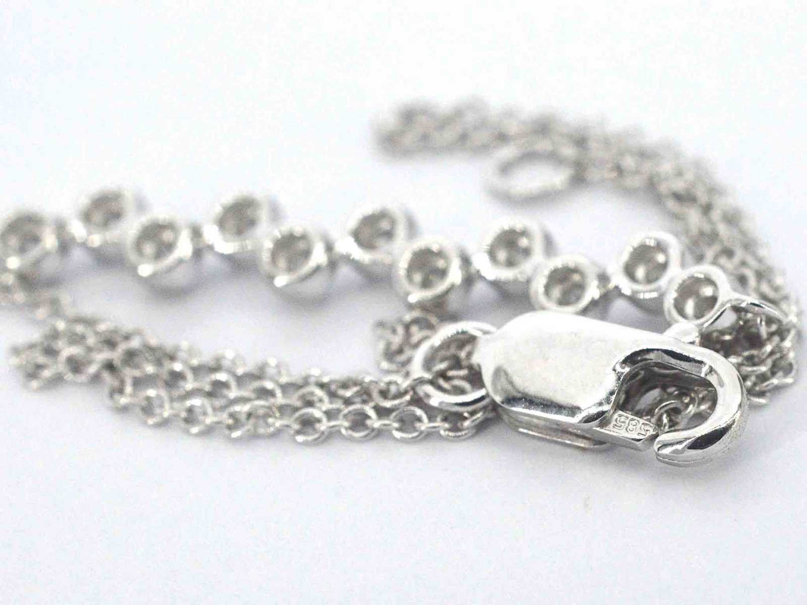 Samenvatting van gegevens Witgouden armband met diamanten Diamant: Natuurlijk; Aantal: 11 stuks; Slijpvorm: Briljant geslepen; Gewicht (carat): 0.20 carat; Kleur: F-G; Zuiverheid: SI-P; Slijpkwaliteit: Zeer mooi; Juweel: Armband; Gewicht: 1 gram; Afmetingen/lengte: 17.5 cm; Materiaal: 14k goud (585); Conditie: Nieuw; Verpakking: Luxe sieradendoos; Toelichting: De kwaliteit is overgenomen van het rapport behorend bij item. De waardebepaling is een beoordeling van een gecertificeerde diamantair, gebaseerd op consumentenprijzen.; Consumentenprijs: € 1.470,- Within 14 days Materiaal: Goud Voornaamste diamant: Natuurlijk Kleur diamant: F-G Gewicht diamant: 0.20ct Slijpvorm diamant: Briljant geslepen Slijpkwaliteit diamant: Zeer mooi Zuiverheidsgraad diamant: SI-P Totaal gewicht: 1g Keurmerk: 585 Lage schatting: 1176€ Hoge schatting: 1470€
