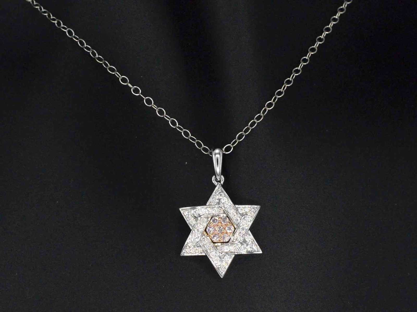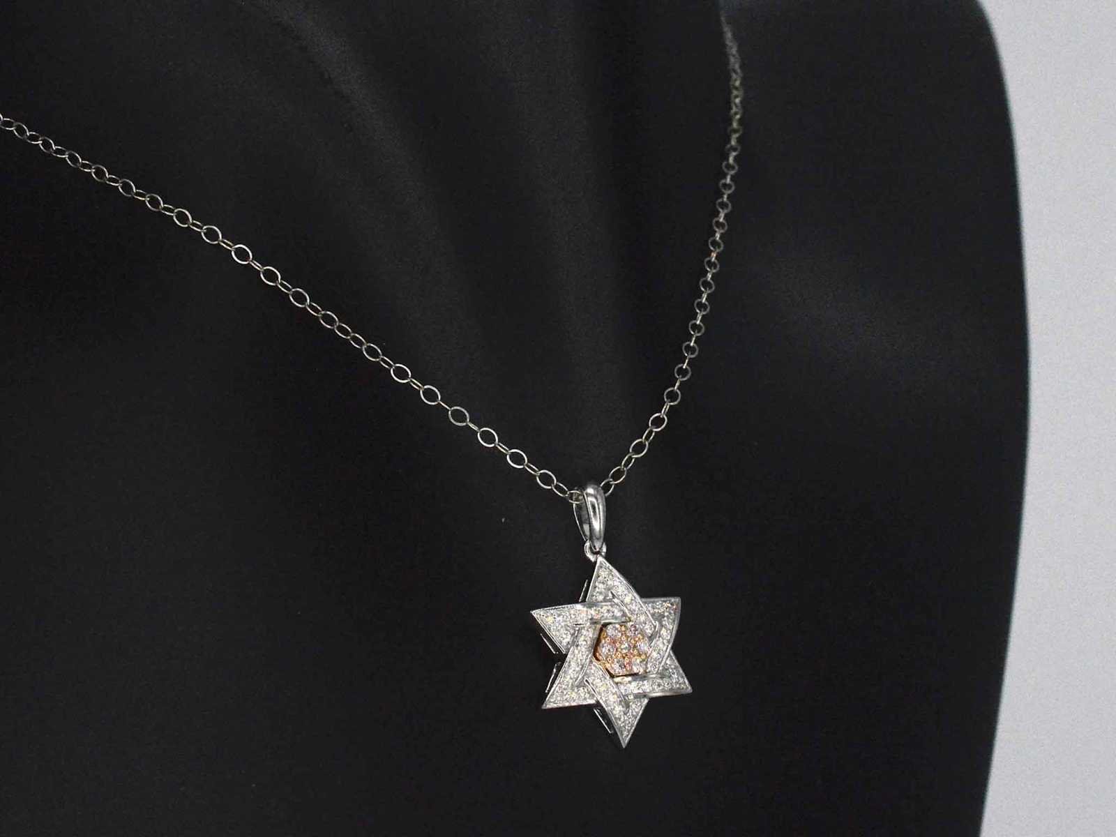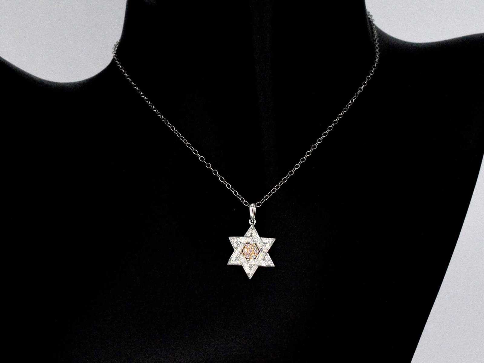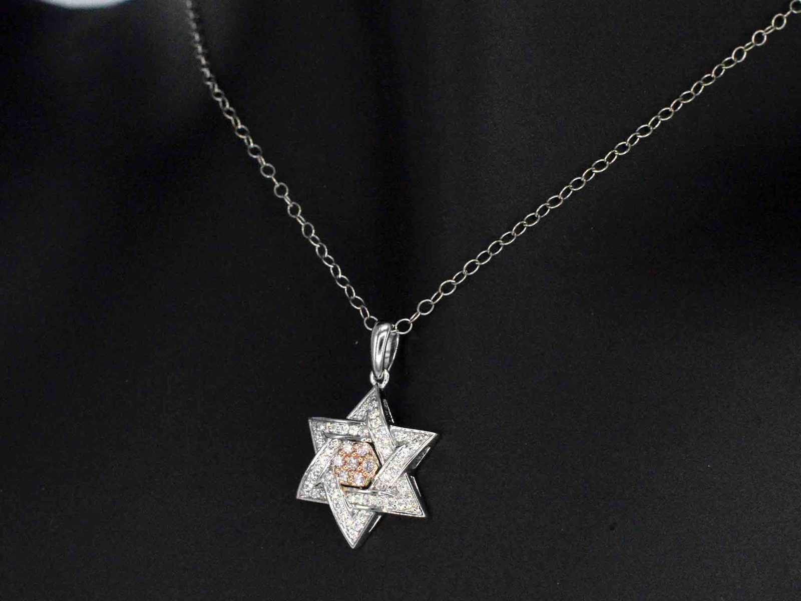 Samenvatting van gegevens Davidster hanger met natuurlijke roze en witte diamanten van hoge kwaliteit Diamant: Natuurlijk; Aantal: 7 stuks; Slijpvorm: Briljant geslepen; Gewicht (carat): 0.10 carat; Kleur: Natuurlijke roze; Zuiverheid: VS; Slijpkwaliteit: Zeer mooi; Diamant (secundair): Natuurlijk; Aantal diamanten: 54 stuks; Slijpvorm: Briljant geslepen; Gewicht (carat): 0.25 carat; Kleur: F-G; Zuiverheid: VS; Slijpkwaliteit: Very good; Juweel: Hanger (excl. ketting); Gewicht: 2 gram; Afmetingen/lengte: 2.1 x 1.5 cm; Materiaal: 14 karaat (585); Conditie: Nieuw; Verpakking: Luxe sieradendoos; Toelichting: De kwaliteit is overgenomen van het rapport behorend bij item. De waardebepaling is een beoordeling van een gecertificeerde diamantair, gebaseerd op consumentenprijzen.; Consumentenprijs: € 1.855,- Within 14 days Voornaamste diamant: Natuurlijk Kleur diamant: Natuurlijke roze Gewicht diamant: 0.10ct Slijpvorm diamant: Briljant geslepen Slijpkwaliteit diamant: Zeer mooi Zuiverheidsgraad diamant: VS Totaal gewicht: 2g Keurmerk: 585 Lage schatting: 1484€ Hoge schatting: 1855€