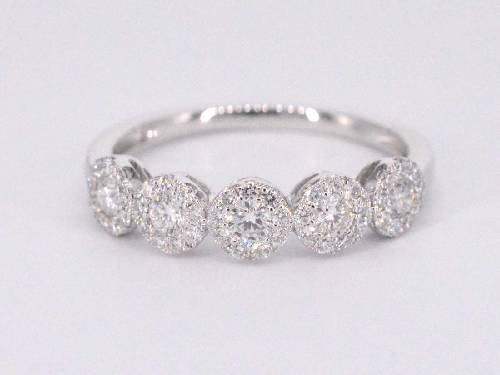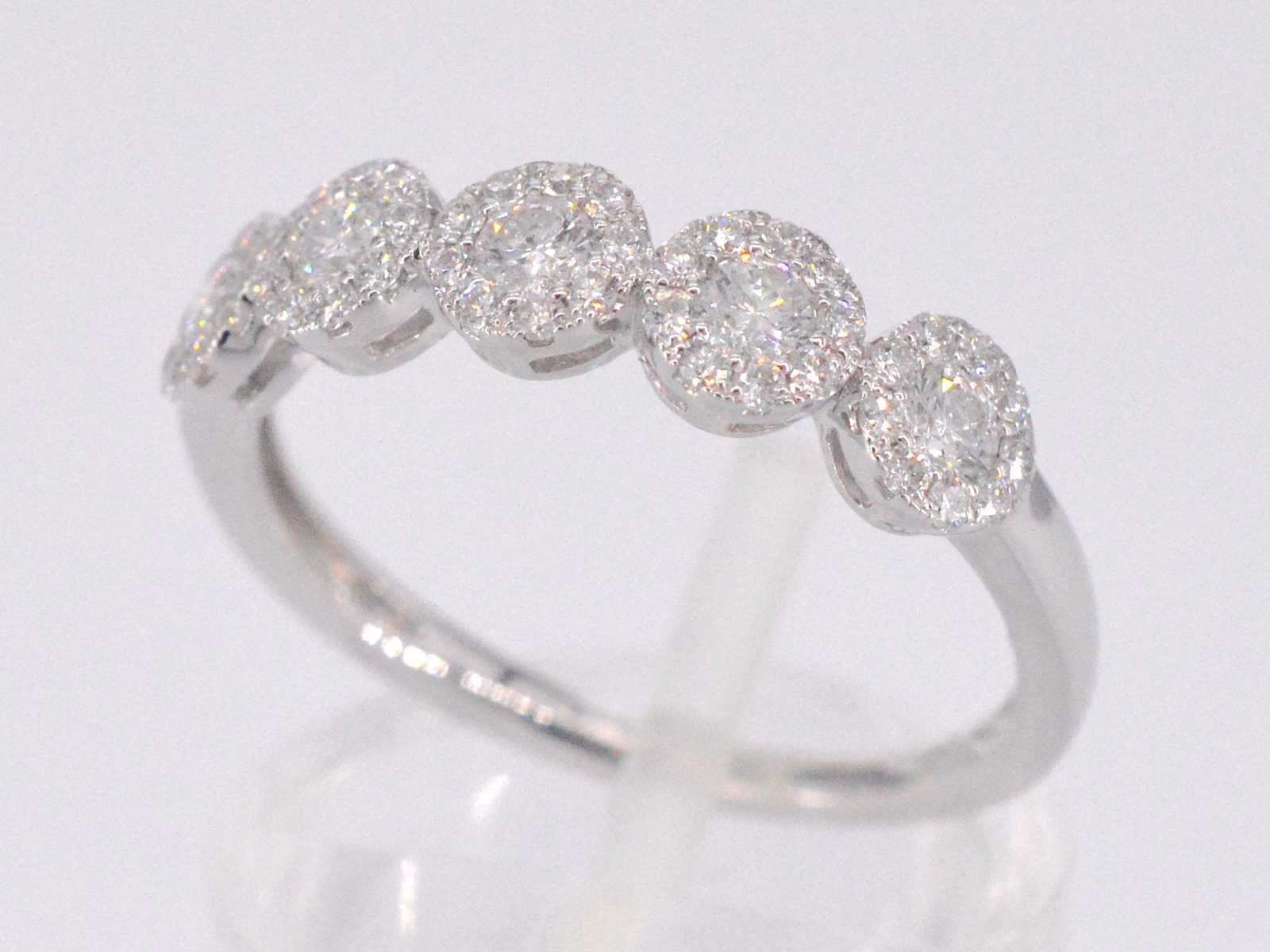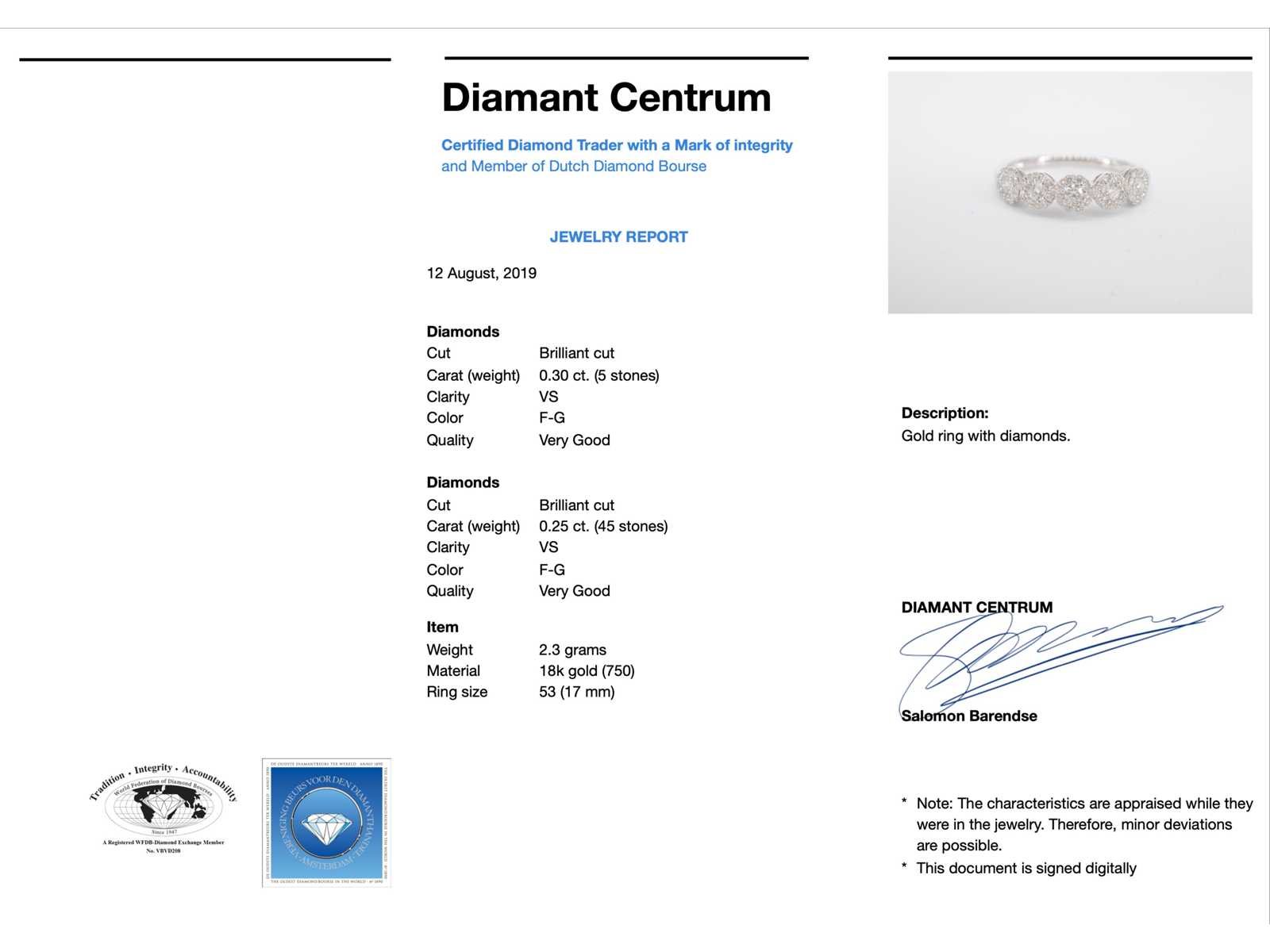 Samenvatting van gegevens Witgouden ring met diamanten Diamant: Natuurlijk; Aantal: 5 stuks; Slijpvorm: Briljant geslepen; Gewicht (carat): 0.30 carat; Kleur: F-G; Zuiverheid: VS; Slijpkwaliteit: Zeer mooi; Diamant (secundair): Diamanten entourage; Aantal diamanten: 45 stuks; Slijpvorm: Briljant geslepen; Gewicht (carat): 0.25 carat; Kleur: F-G; Zuiverheid: VS; Slijpkwaliteit: Very good; Juweel: Ring; Gewicht: 2.3 gram; Ringmaat (op maat gemaakt*): 53 (17 mm); Materiaal: 18K goud (750); Conditie: Nieuw; Verpakking: Luxe sieradendoos; Toelichting: De kwaliteit is overgenomen van het rapport behorend bij item. De waardebepaling is een beoordeling van een gecertificeerde diamantair, gebaseerd op consumentenprijzen.; Consumentenprijs: € 4.708,- Within 14 days Materiaal: Goud Voornaamste diamant: Natuurlijk Gewicht diamant: 0.30ct Totaal gewicht: 2.3g Keurmerk: 750 Lage schatting: 3766.4€ Hoge schatting: 4708€ Kleur diamant: F-G Slijpvorm diamant: Briljant geslepen Slijpkwaliteit diamant: Zeer mooi Zuiverheidsgraad diamant: VS
