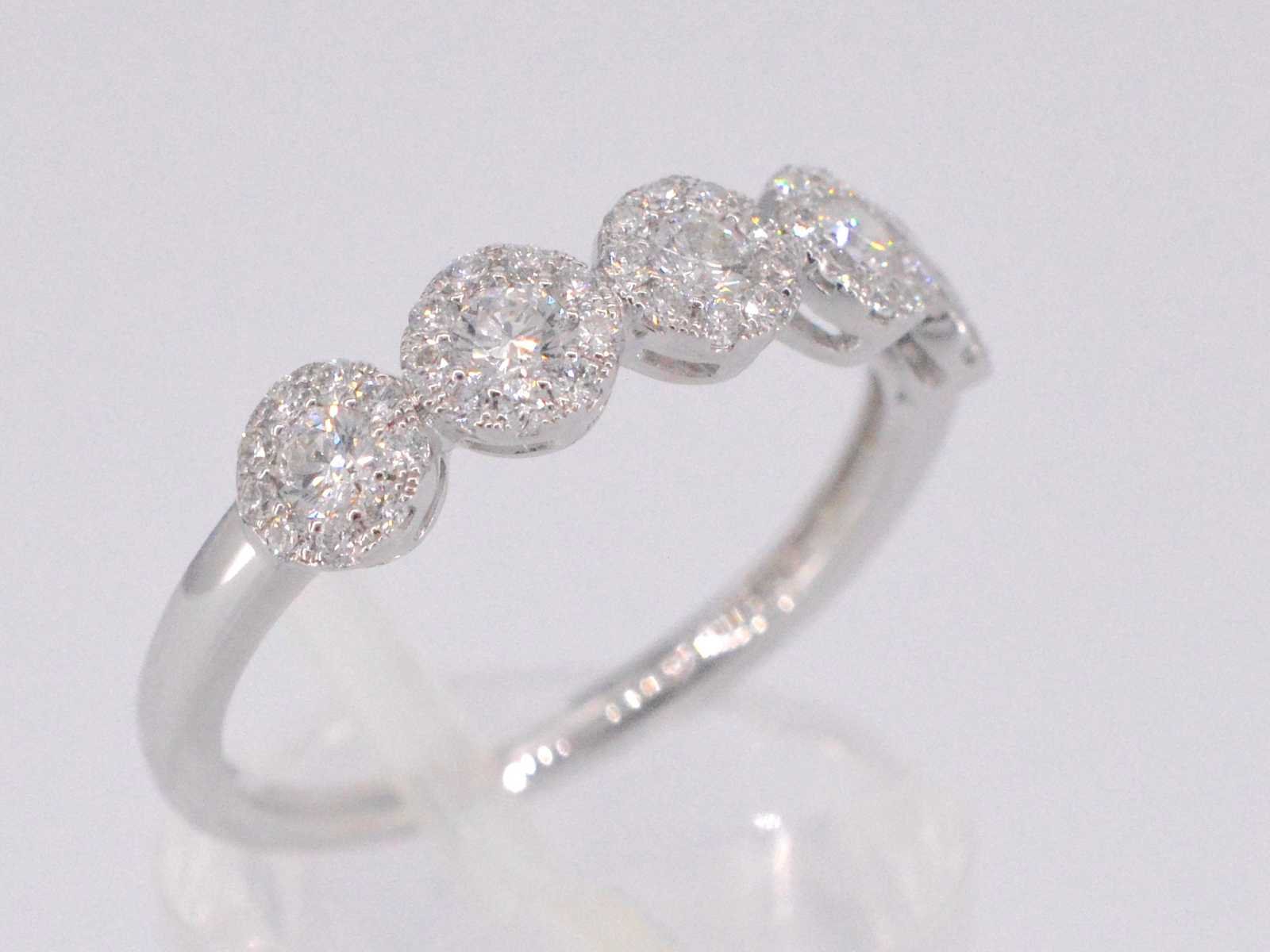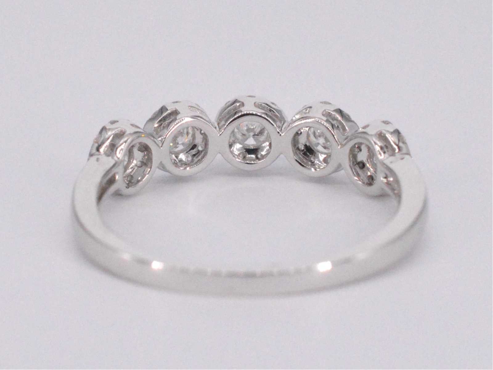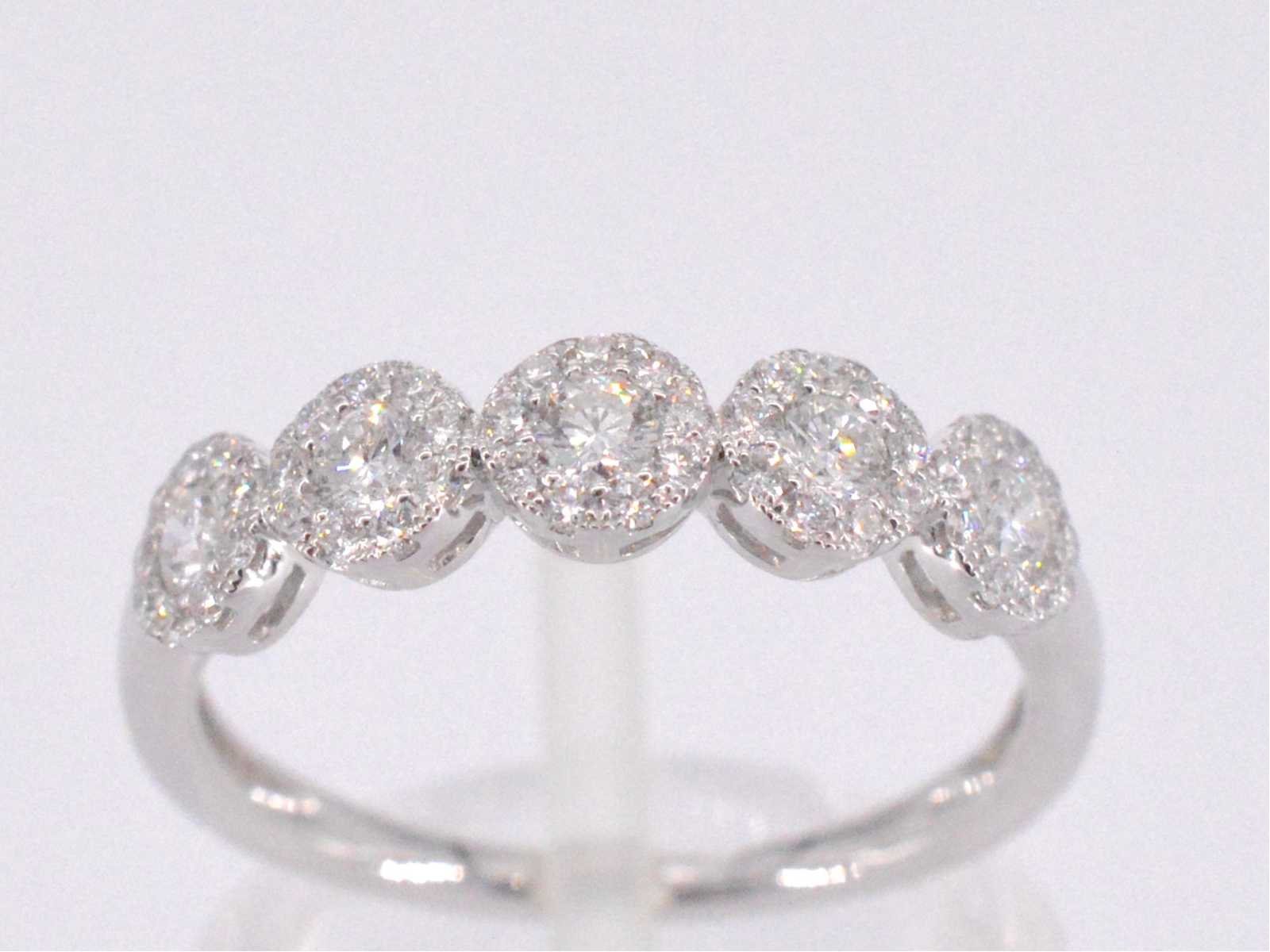 Samenvatting van gegevens Witgouden ring met diamanten Diamant: Natuurlijk; Aantal: 5 stuks; Slijpvorm: Briljant geslepen; Gewicht (carat): 0.30 carat; Kleur: F-G; Zuiverheid: VS; Slijpkwaliteit: Zeer mooi; Diamant (secundair): Diamanten entourage; Aantal diamanten: 45 stuks; Slijpvorm: Briljant geslepen; Gewicht (carat): 0.25 carat; Kleur: F-G; Zuiverheid: VS; Slijpkwaliteit: Very good; Juweel: Ring; Gewicht: 2.3 gram; Ringmaat (op maat gemaakt*): 53 (17 mm); Materiaal: 18K goud (750); Conditie: Nieuw; Verpakking: Luxe sieradendoos; Toelichting: De kwaliteit is overgenomen van het rapport behorend bij item. De waardebepaling is een beoordeling van een gecertificeerde diamantair, gebaseerd op consumentenprijzen.; Consumentenprijs: € 4.708,- Within 14 days Materiaal: Goud Voornaamste diamant: Natuurlijk Gewicht diamant: 0.30ct Totaal gewicht: 2.3g Keurmerk: 750 Lage schatting: 3766.4€ Hoge schatting: 4708€ Kleur diamant: F-G Slijpvorm diamant: Briljant geslepen Slijpkwaliteit diamant: Zeer mooi Zuiverheidsgraad diamant: VS