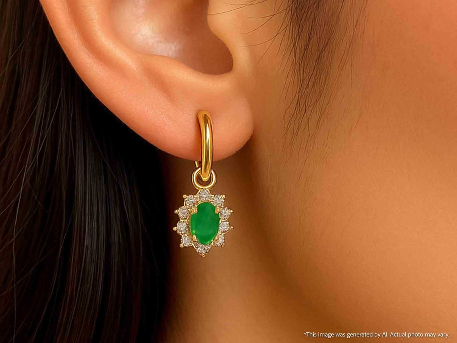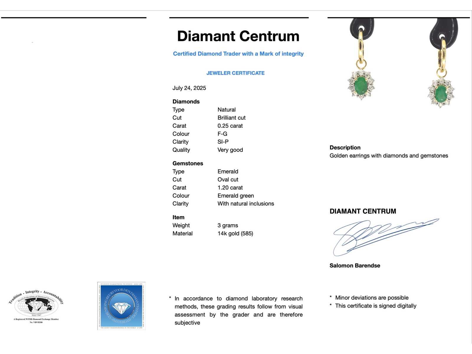 Samenvatting van gegevens Gouden oorhangers met natuurlijke diamanten en smaragden Diamant: Natuurlijk; Aantal: 20 stuks; Slijpvorm: Briljant geslepen; Gewicht (carat): 0.25 carat; Kleur: F-G; Zuiverheid: SI-P; Slijpkwaliteit: Zeer mooi; Edelsteen: Smaragd; Aantal: 2 stuks; Slijpvorm: Ovaal geslepen; Gewicht (carat): 1.20 carat; Kleur: Smaragd groen; Zuiverheid: Met natuurlijke insluitsels; Juweel: Oorbellen; Gewicht: 3 gram; Materiaal: 14k goud (585); Conditie: Nieuw; Verpakking: Luxe sieradendoos; Toelichting: De kwaliteit is overgenomen van het rapport behorend bij item. De waardebepaling is een beoordeling van een gecertificeerde diamantair, gebaseerd op consumentenprijzen.; Consumentenprijs: € 2.573,- Within 14 days Materiaal: Goud Voornaamste diamant: Natuurlijk Kleur diamant: F-G Gewicht diamant: 0.25ct Slijpvorm diamant: Briljant geslepen Slijpkwaliteit diamant: Zeer mooi Zuiverheidsgraad diamant: SI-P Edelsteen: Smaragd Kleur edelsteen: Smaragd groen Slijpvorm edelsteen: Ovaal geslepen Zuiverheidsgraad edelsteen: Met natuurlijke insluitsels Totaal gewicht: 3g Keurmerk: 585 Lage schatting: 2058.4€ Hoge schatting: 2573€