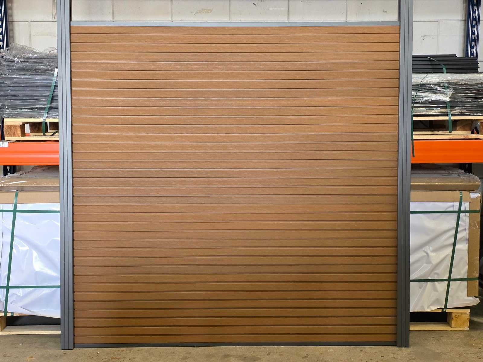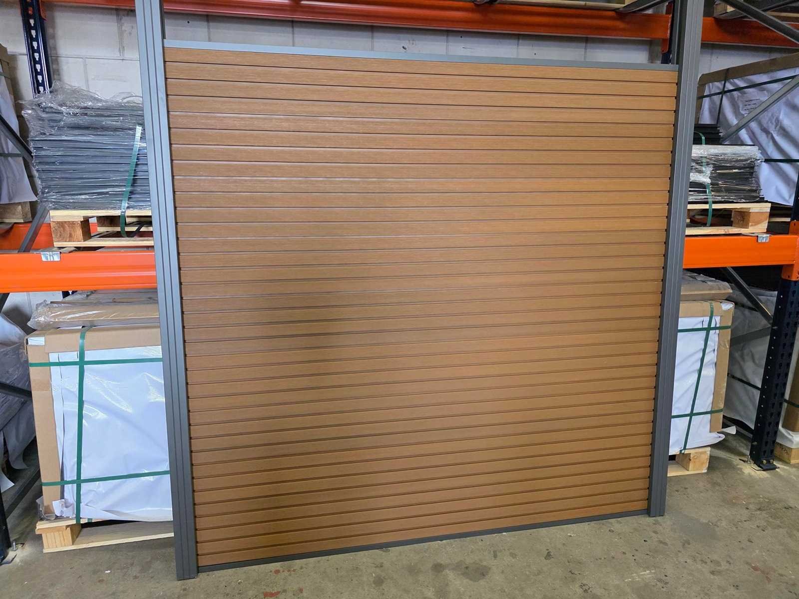 10 schutting delen van ieder 9 planken die in elkaar schuiven (180x180 cm ) , 11 schutting palen van aluminium met schuif systeem, palen moeten vast de grond in. bijhorende beugels voor vastzetten planken, afdek deksels palen, onder en boven aluminium afwerklijst, onderhoud arme schutting! Kleur: Teak