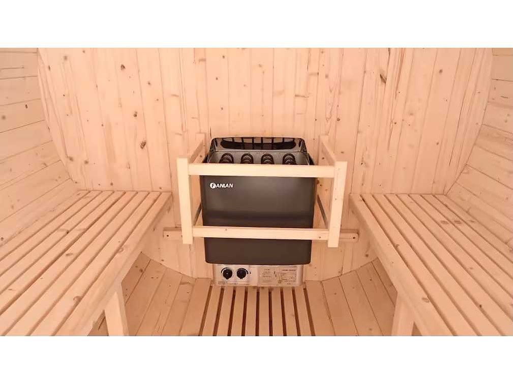 2-4 persoons sauna, inclusief dakbedekking, 4500 Watt, 220 Volt aansluiting, 4,5 Kw interne kachel bediening, explosiebestendig licht, 8 mm transparant gehard glas, houten emmer + schep, ongebruikt in doos. Afmeting kist : 200 x 110 x 82 cm. Gewicht : 300 Kg. Lengte: 150cm Materiaal: Hout