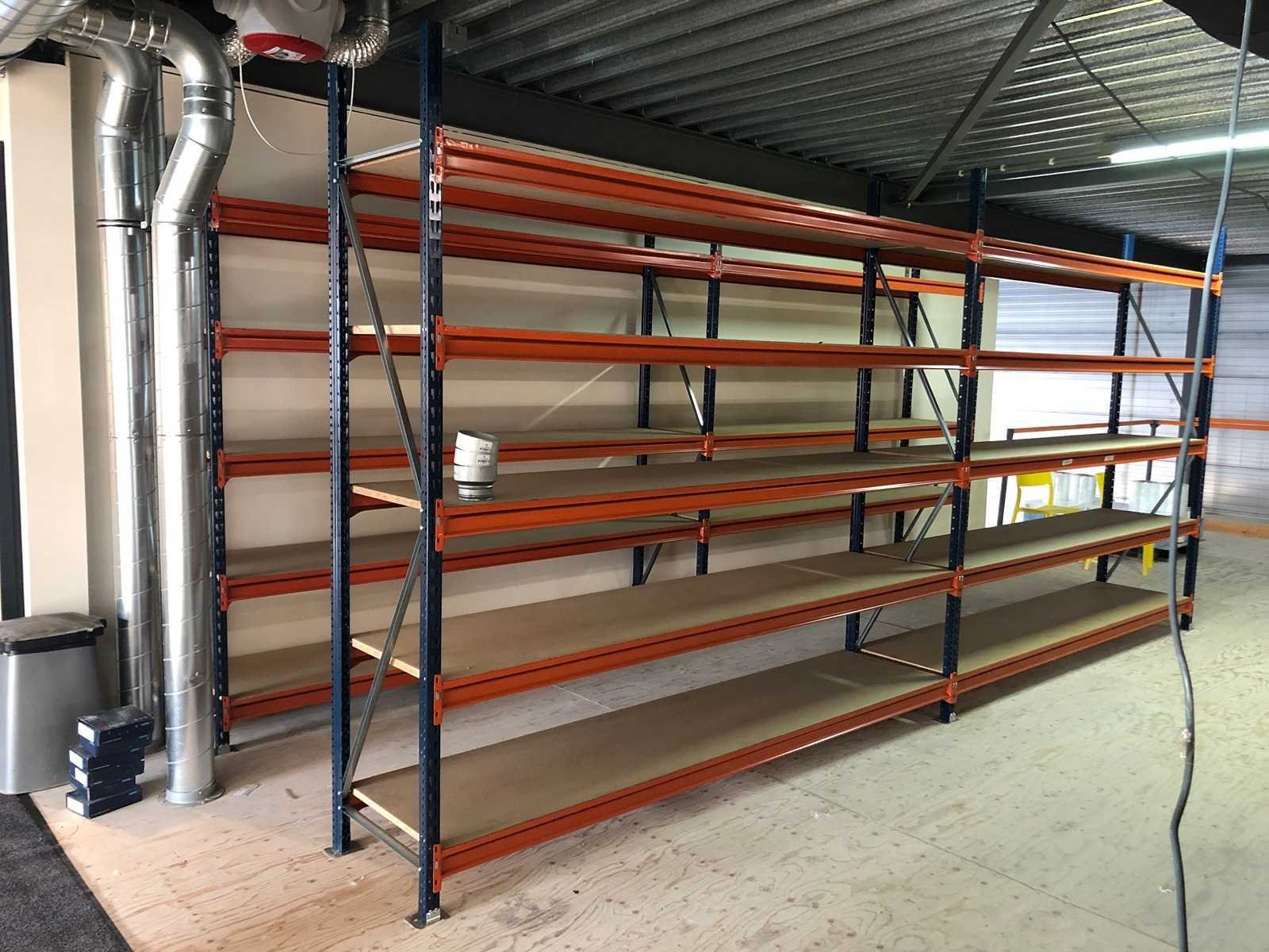 Netjes gebruikt, Gedemonteerd, 1 rij van 380cm lang, lengte liggers 182,5 cm Incl 20 liggers en 10 legborden en 3 staanders Hoogte 250cm , diepte 50cm Merk: Mecalux Aantal staanders: 3 Aantal liggers: 20 Max. sectiebelasting: 800kg Demontabel: true Materiaal: Staal/hout Totale afmeting Hoogte: 250cm Lengte: 380cm Breedte: 50cm Hoogte: 250cm