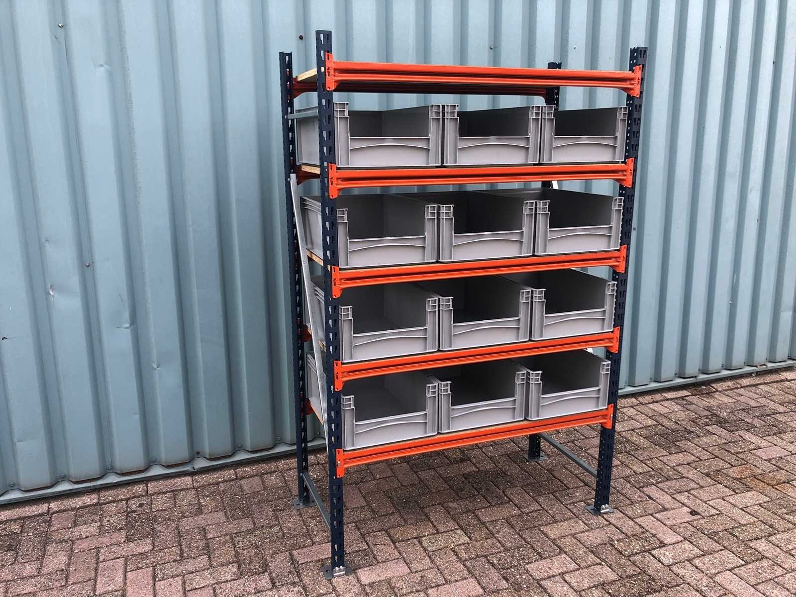 Legbordstellingen incl 12 grijze magazijnbakken. Bakken schoon en ongebruikt Afmeting magazijnbakken 600x400x220 met grijpopening. Stelling totale lengte: 1300mm lang. 2 staanders 2000x600 + 10 liggers + 5 legborden + 12 bakken. Hoogte: 2000mm. Diepte: 600mm. Lengte sectie: 1200mm. Geheel gedemonteerd, klaar om af te halen. Sectie afm. b: 1200mm Aantal staanders: 2 Aantal legborden: 5 Demontabel: true Lengte: 130cm Hoogte: 200cm