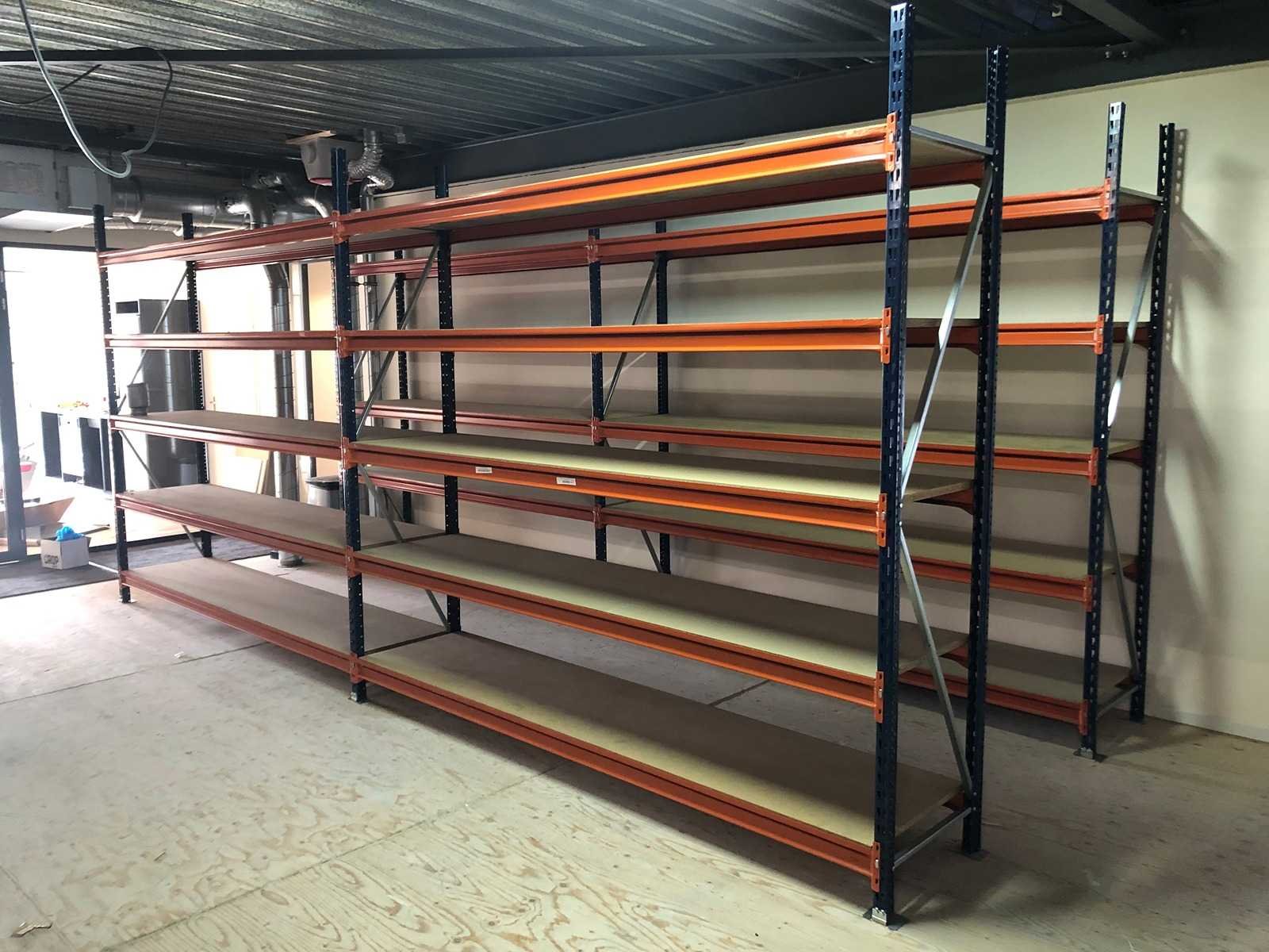Netjes gebruikt, Gedemonteerd, 1 rij van 380cm lang, lengte liggers 182,5 cm Incl 20 liggers en 10 legborden en 3 staanders Hoogte 250cm , diepte 50cm Merk: Mecalux Aantal staanders: 3 Aantal liggers: 20 Max. sectiebelasting: 800kg Demontabel: true Materiaal: Staal/hout Totale afmeting Hoogte: 250cm Lengte: 380cm Breedte: 50cm Hoogte: 250cm