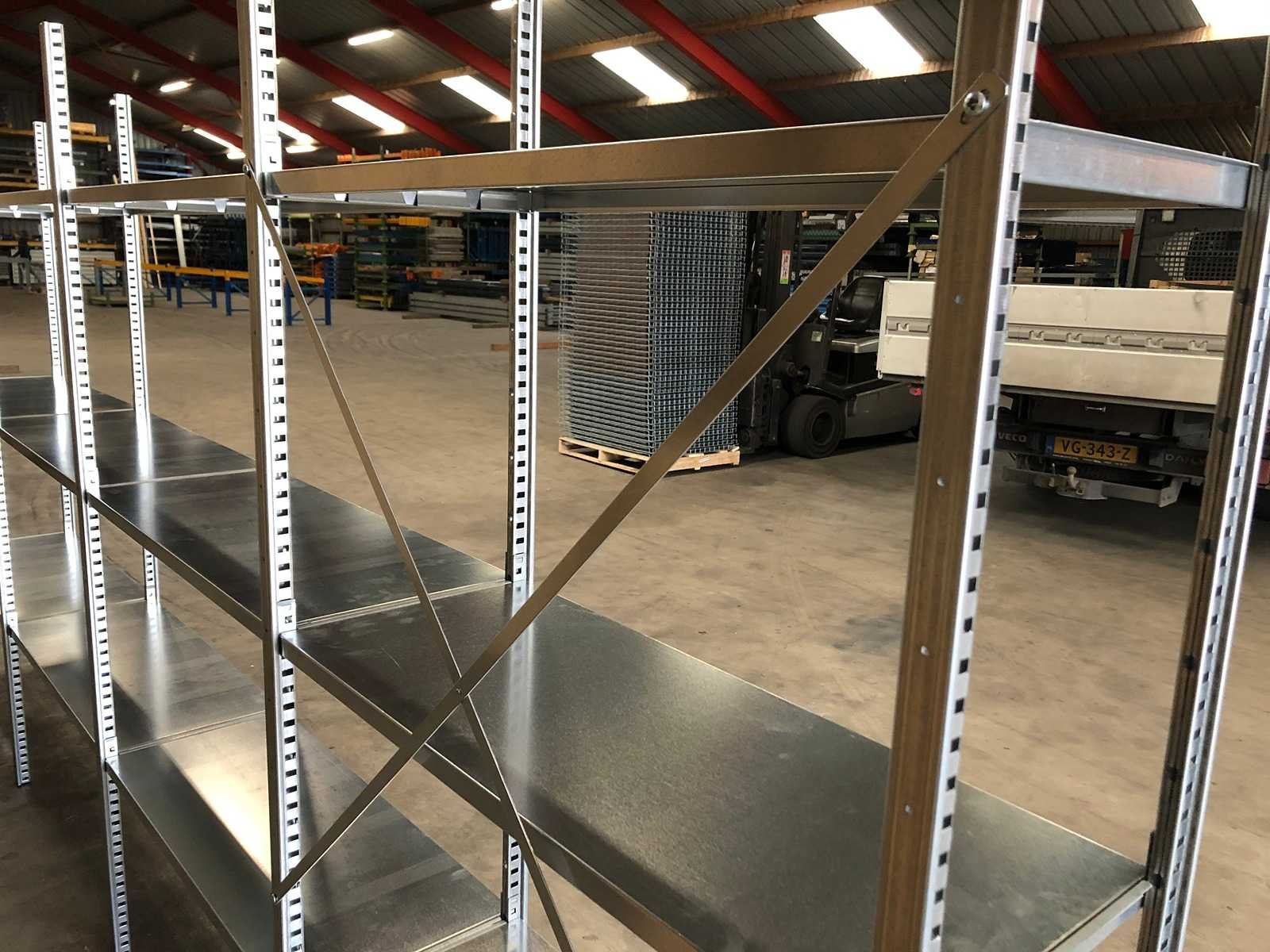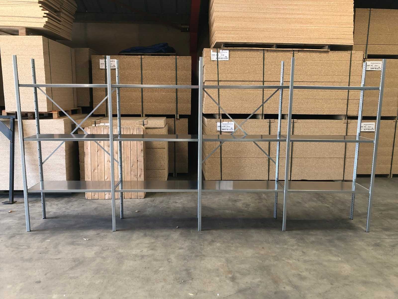 Hoogte 200cm, Diepte 40cm, Bestaat uit: 10 stijlen 200cm + 24 dragers 40cm + 12 legborden 98x40cm + 10 voetdoppen Netto maat tussen de staanders: 96.5cm breed per vak. ( 4 vakken ) Totale lengte 404cm lang gedemonteerd Merk: GS3 Sectie diepte: 96.5mm Aantal staanders: 10 Aantal legborden: 12 Demontabel: true Materiaal: Staal / Verzinkt Lengte: 404cm Breedte: 40cm Hoogte: 200cm