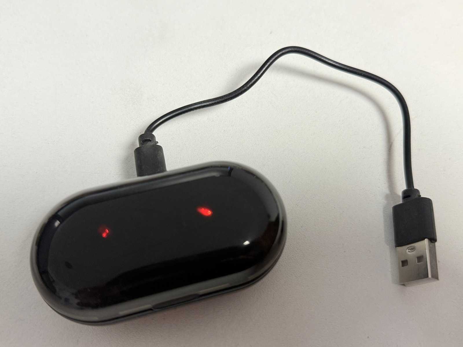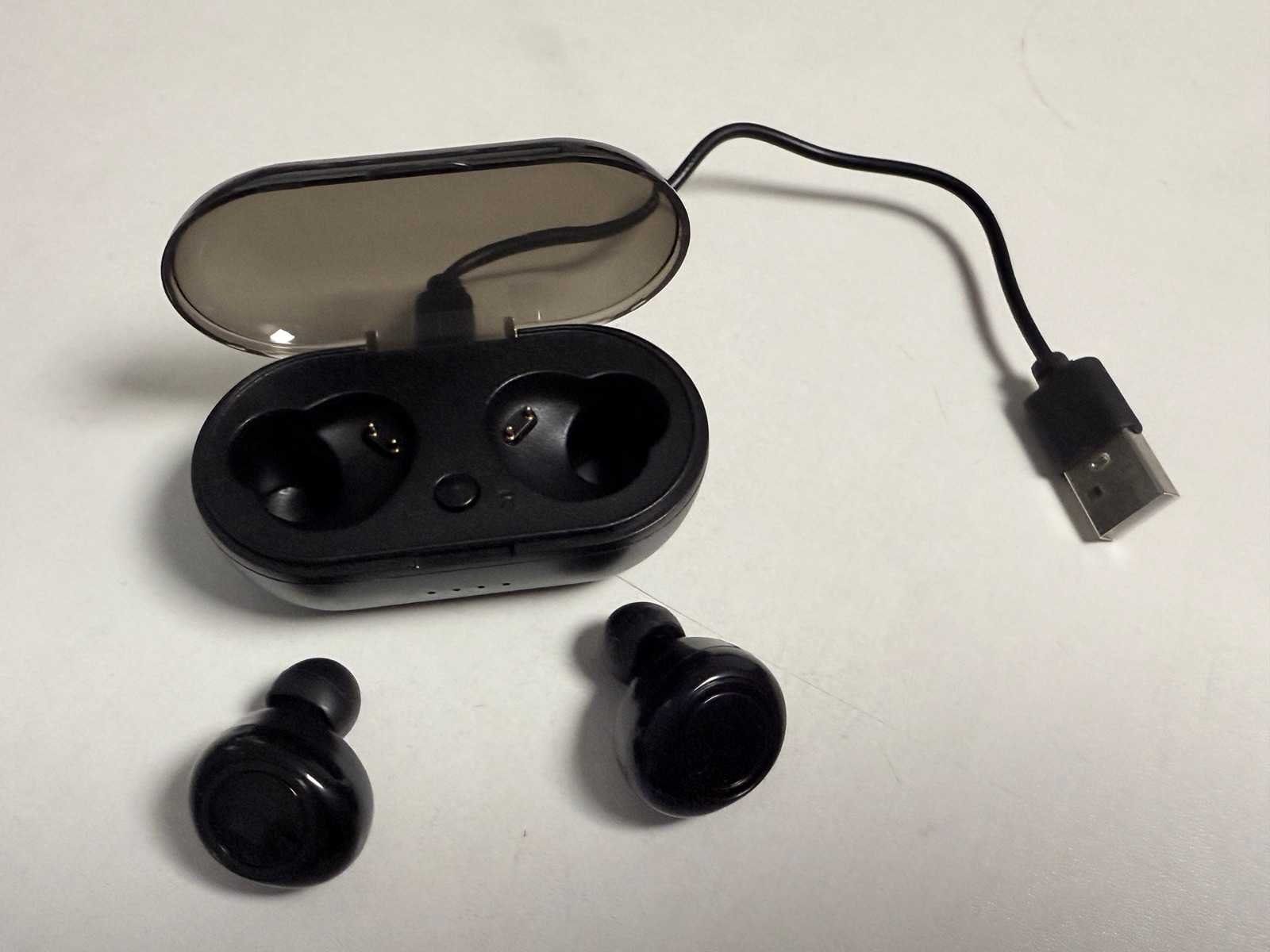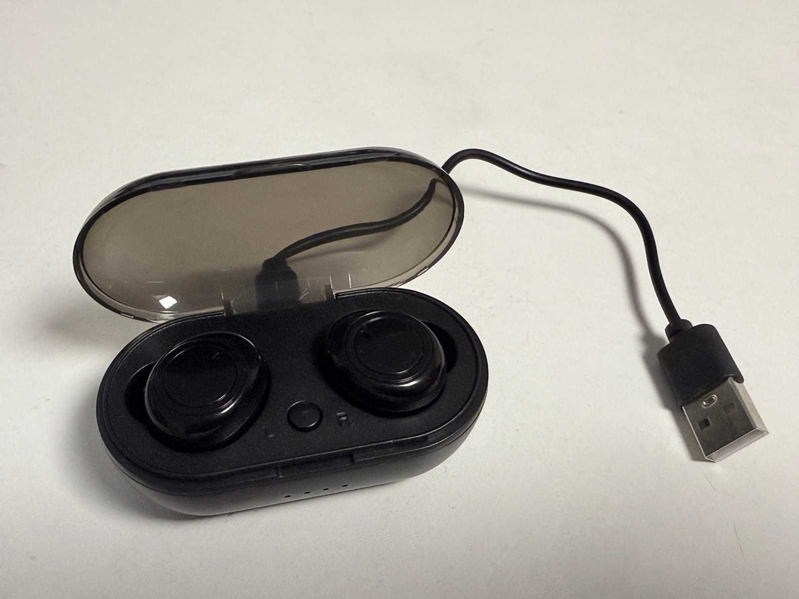 Draadloze oortjes. Op te laden middels USB in de houder.