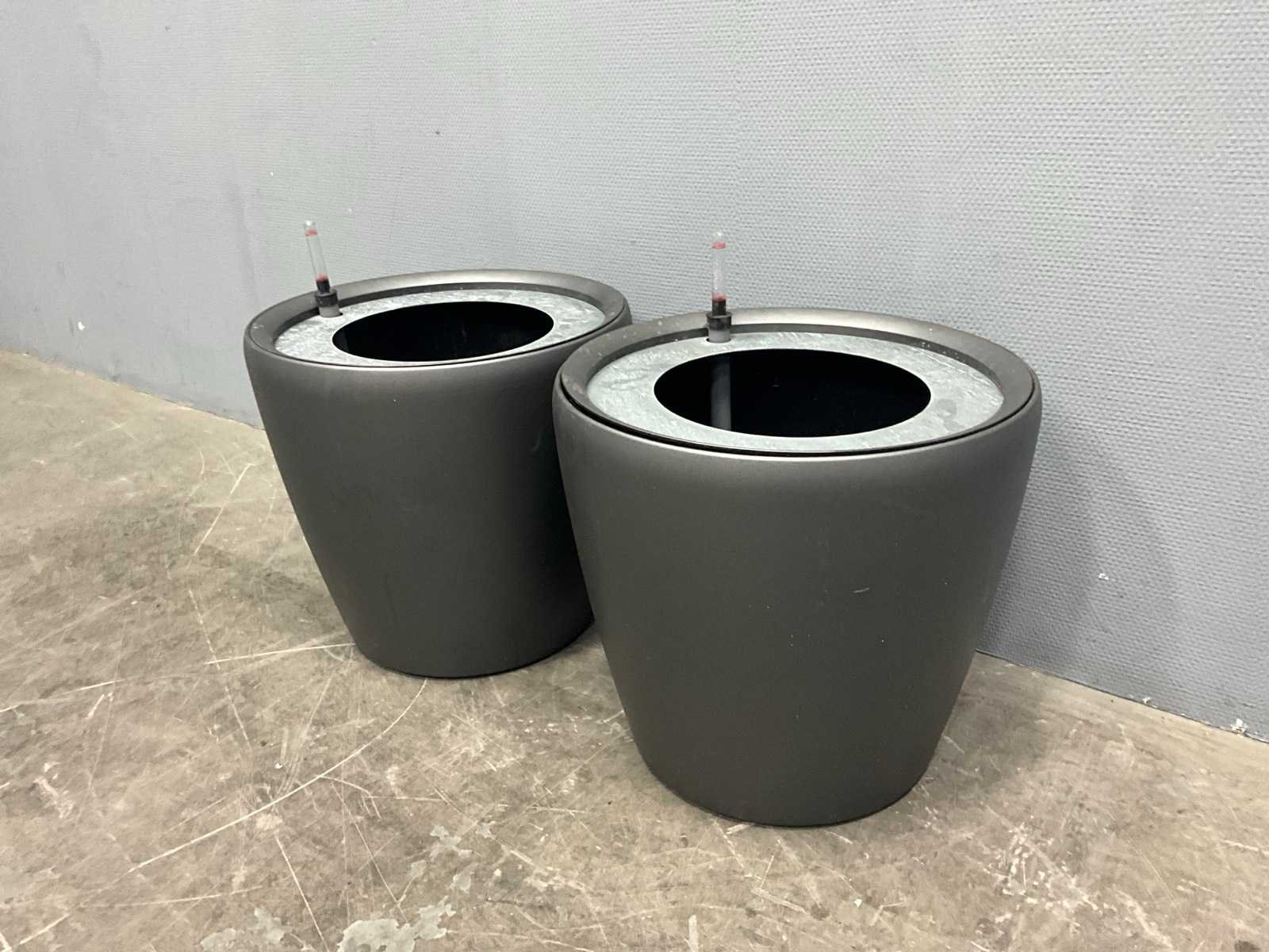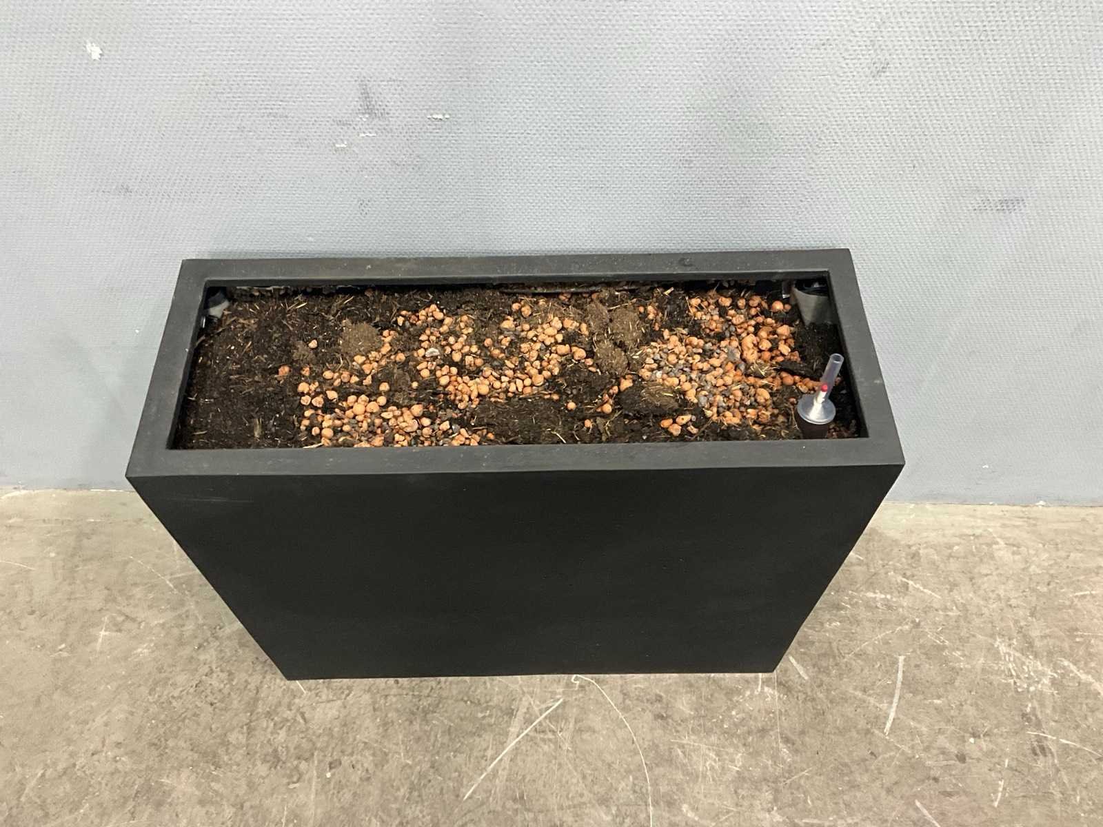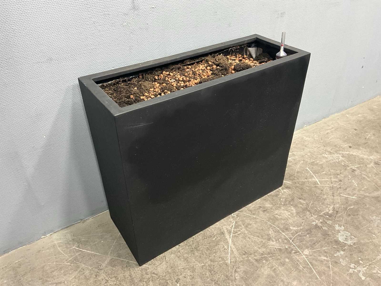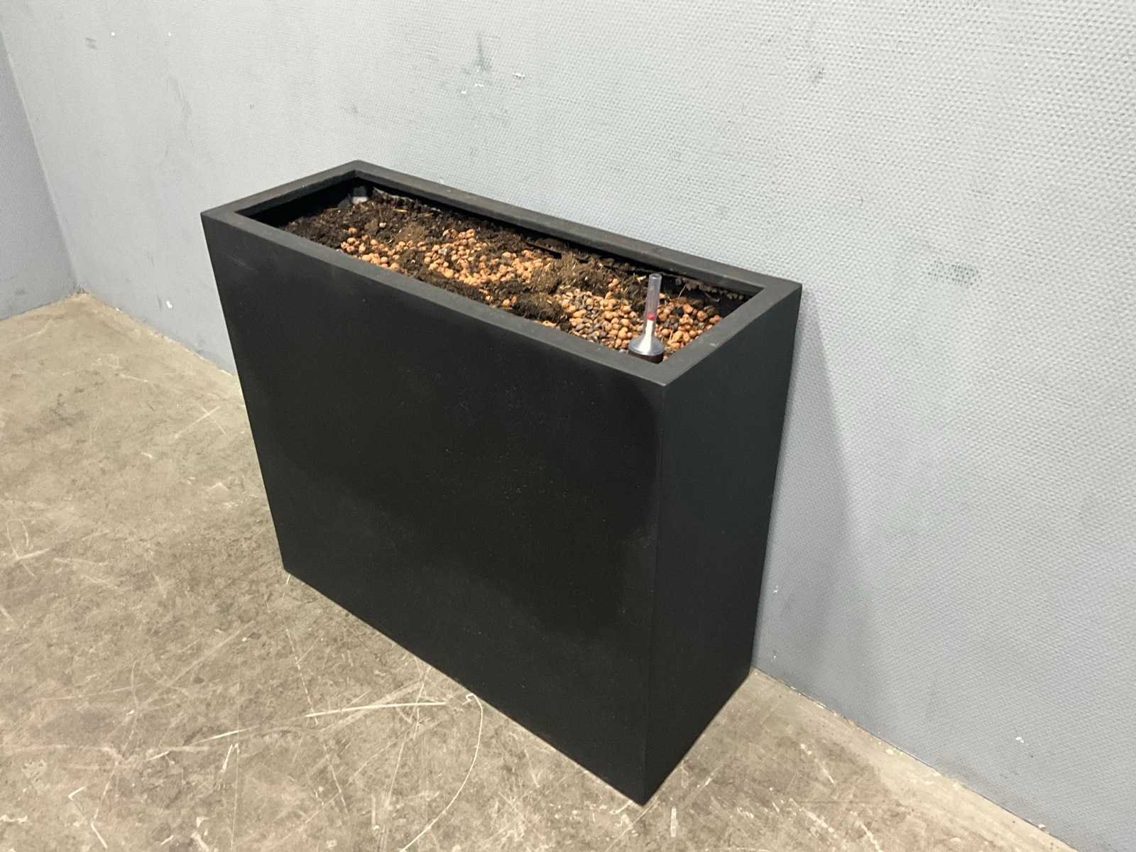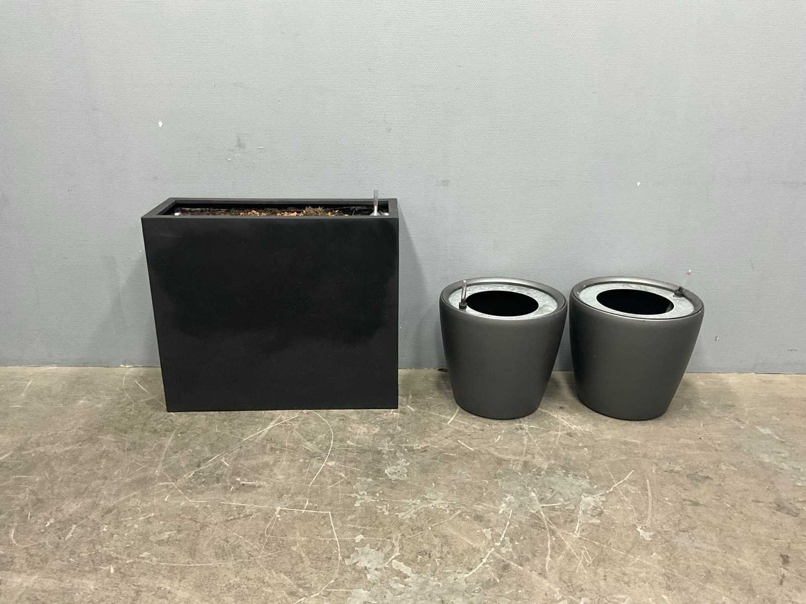 Afmetingen zwarte plantenbak: 79,5x30x60 cm; afmetingen ronde plantenbak: 43x40 cm; Kleur: Zwart/Grijs