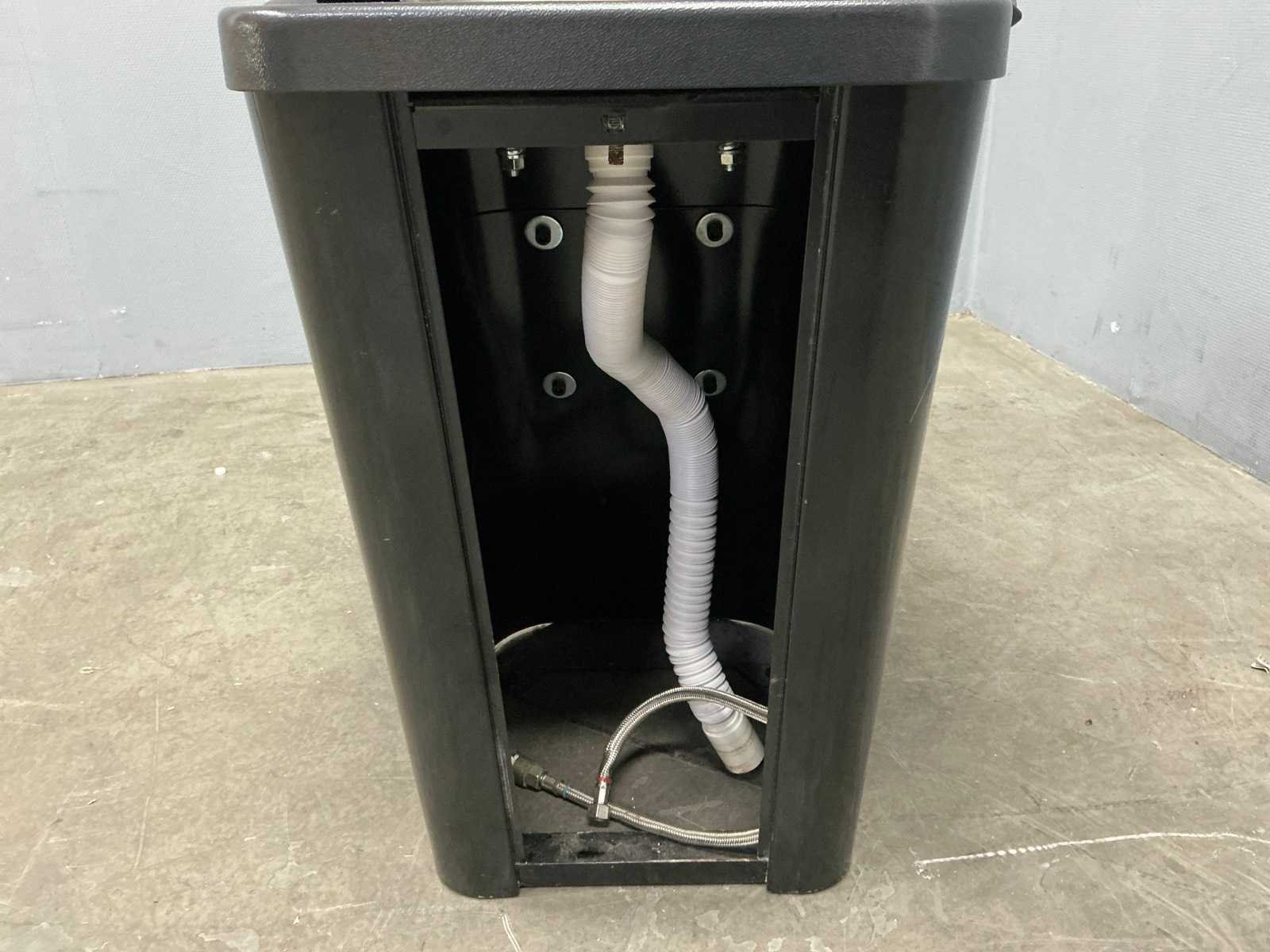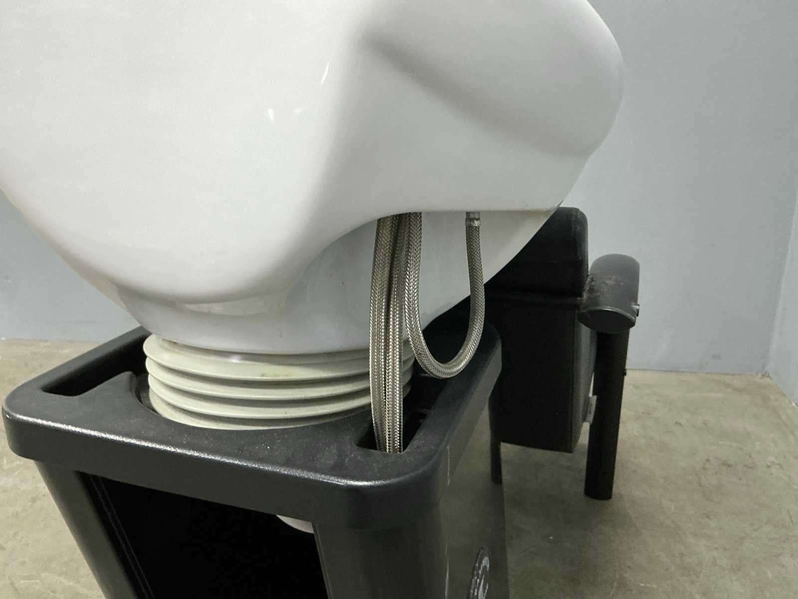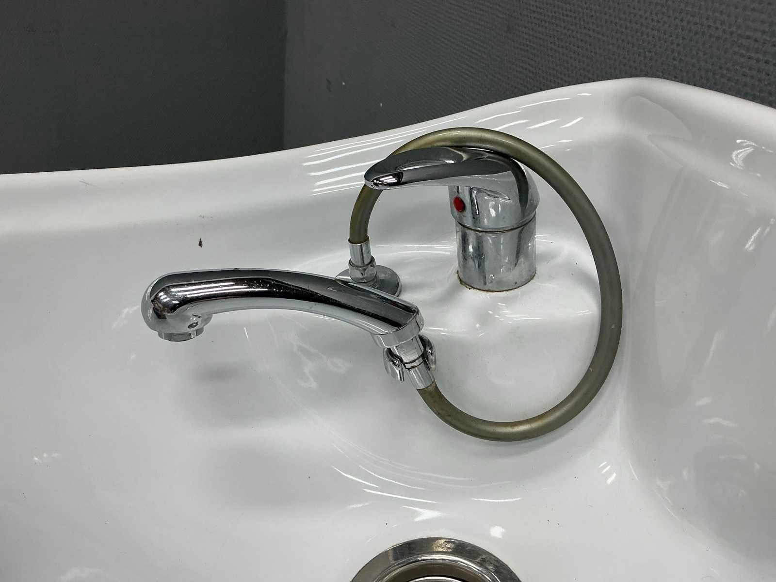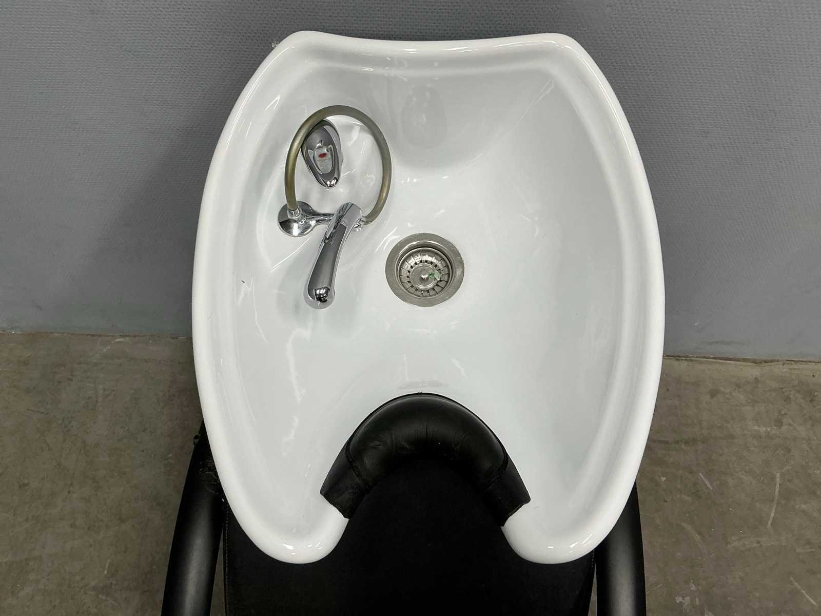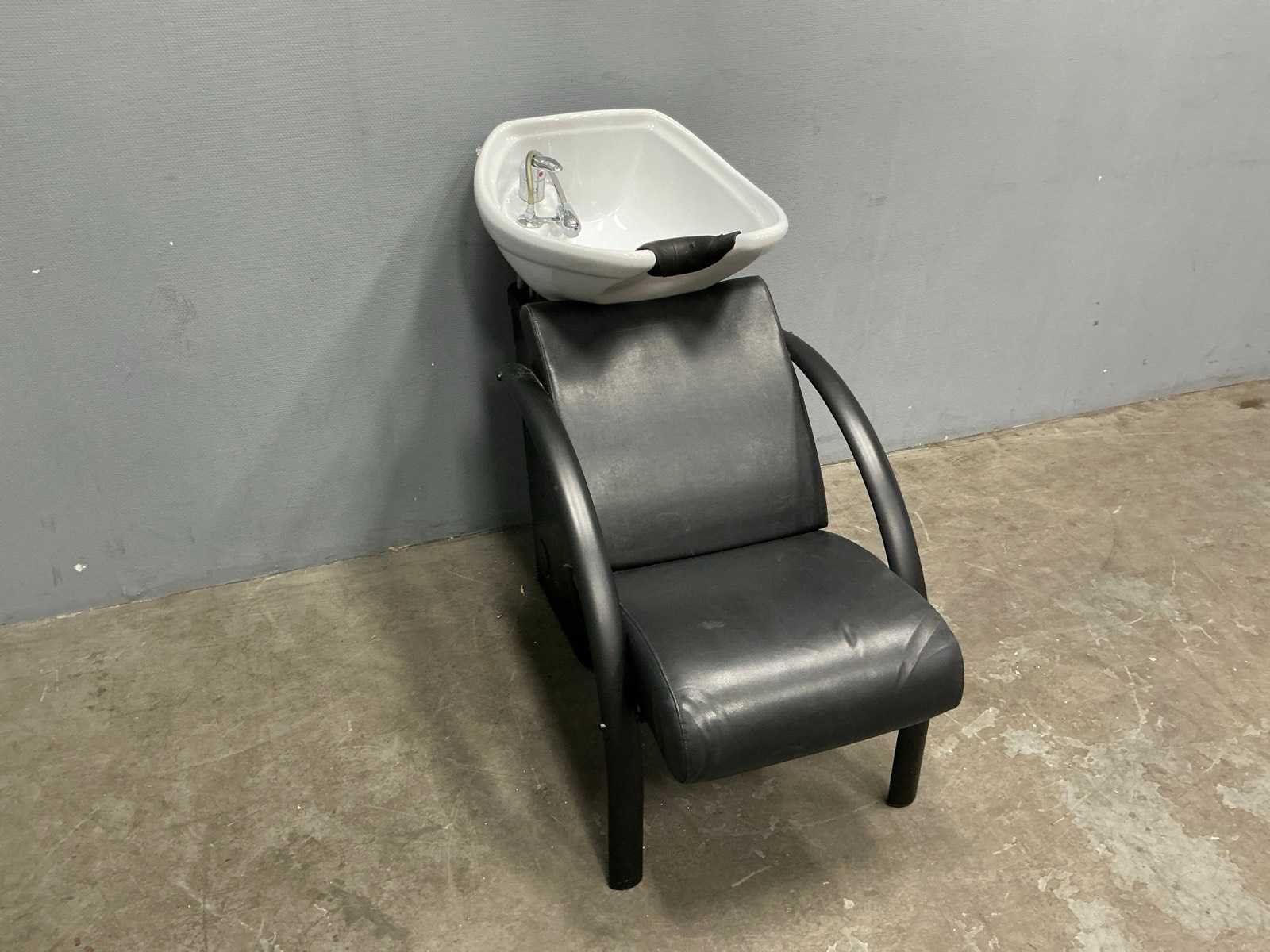 Stoel;waskom;waskraan met toebehoren, rechterarm steun beschadigd Merk: Salon ambience Model: Dreamwash Kleur: Zwart,Wit Lengte: 120cm Breedte: 60cm Hoogte: 102cm Zithoogte: 45cm