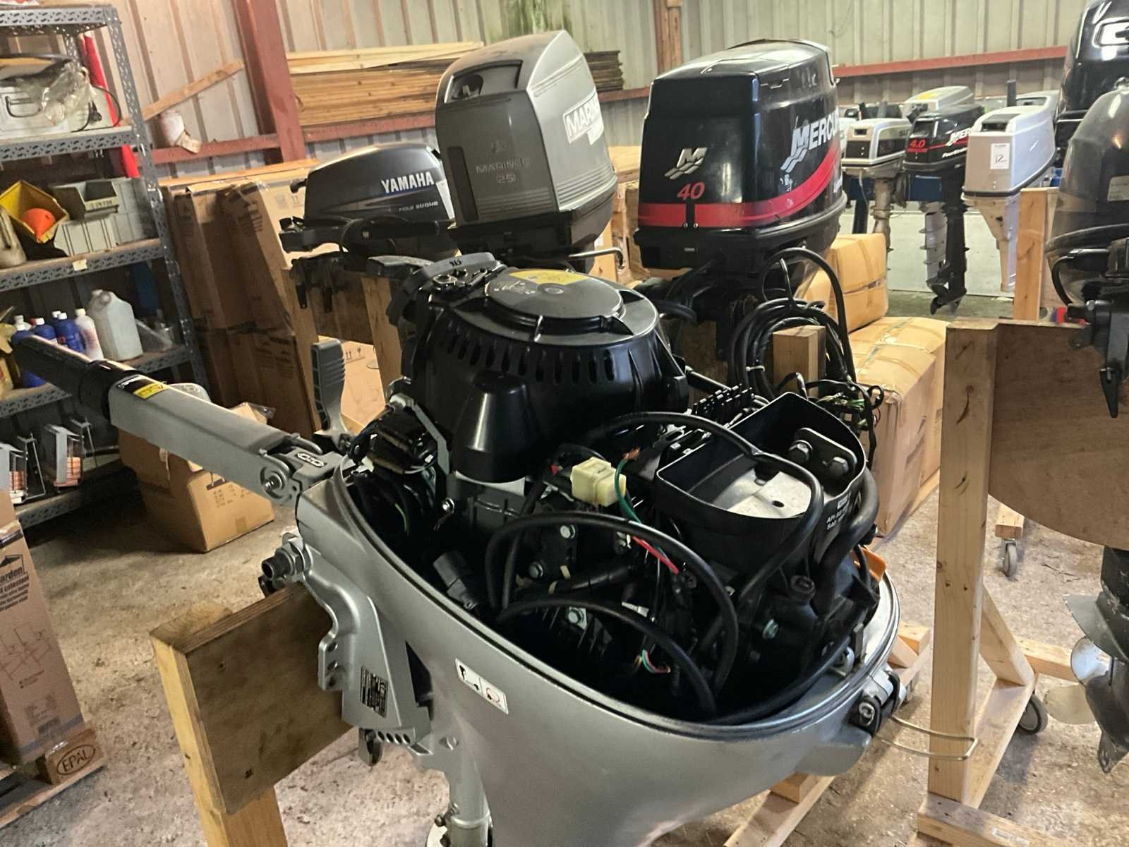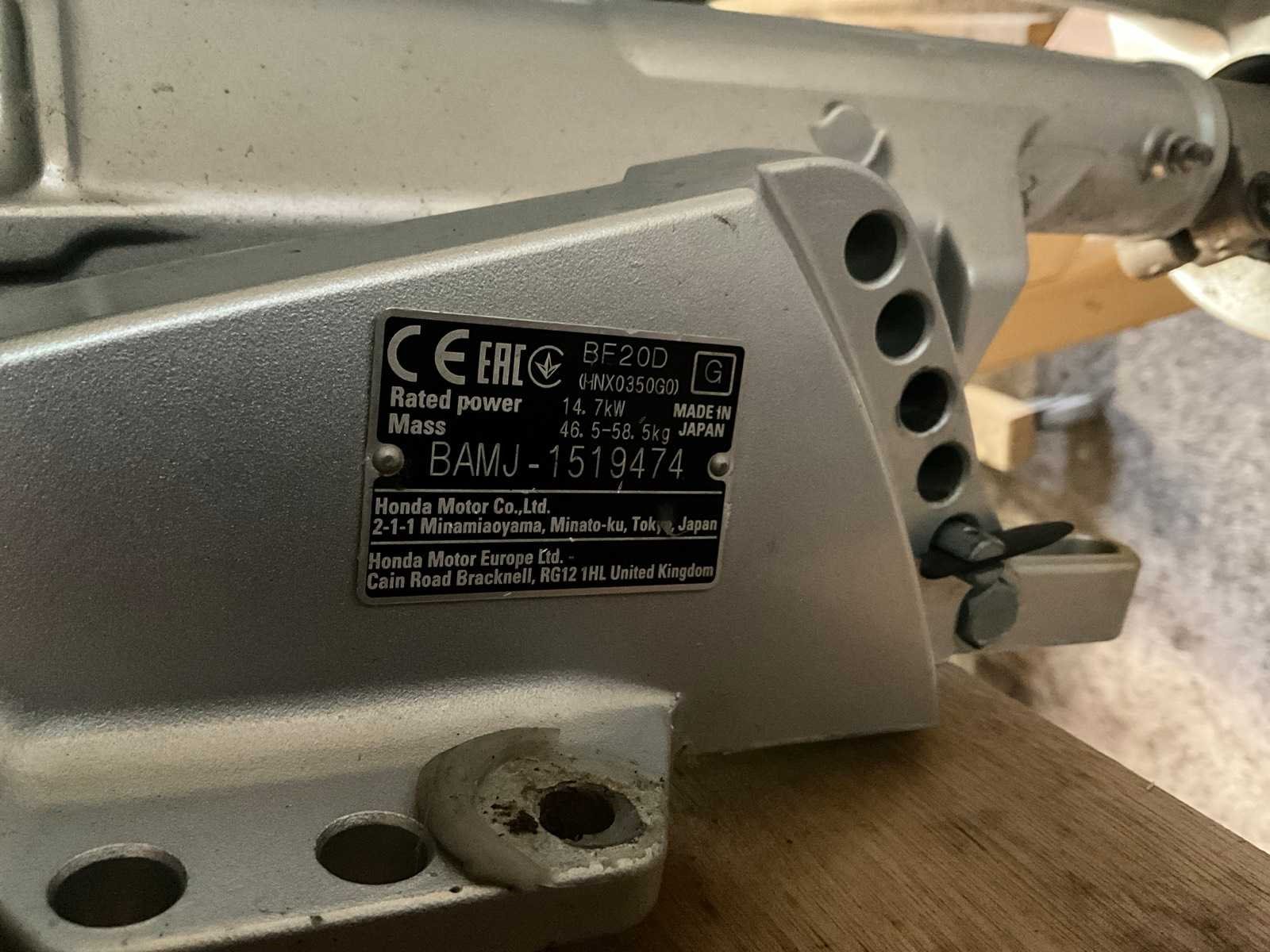 Voorzien van knuppel bediening, trekstart, hydro foil, bouwjaar Merk: Honda Type: BF20D Brandstof: Benzine Vermogen (pk): 20hp Kleur: Grijs