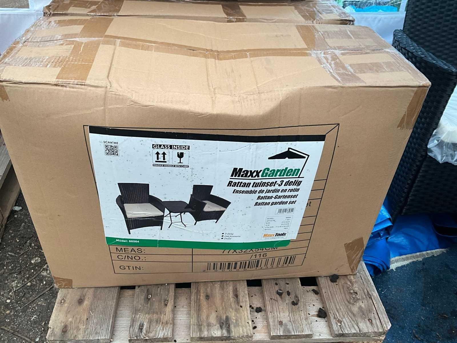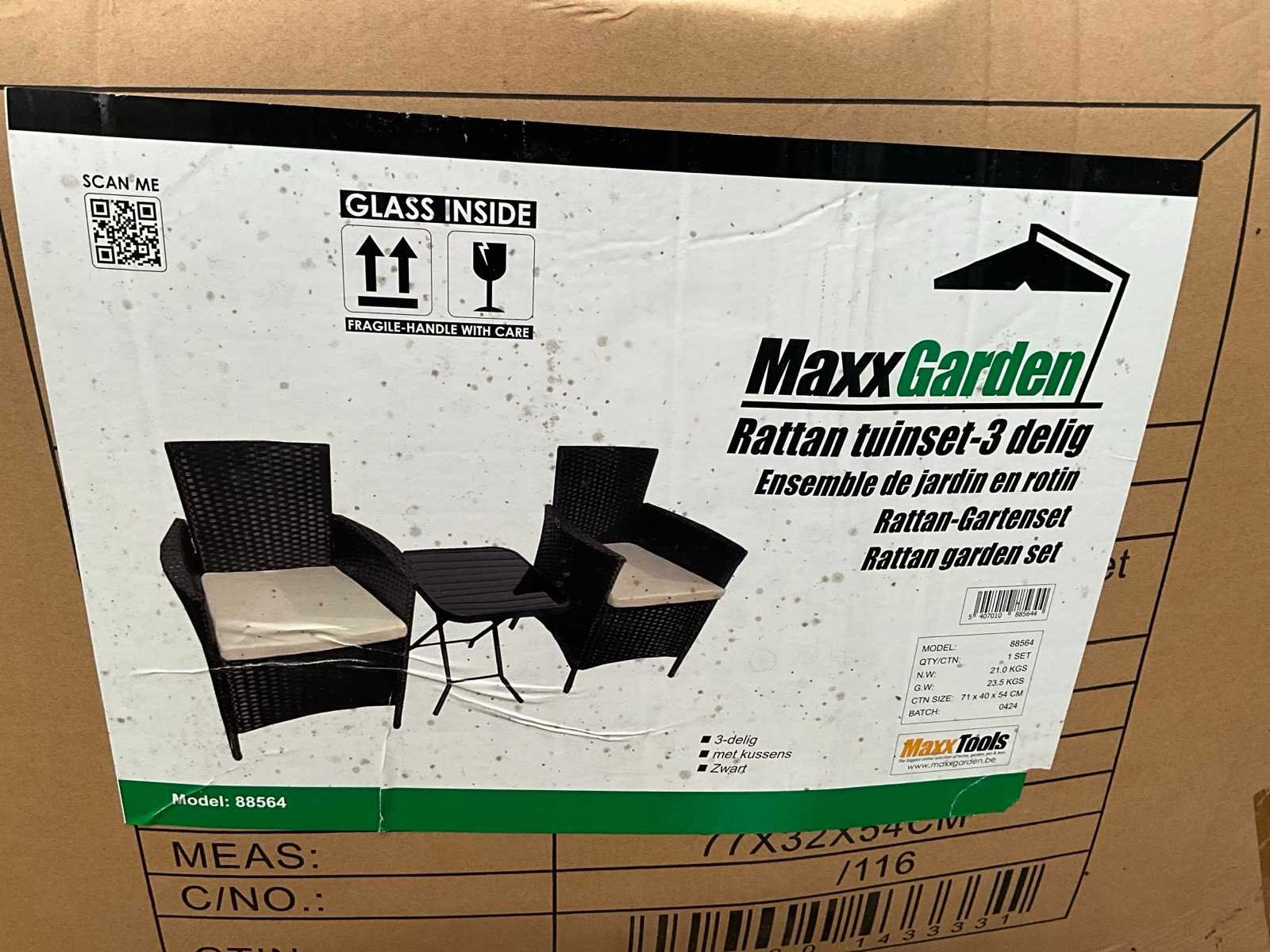 Set bestaande uit 2x stoel 1x tafel Merk: MaxxGarden Model: Rattan tuinset Kussens: true Kleur: Zwart Breedte: 59cm Hoogte: 80cm Zithoogte: 50 Materiaal: Kunststof