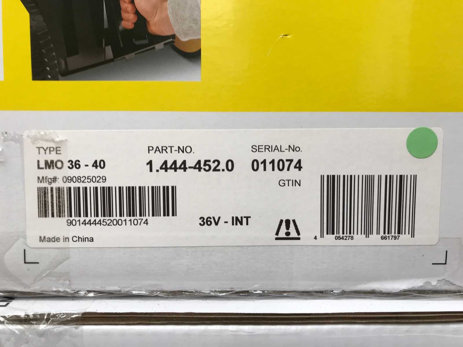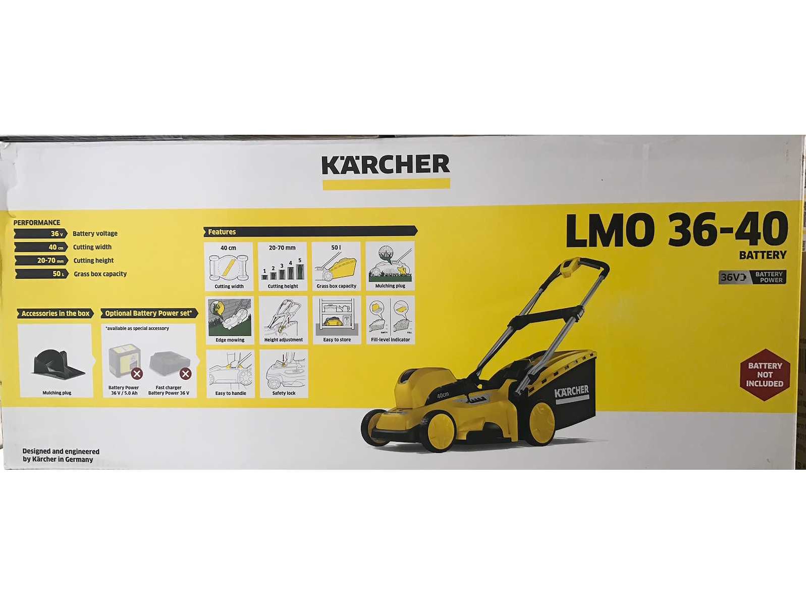 Product zit ongebruikt in de originele verpakking excl. accu Merk: Kärcher Type: LMO 36-40 Serienummer: 4054278661797 Loopmaaier: true Eigen gewicht: 18.6kg
