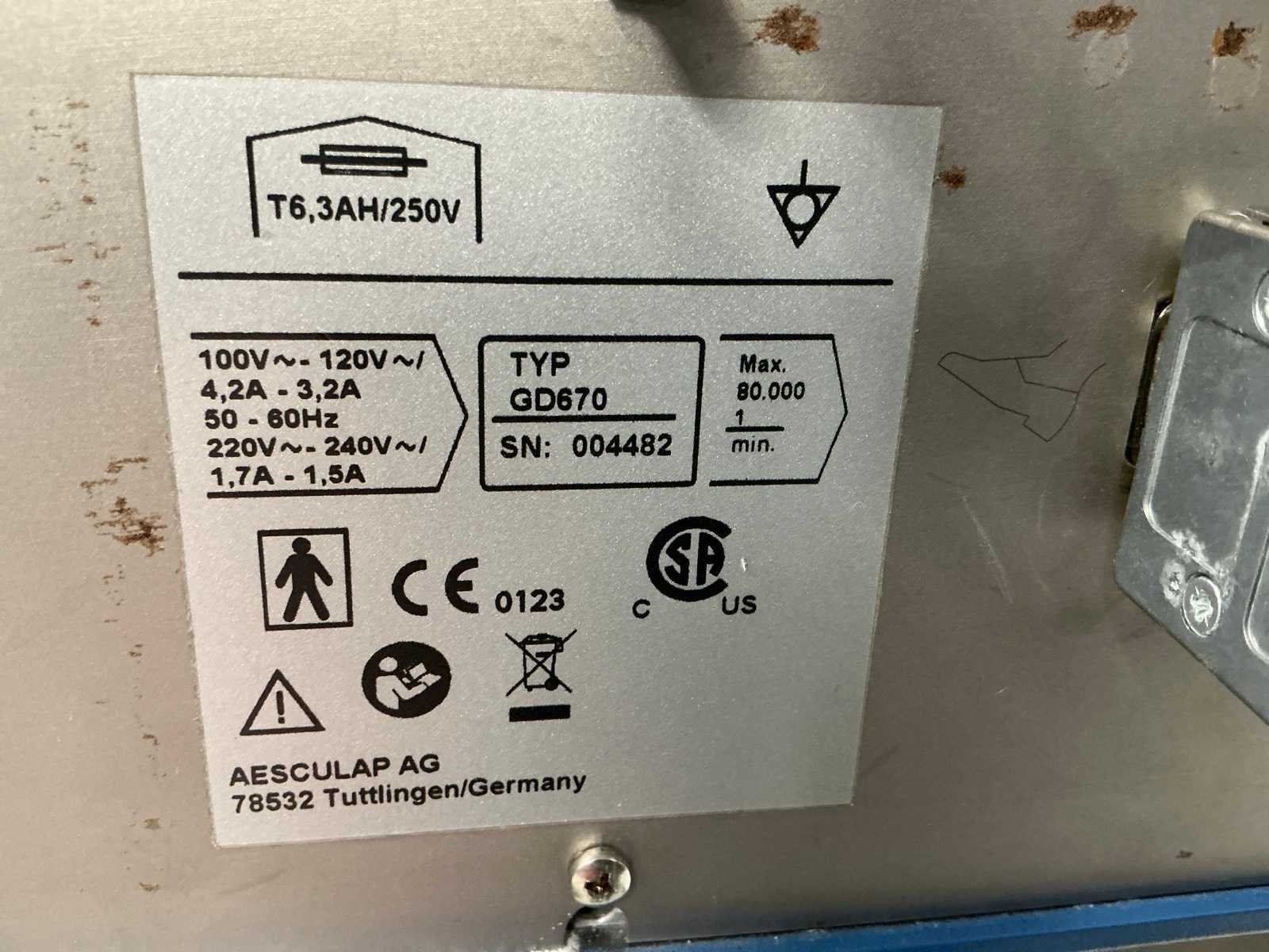 Incl. voetpedaal Merk: Aesculap Type: GD670 Serienummer: 004482 Aansluiting: 230V