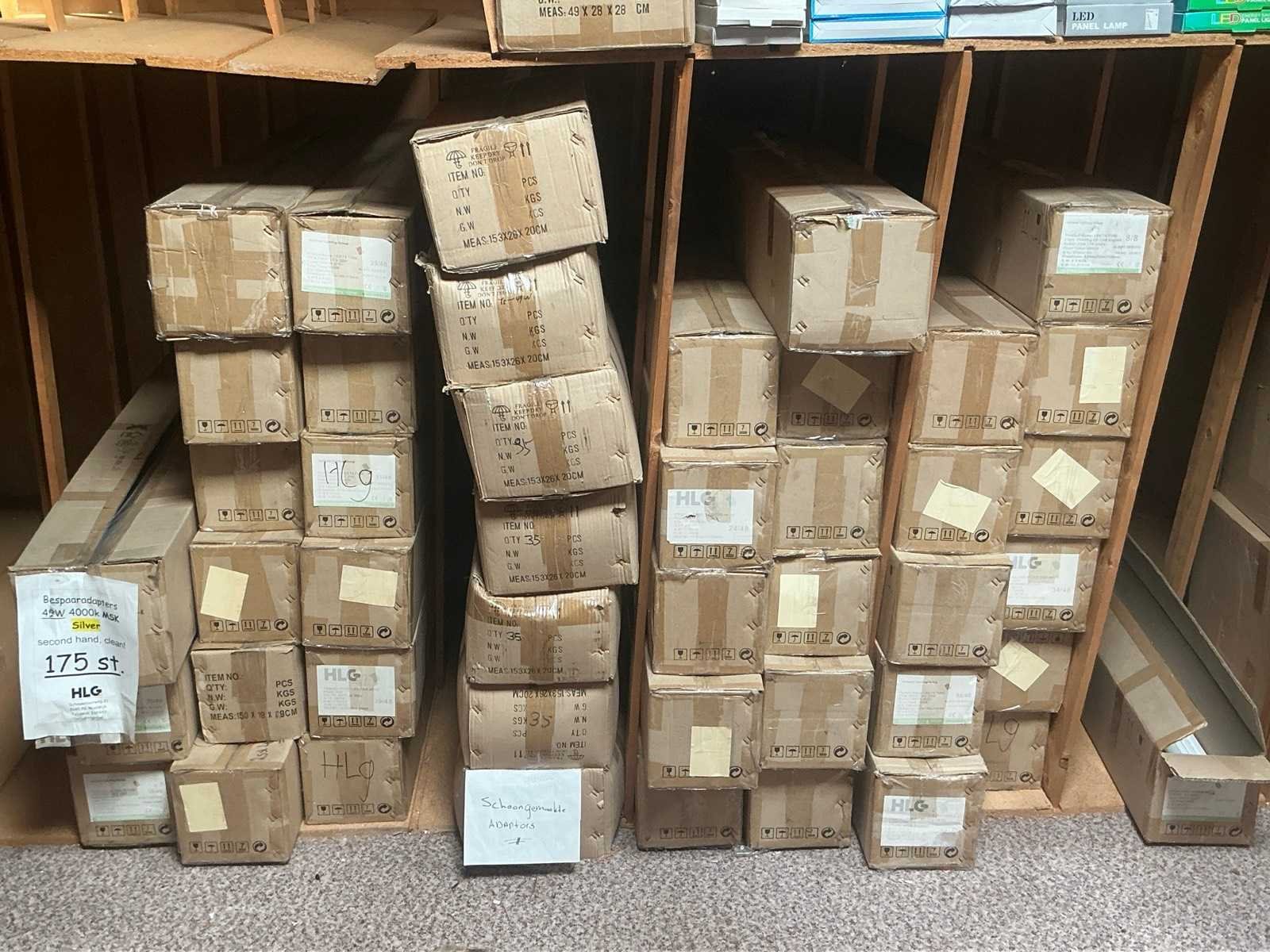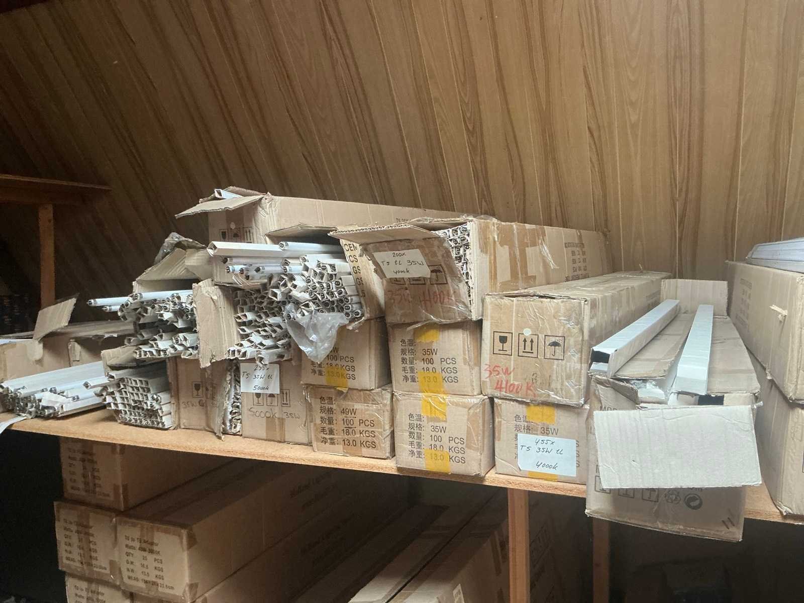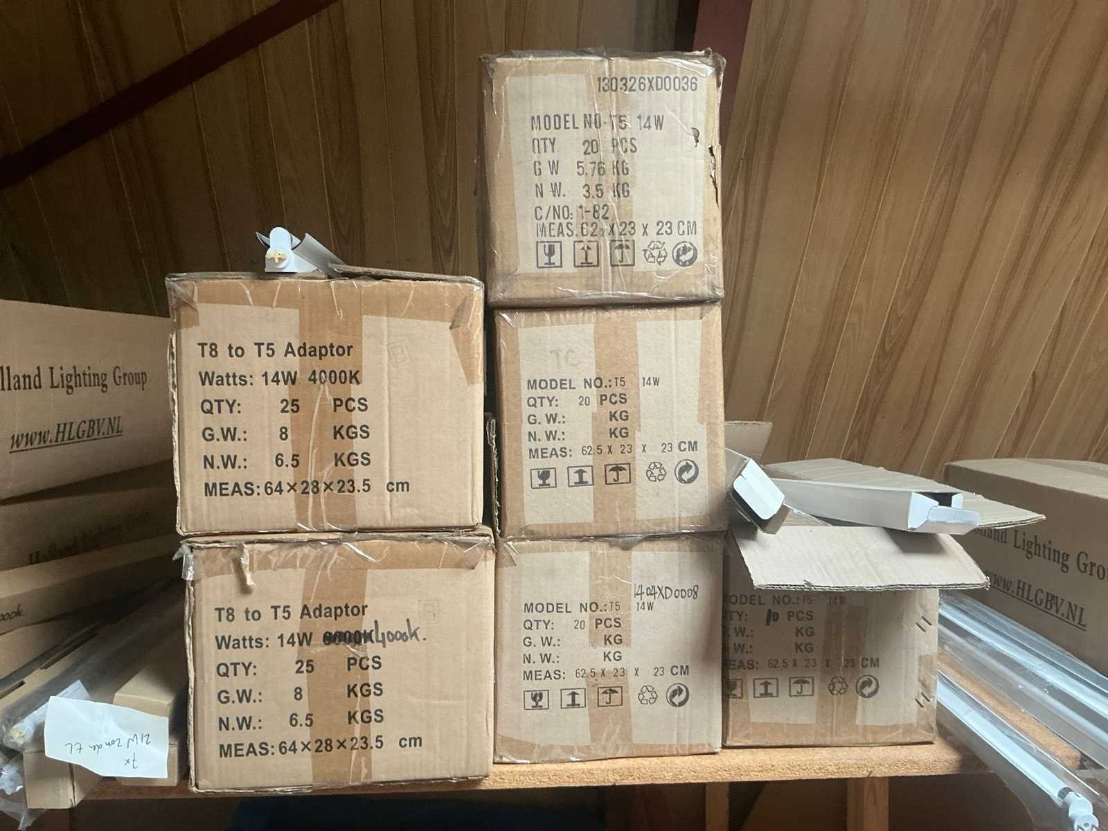 Totaal circa 200 omdozen met diverse TL verlichting, circa 400 losse items verpakt. Totaal circa 8500 stuks verlichting. Bestaande uit: Partij led verlichting en spots 1e: Led panel 2e: HLG profiled TL diverse modellen 3e: 6x led spot 2x140W 4e: Spat waterdichte armaturen XP5228AL-A (48 stuks) 5e: Adapters T8-T5 49W 35W 6e: TL buis led 35W en 49W 7e: Ledpanel rond 15W en 18W 8e: Diverse kinderlampen 9e: Diverse led spots 10e: Led dome lampen 11e: Led tubes diverse maten