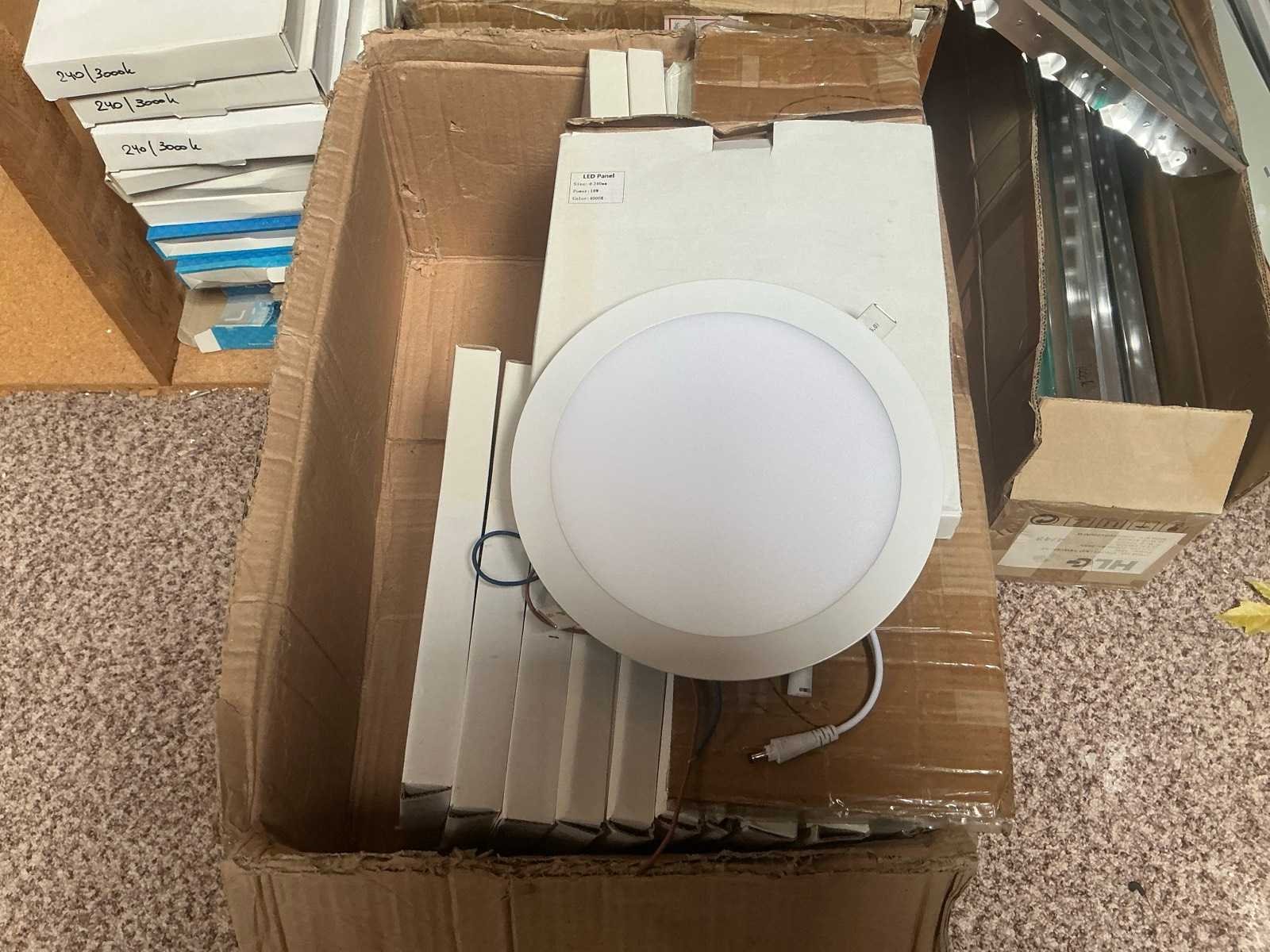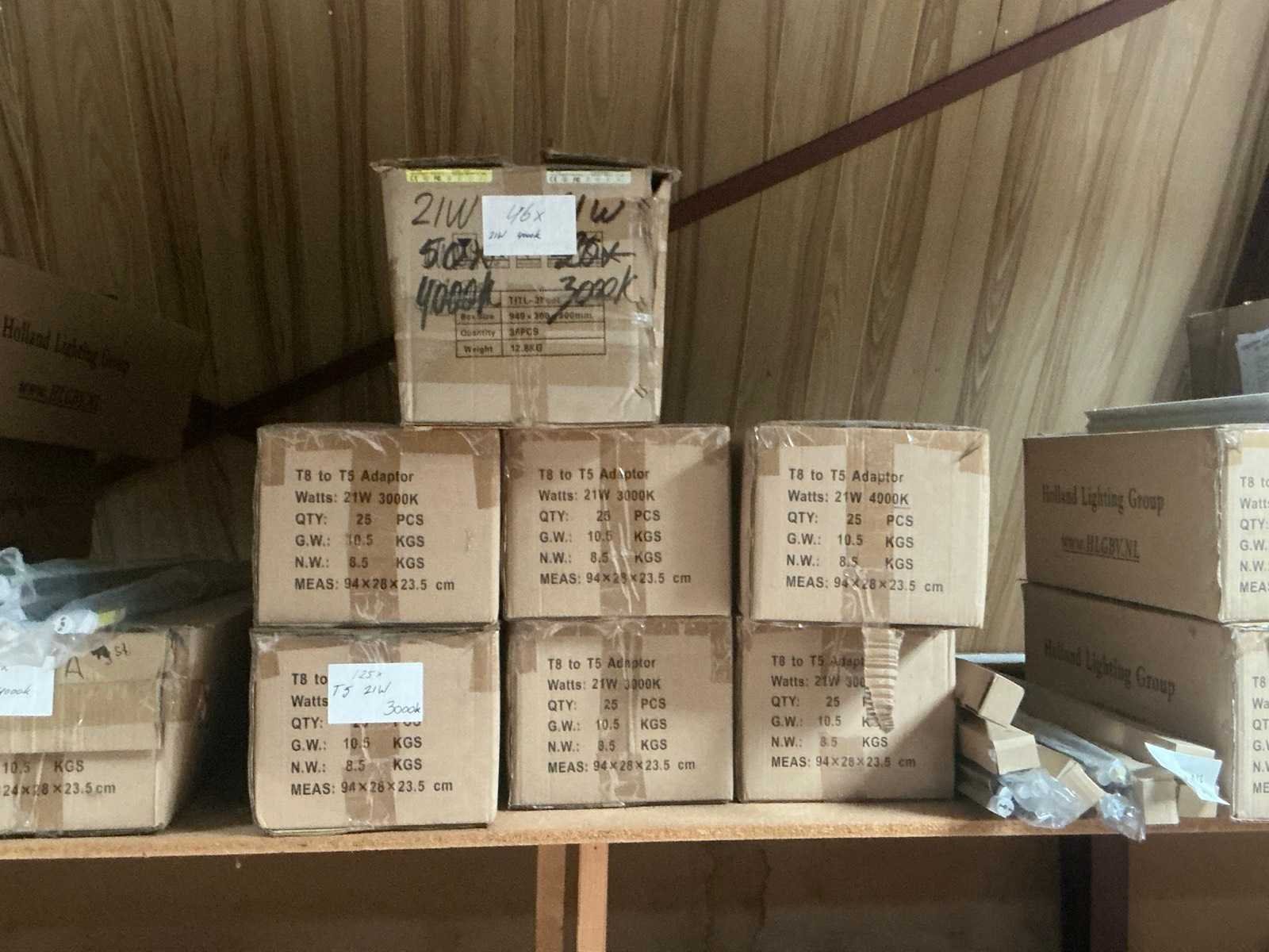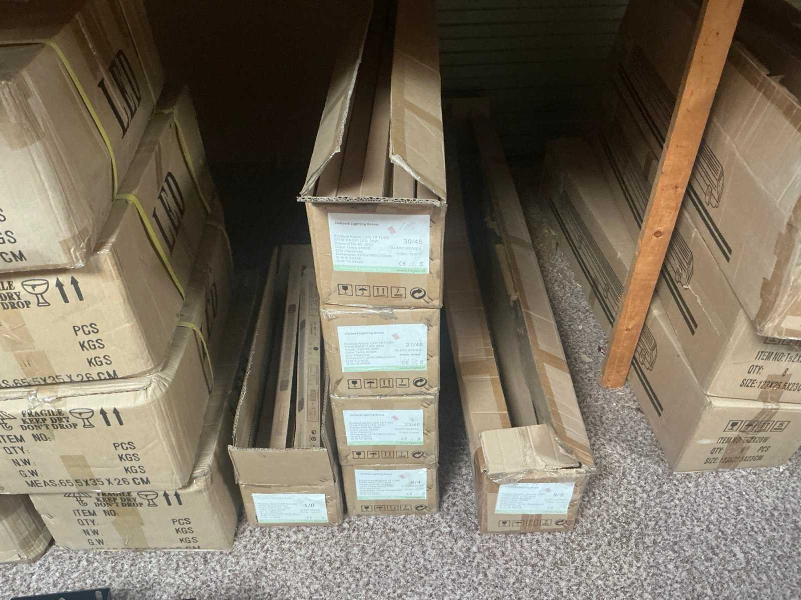 Totaal circa 200 omdozen met diverse TL verlichting, circa 400 losse items verpakt. Totaal circa 8500 stuks verlichting. Bestaande uit: Partij led verlichting en spots 1e: Led panel 2e: HLG profiled TL diverse modellen 3e: 6x led spot 2x140W 4e: Spat waterdichte armaturen XP5228AL-A (48 stuks) 5e: Adapters T8-T5 49W 35W 6e: TL buis led 35W en 49W 7e: Ledpanel rond 15W en 18W 8e: Diverse kinderlampen 9e: Diverse led spots 10e: Led dome lampen 11e: Led tubes diverse maten