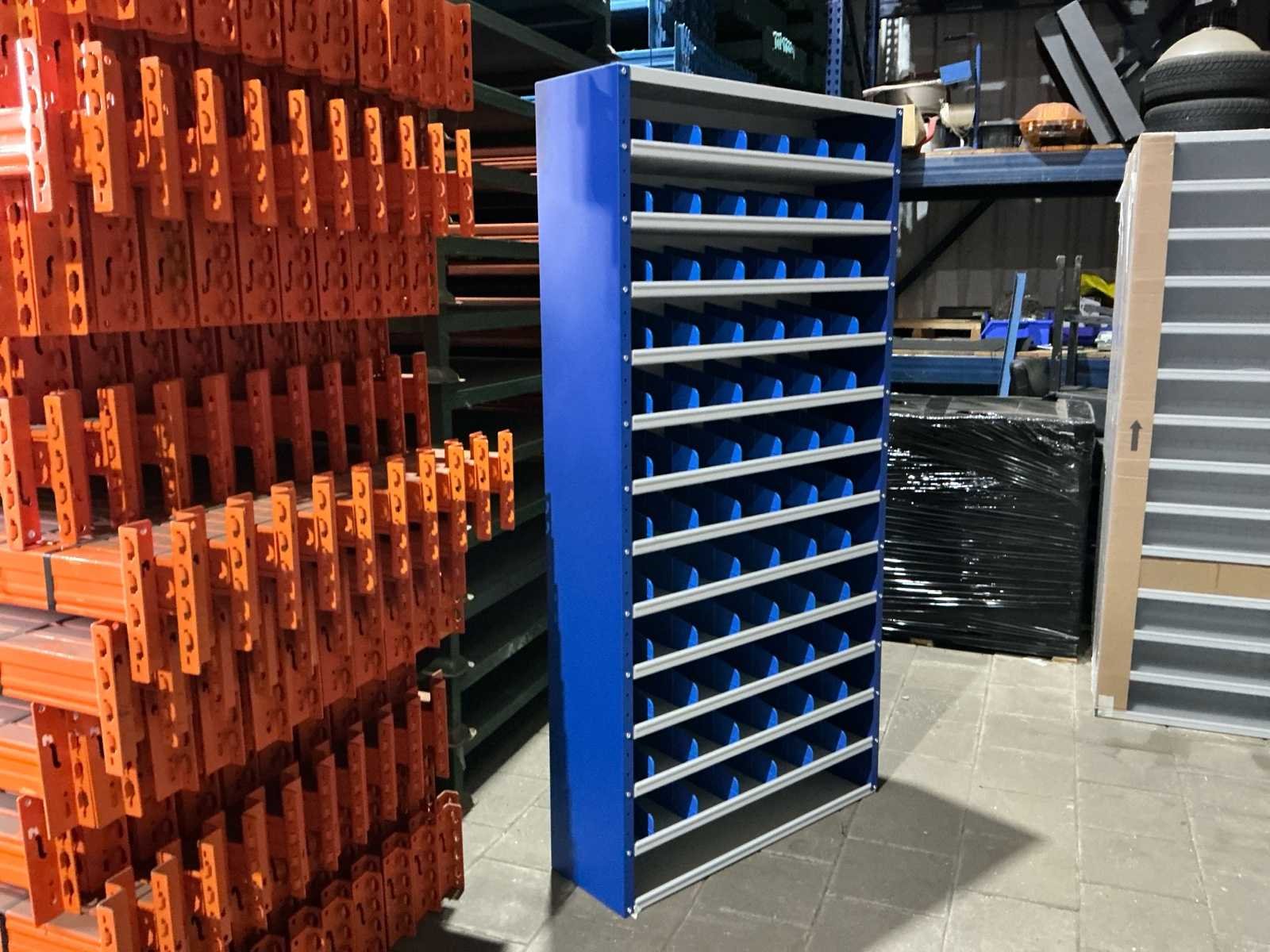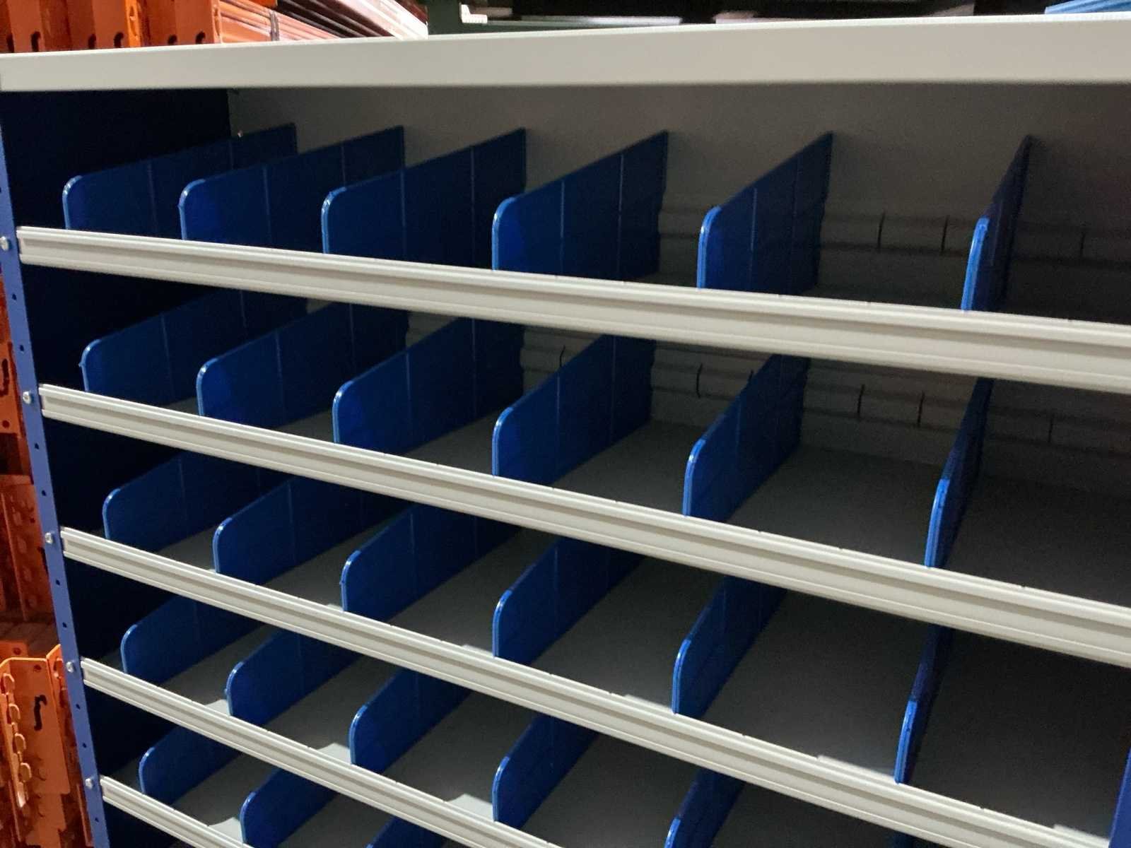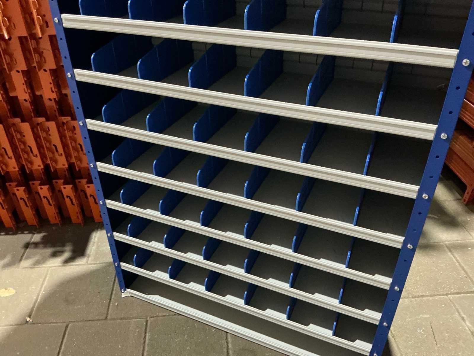 Voorzien van: nieuwe kast. 6 tussen tussen schotjes per lade 72 in totaal. Staal poedercoat. Merk: Povag Product type: Magazijnkast Aantal laden: 13 Kleur: Blauw Lengte: 30 Breedte: 100cm Hoogte: 198cm Materiaal: Staal