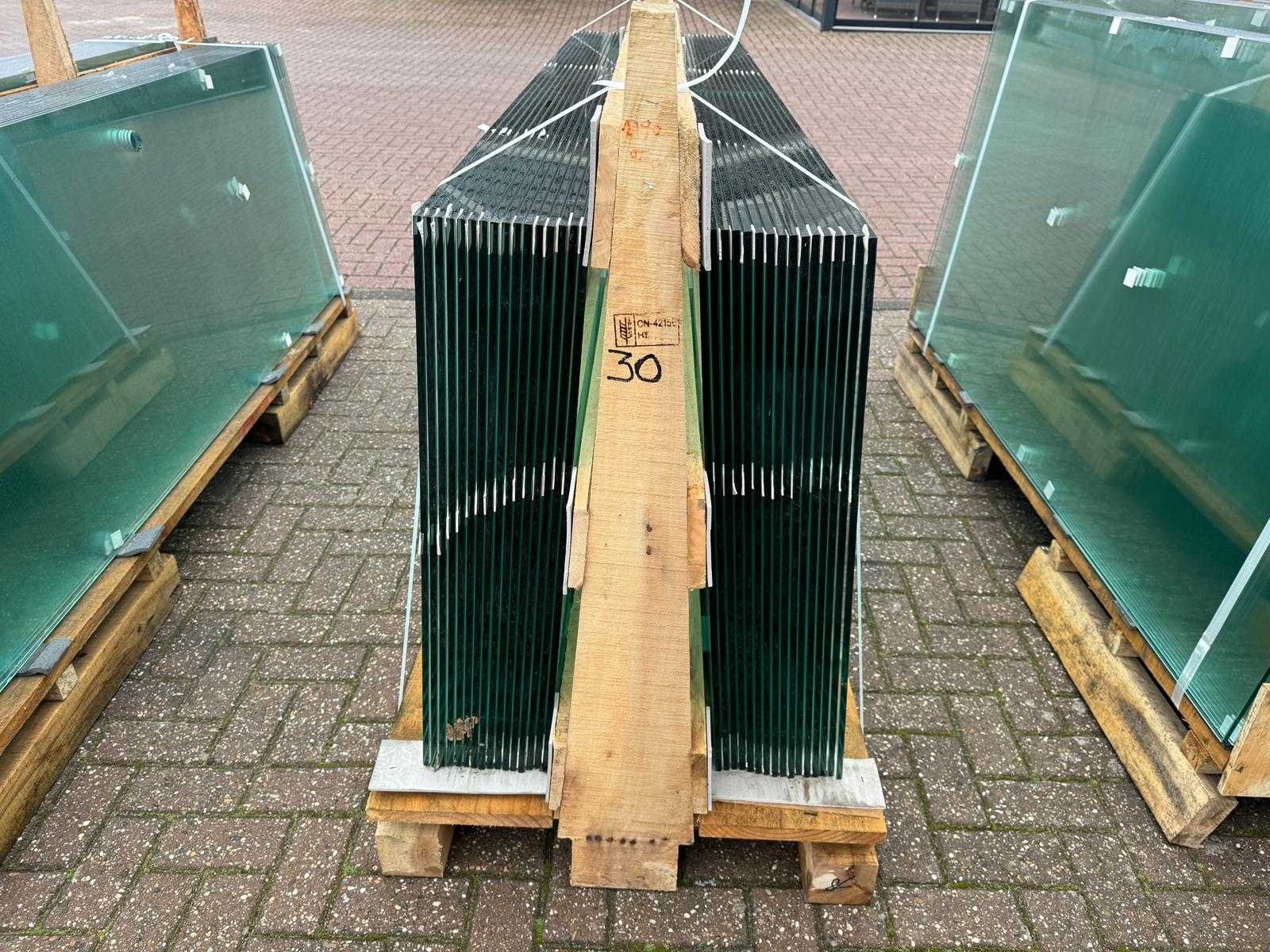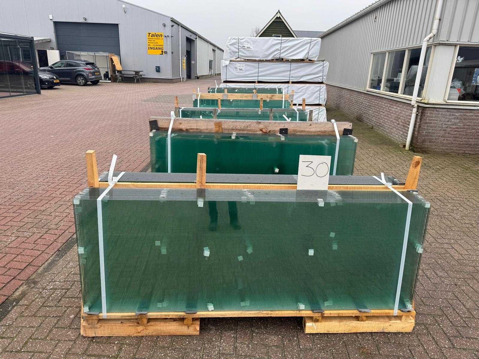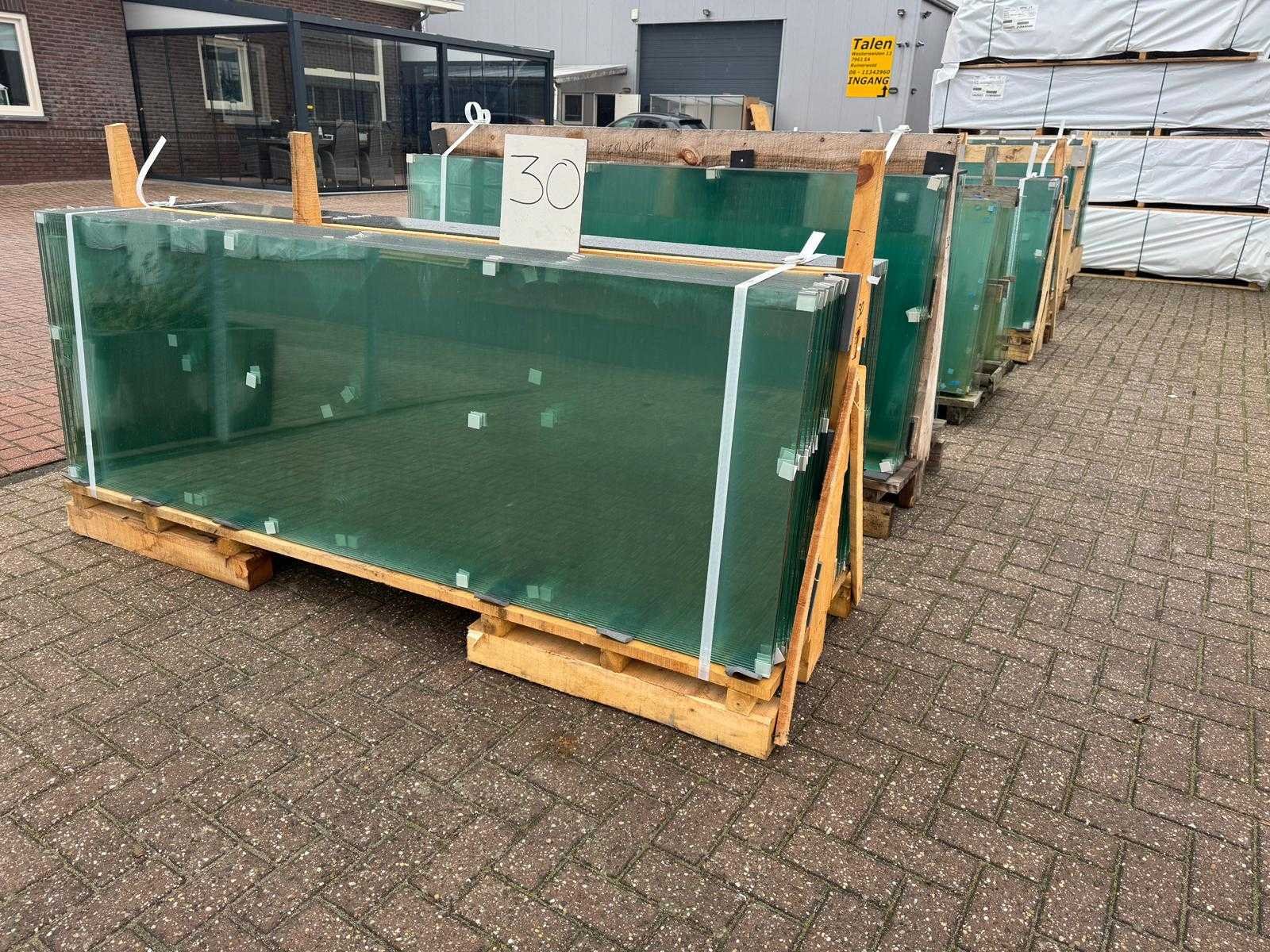 180 stuks ramen gehard veiligheidsglas 10mm dik • Diverse afmetingen • Totaal: 180 ramen • Conditie: partijhandel – kan lichte strepen, vlekjes of vegen bevatten • Verpakking: op pallet met glas • Opmerking: foto van overkapping is ter illustratie • Heftruck is aanwezig voor het afhalen