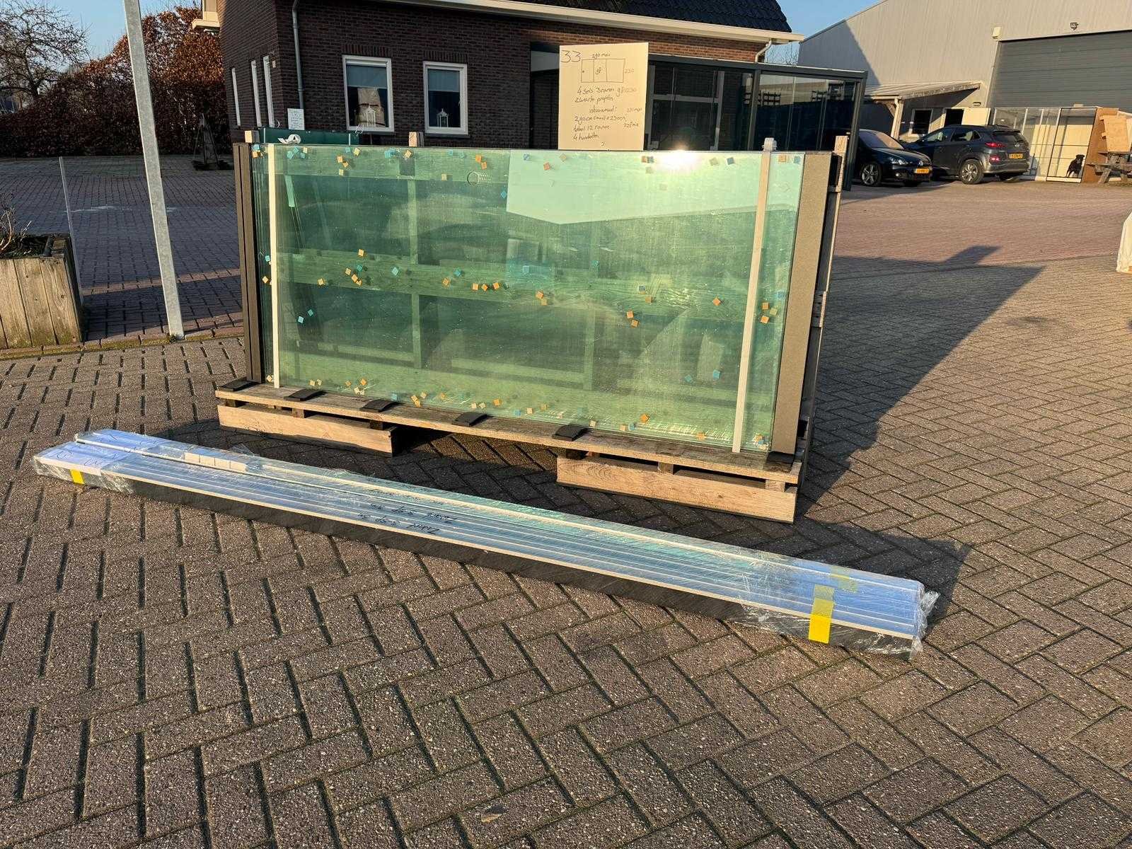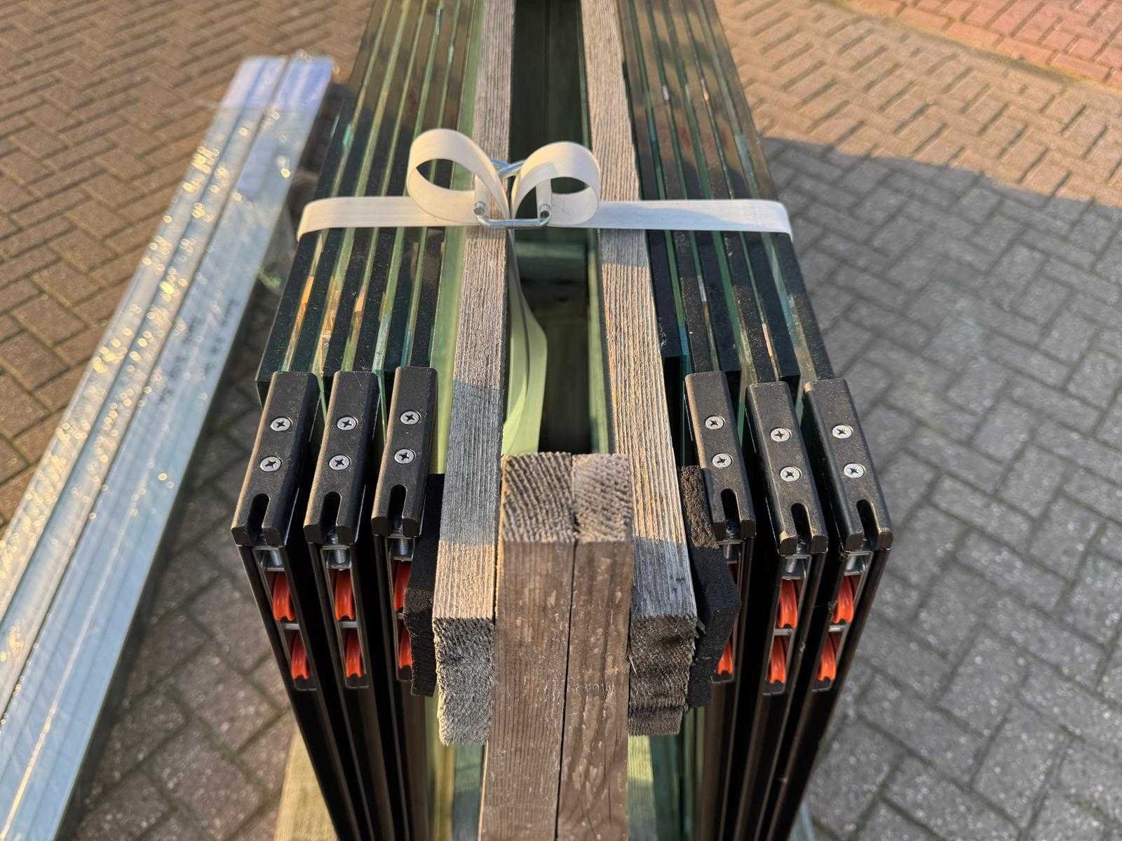 4 sets van 3 schuiframen – 98 cm x 230 cm, helder glas • Afmetingen per raam: breedte 98 cm, hoogte (dagmaat) 230 cm • Maximale breedte complete set: 290 cm • Totaal: 12 ramen (4 sets van 3 stuks) • Materiaal & kleur: zwart aluminium frame, helder glas • Inclusief: 4 boven- en 4 onder-rails met 3 sporen • 4 handgrepen • Conditie: partijhandel – kan lichte strepen of vegen bevatten • Verpakking: op pallet met glas • Opmerking: foto van overkapping is ter illustratie • Heftruck is aanwezig voor het afhalen