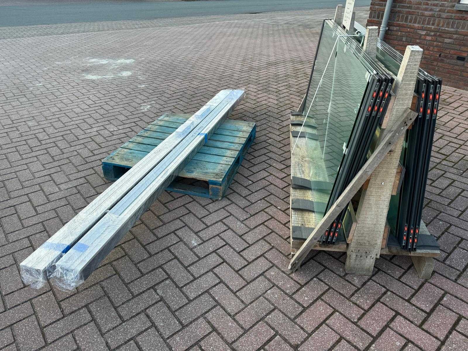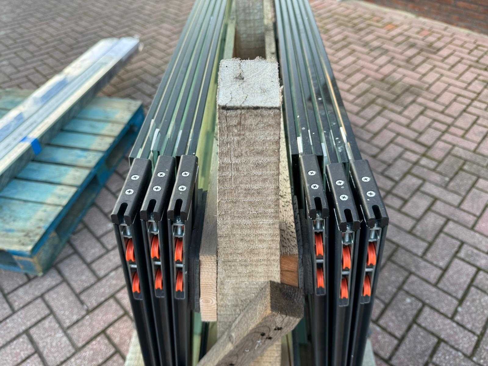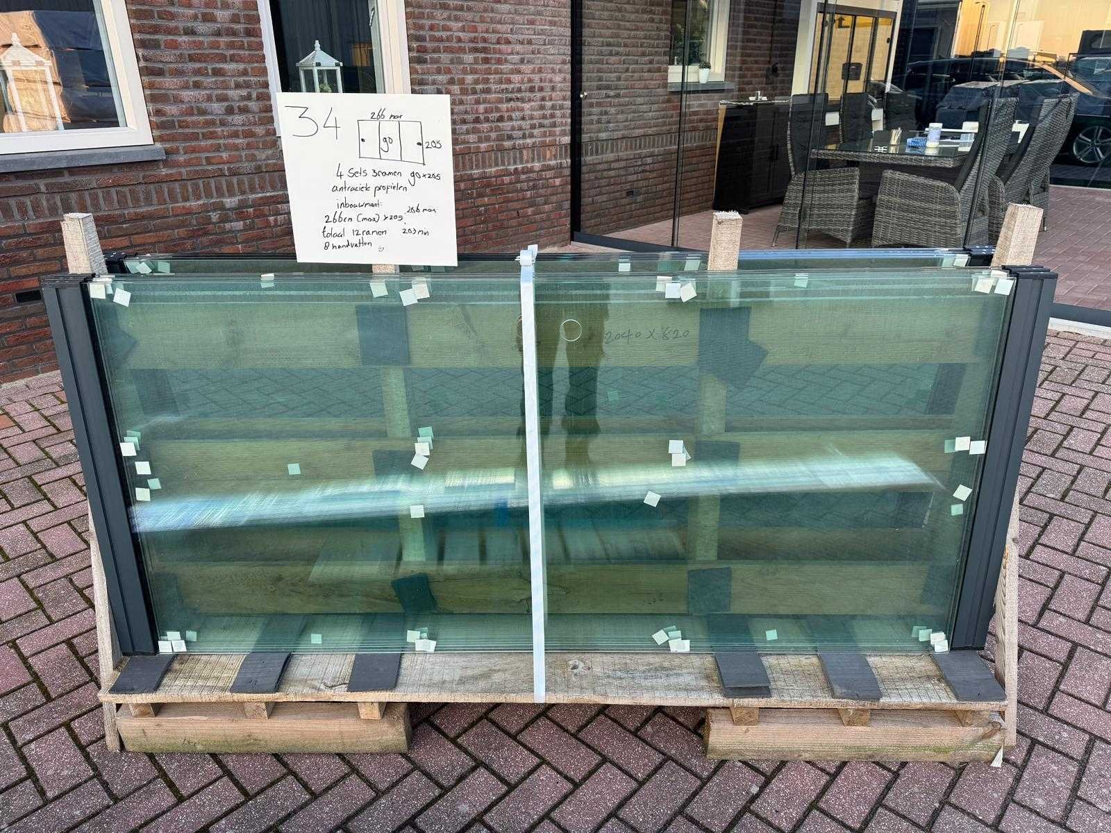 4 sets van 3 schuiframen – 90 cm x 205 cm, helder glas • Afmetingen per raam: breedte 90 cm, hoogte (dagmaat) 205 cm • Maximale breedte complete set: 266 cm • Totaal: 12 ramen (4 sets van 3 stuks) • Materiaal & kleur: antraciet aluminium frame, helder glas • Inclusief: 4 boven- en 4 onder-rails met 3 sporen • 8 handgrepen • Conditie: partijhandel – kan lichte strepen of vegen bevatten • Verpakking: op pallet met glas • Opmerking: foto van overkapping is ter illustratie • Heftruck is aanwezig voor het afhalen