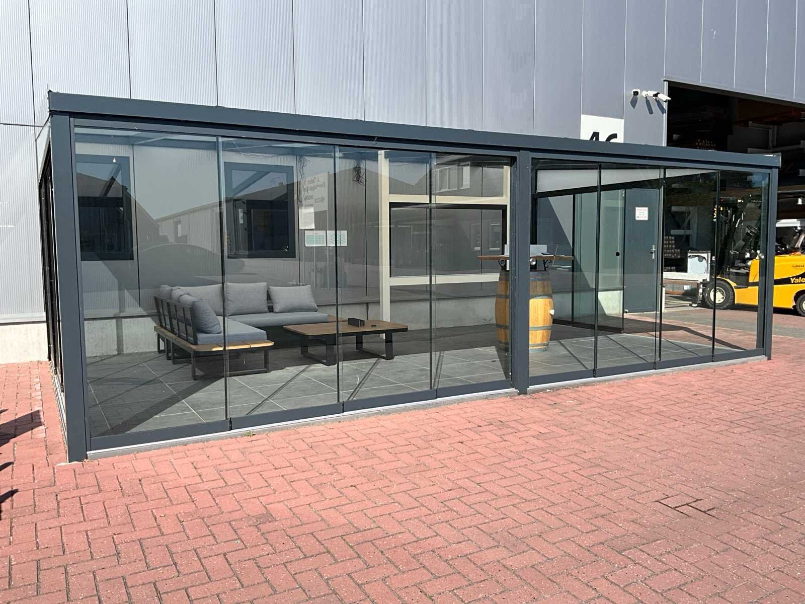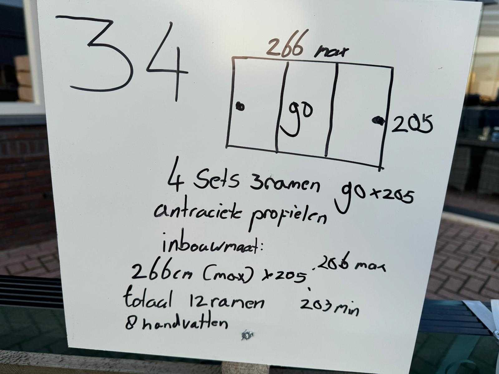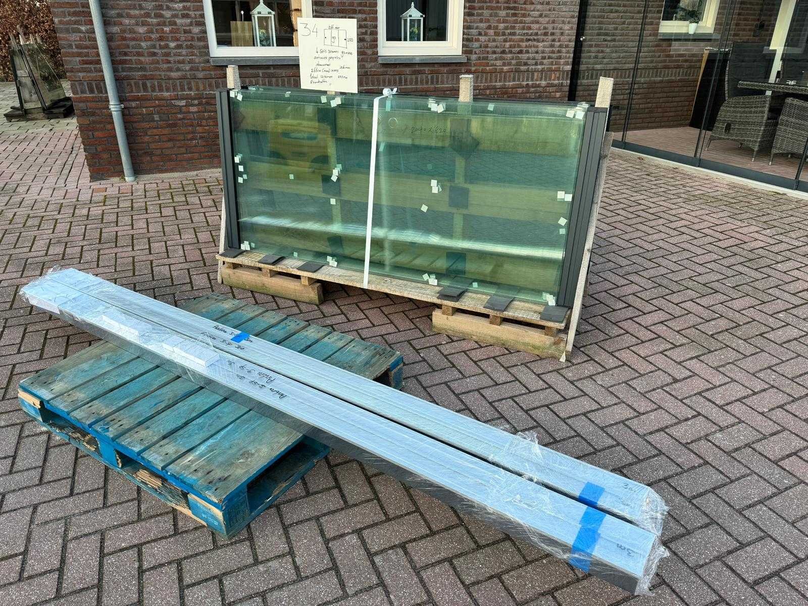 4 sets van 3 schuiframen – 90 cm x 205 cm, helder glas • Afmetingen per raam: breedte 90 cm, hoogte (dagmaat) 205 cm • Maximale breedte complete set: 266 cm • Totaal: 12 ramen (4 sets van 3 stuks) • Materiaal & kleur: antraciet aluminium frame, helder glas • Inclusief: 4 boven- en 4 onder-rails met 3 sporen • 8 handgrepen • Conditie: partijhandel – kan lichte strepen of vegen bevatten • Verpakking: op pallet met glas • Opmerking: foto van overkapping is ter illustratie • Heftruck is aanwezig voor het afhalen