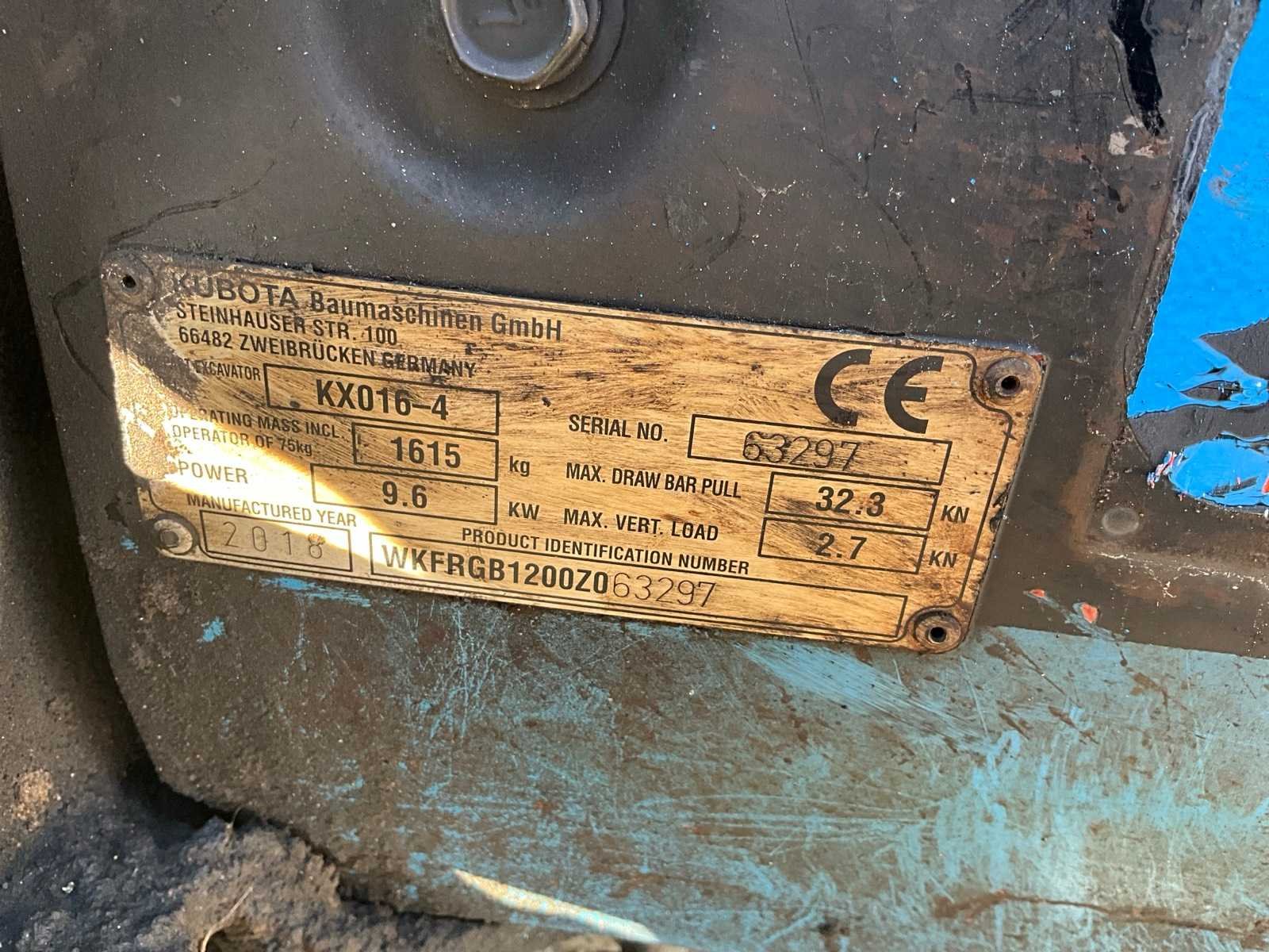 Voorzien: dozerblad,, “Eurosteel” graafbak, voorbereiding extra functie, transportlengte circa: 3710 mm Merk: Kubota Type: KX016-4 Bouwjaar: 2019 Serienummer: WKFRGB1200Z063297 Merk motor: Kubota D902 Motorvermogen (kW): 9.6kW Aantal cilinders: 3 Brandstof: Diesel Bedrijfsgewicht: 1615kg Gieklengte: 3000mm Max. werkbereik: 3730mm Max. graafdiepte: 2250mm Inclusief graafbak: Yes Graafbak afm. l: 450mm Graafbak afm. b: 430mm Graafbak afm. h: 250mm Rups breedte: 230mm Afgelezen urenstand: 1488 Eigen gewicht: 1540kg Totale afmeting Breedte: 990mm Totale afmeting Hoogte: 2400mm