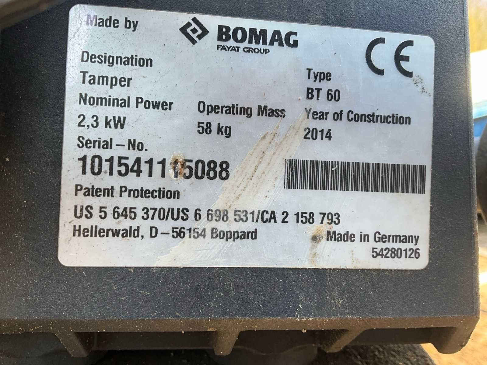 Merk: Bomag Type: BT60 Bouwjaar: 2014 Bedrijfsgewicht: 58kg Afmeting voet l: 340mm Afmeting voet b: 230mm Merk motor: Honda Motorvermogen (kW): 2.3kW Brandstof: Benzine Totale afmeting Hoogte: 1000mm