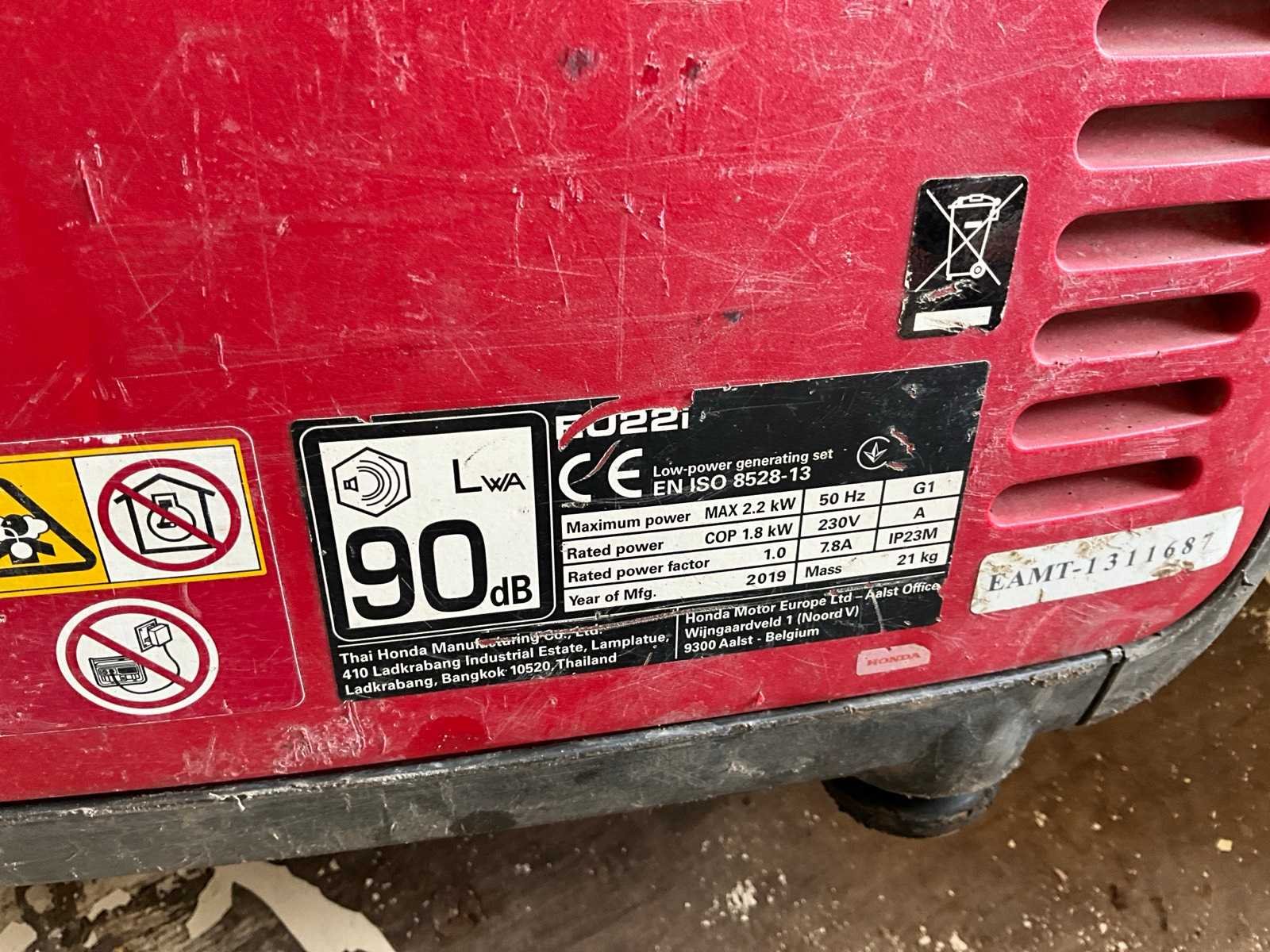 Merk: Honda Type: Inverter EU22is Bouwjaar: 2019 Aansluiting: 230V Motorcapaciteit: 1.8kW Machinegewicht: 59kg