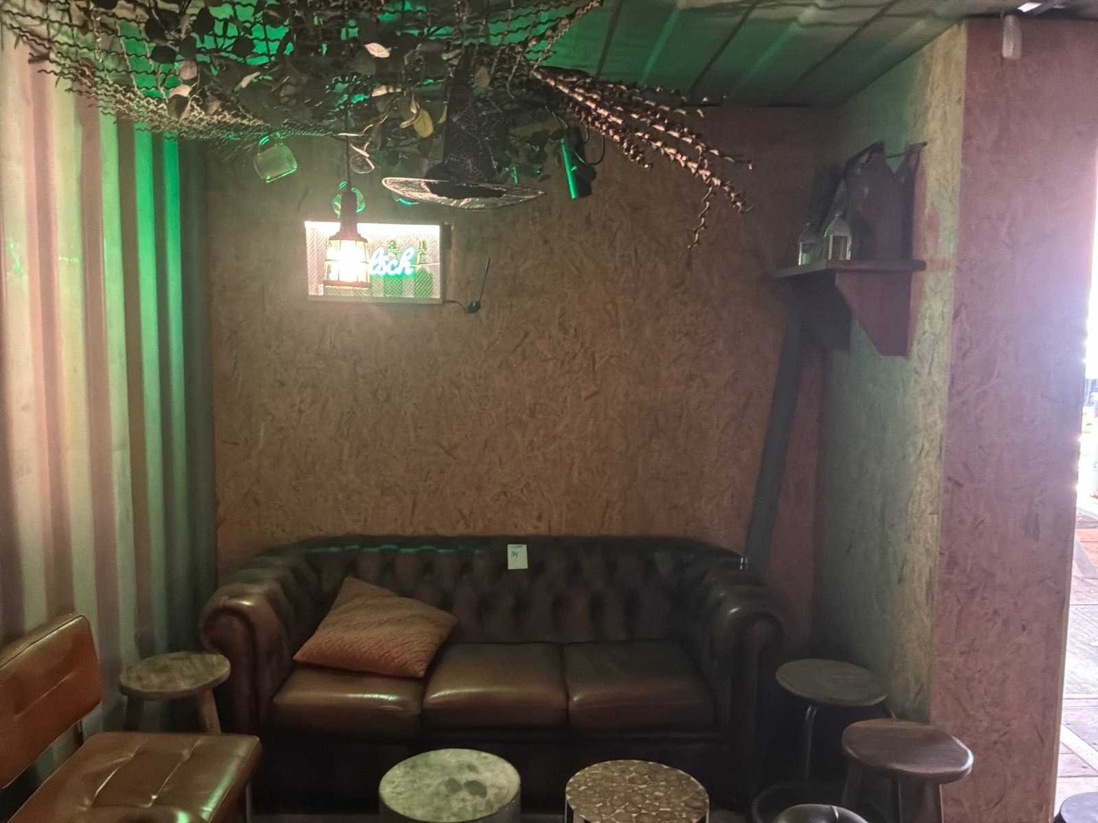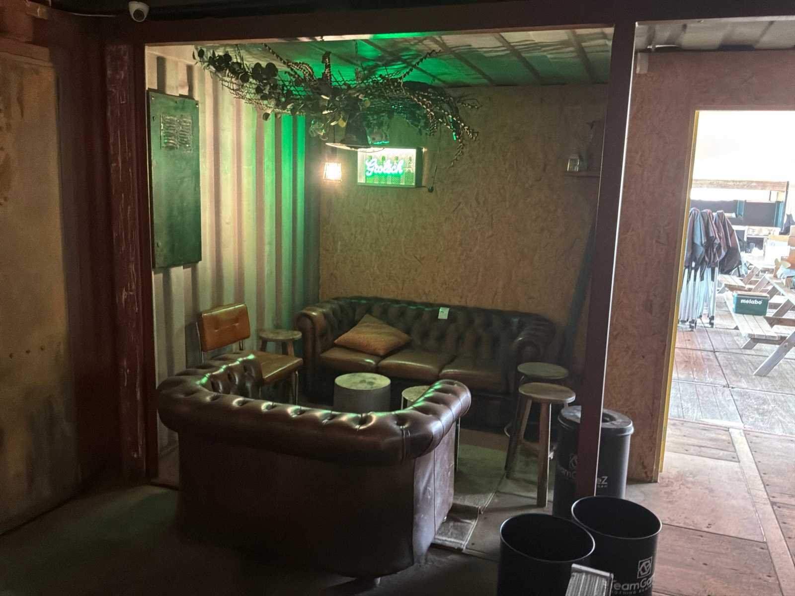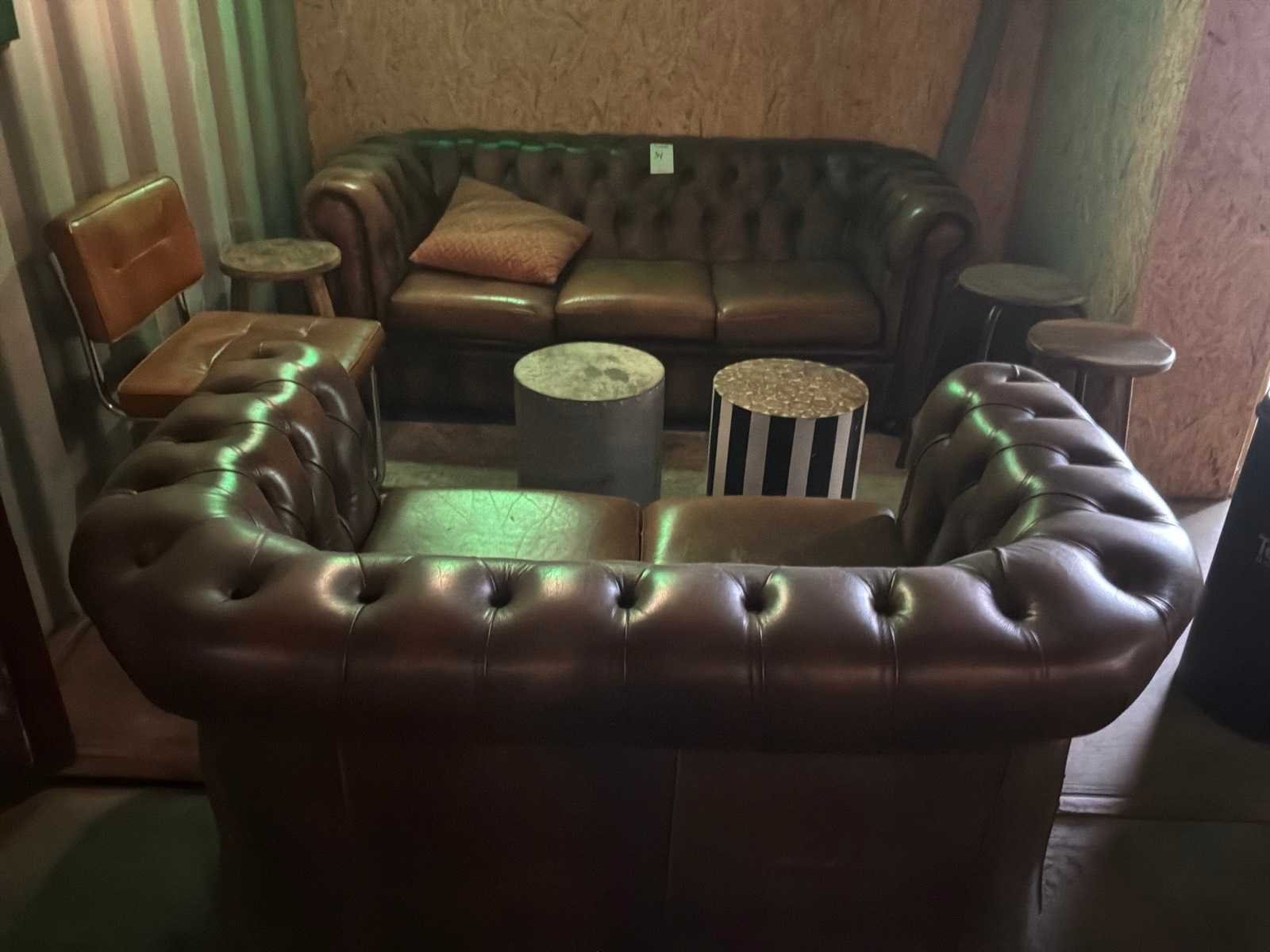 Bestaande uit: 1x driezitsbank 182x83x70cm, 1x tweezitsbank 140x80x70cm, 2x tafel met krukje, lamp, wandplank met decoratie materiaal. Zitplaatsen: 5