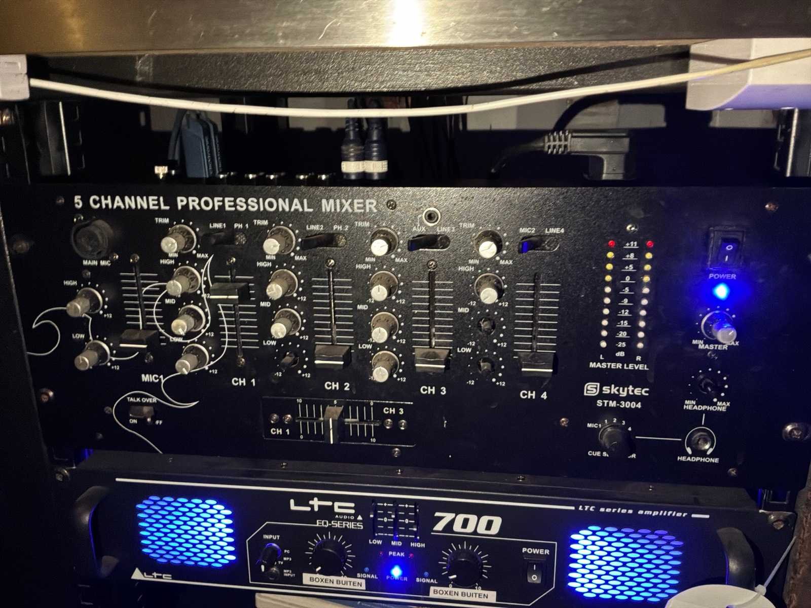 3 delig, 1x Skytec STM-3004 mixer, 1x LTC 700 Ampiflier, 1x Next MA1700 Ampiflier, speakers niet inbegrepen.