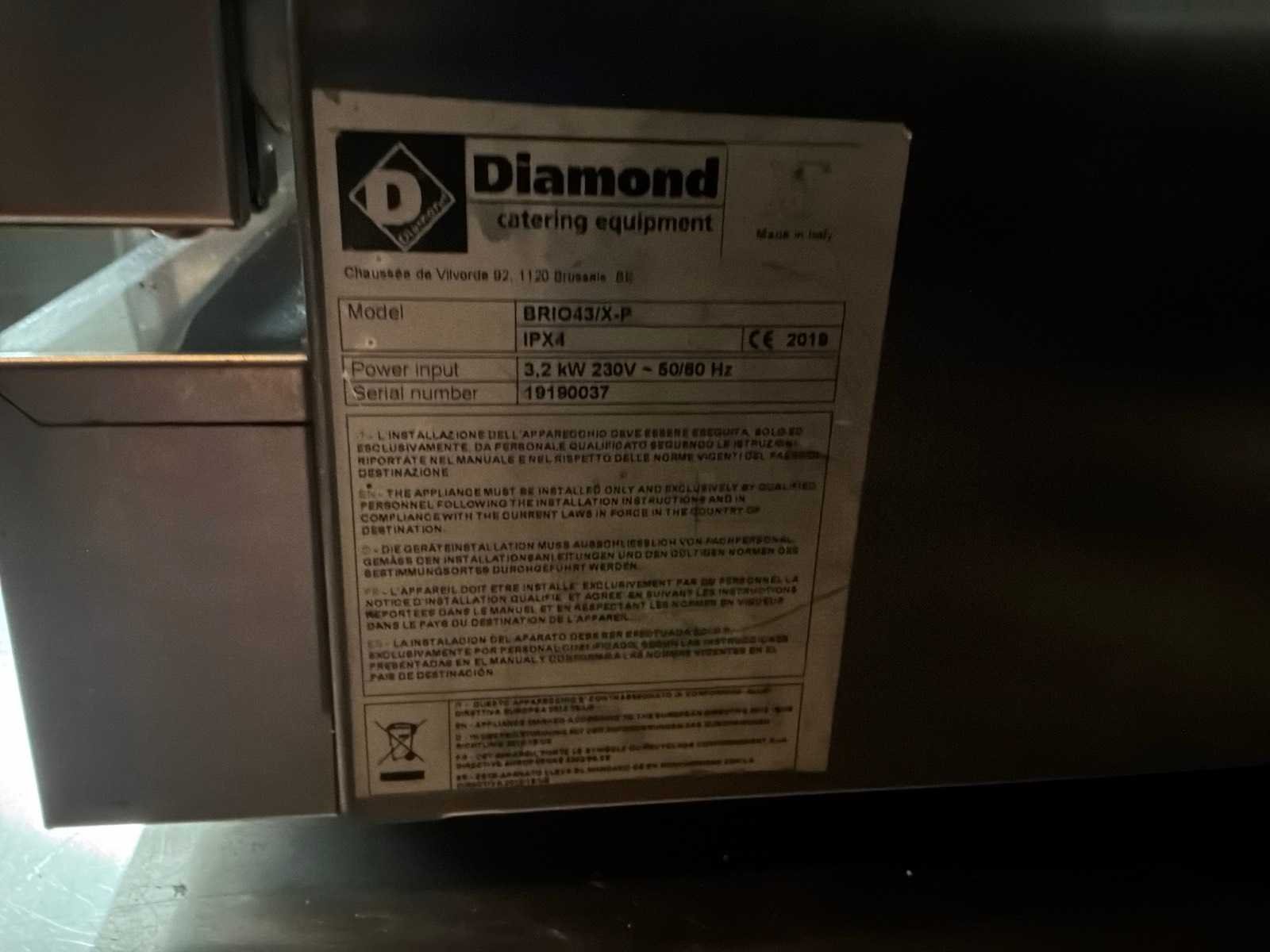 Merk: Diamond Type: Brio43/X-P Materiaal: RVS Serienummer: 19190037 Aansluiting: 230V Elektrisch: true Rvs: true Vermogen: 3.2kW Totale afmeting L: 60cm Totale afmeting Breedte: 58cm Totale afmeting Hoogte: 57cm Bouwjaar: 2019