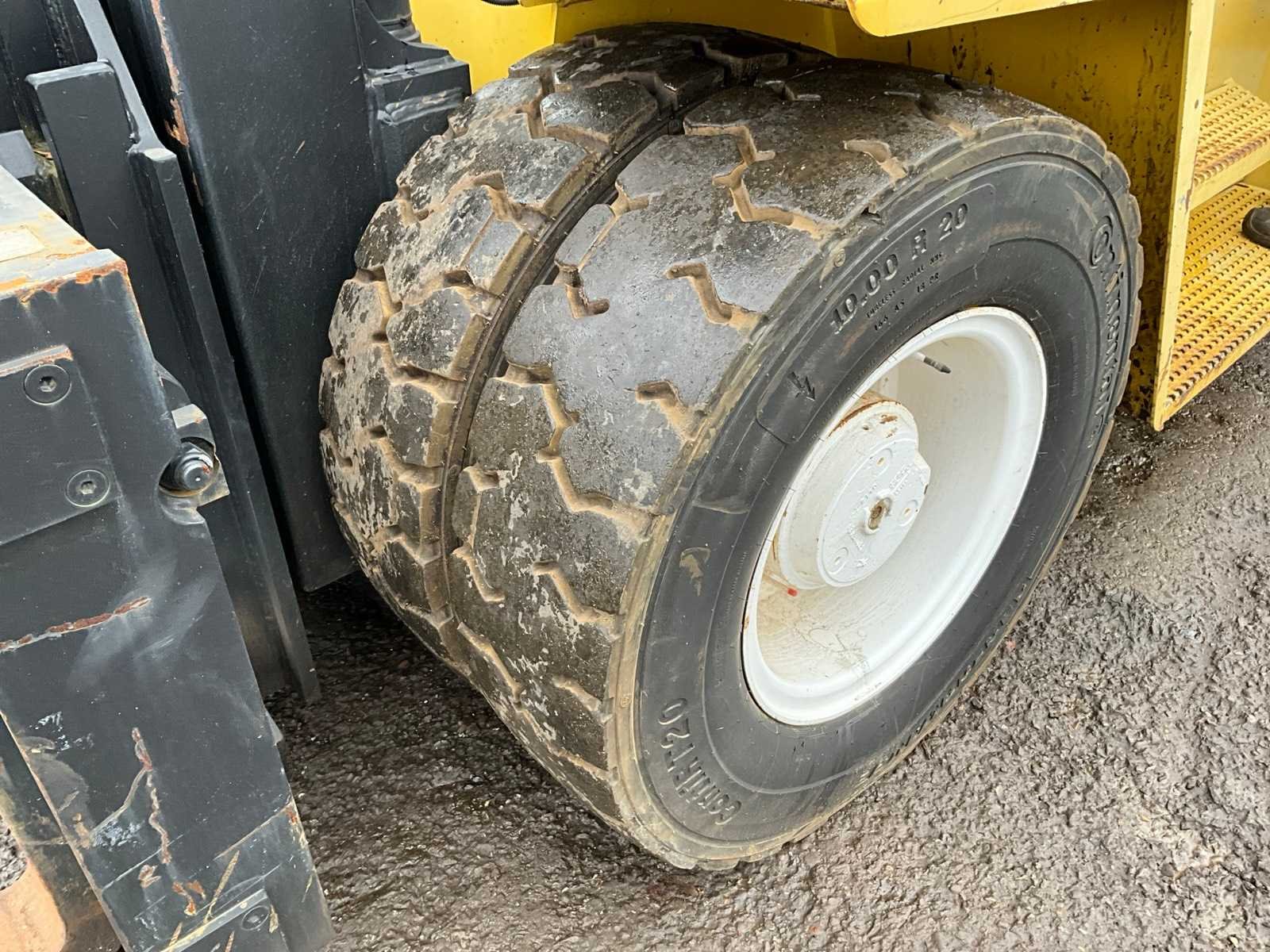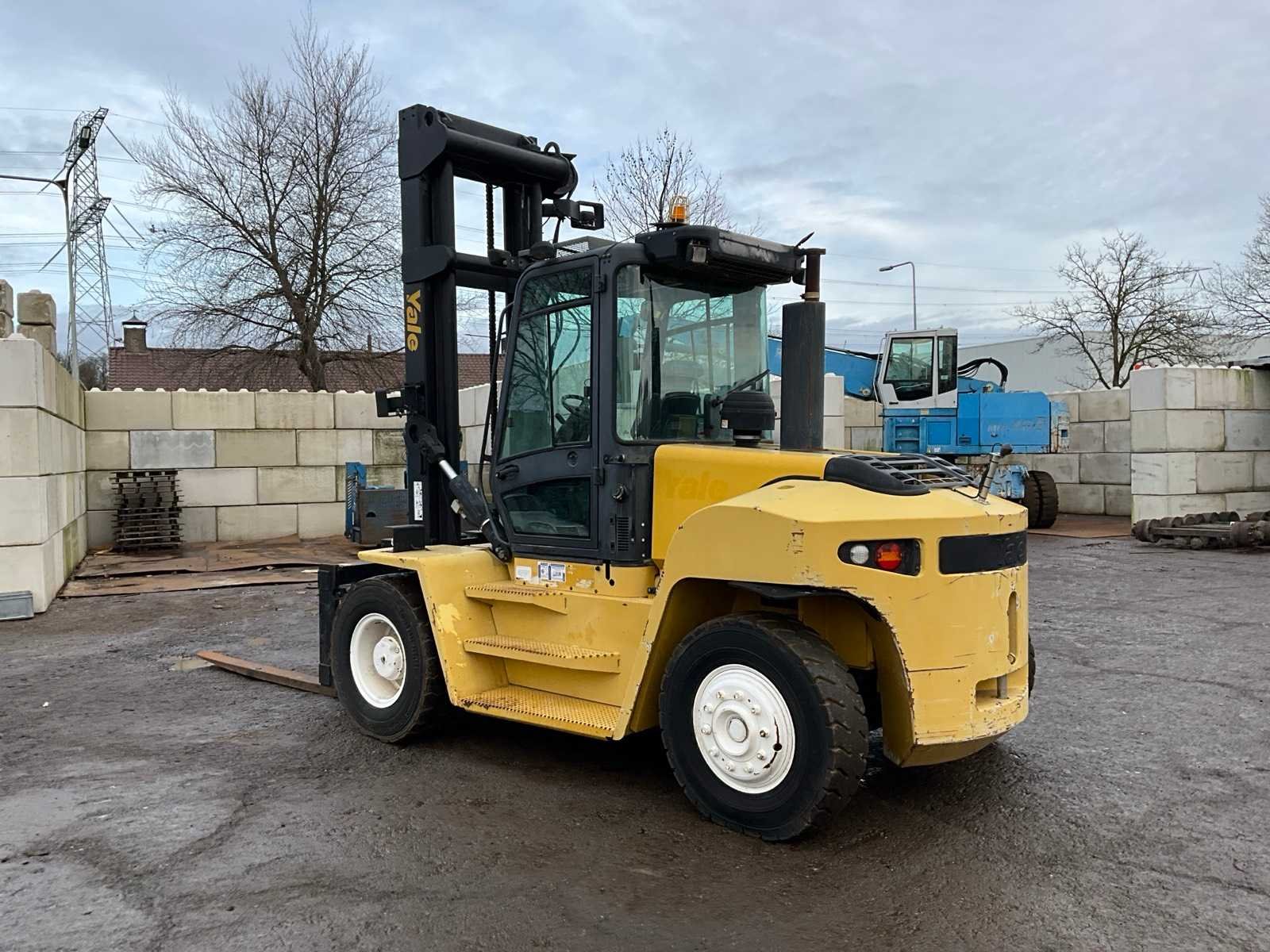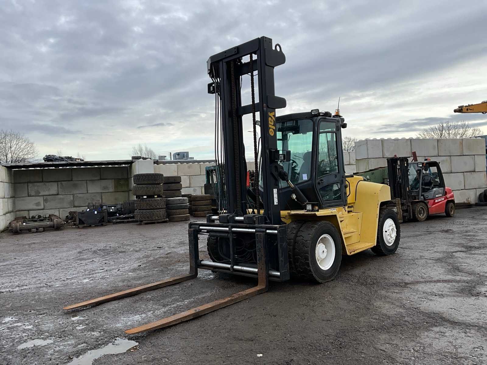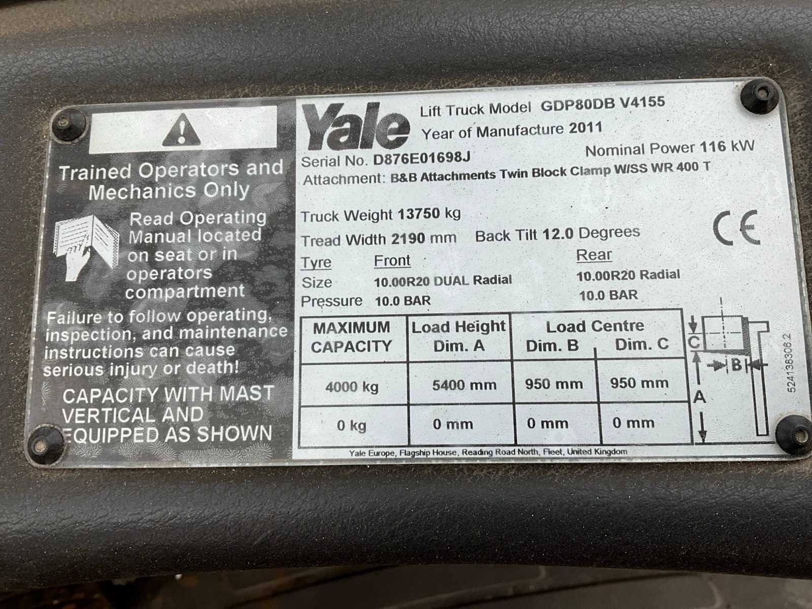 Achteruit rij camera, kachel, 1x cilinder vorkenbord los Merk: Yale Type: GEP80DB V4155 Bouwjaar: 2011 Serienummer: D876E01698J Brandstof: Diesel Mast: Duplex Soort band: Luchtbanden Aantal wielen: 4 Afgelezen urenstand: 17847 Side-shift: true Hydraulisch verstelbare lepels: true Duplex mast: true Eigen gewicht: 13750kg Hefvermogen: 8000kg Lepellengte: 2350mm Hefhoogte: 5400mm Totale afmeting L: 7000mm Totale afmeting Breedte: 2400mm Totale afmeting Hoogte: 4150mm