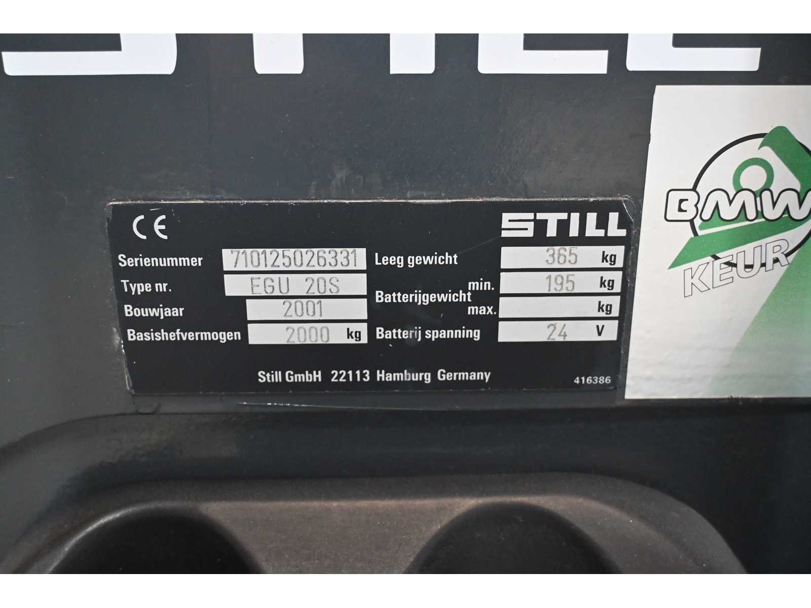 Merk: Still Type: EGU 20S Hefvermogen: 2000kg Eigen gewicht: 560kg