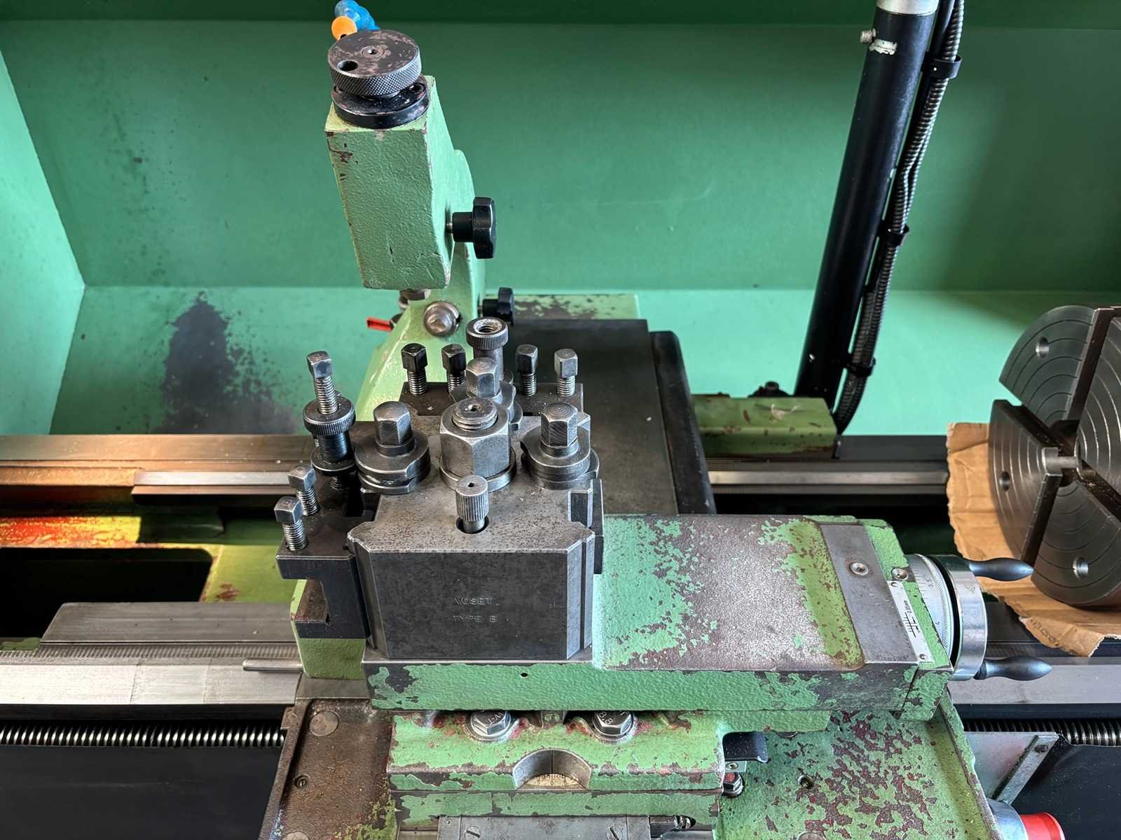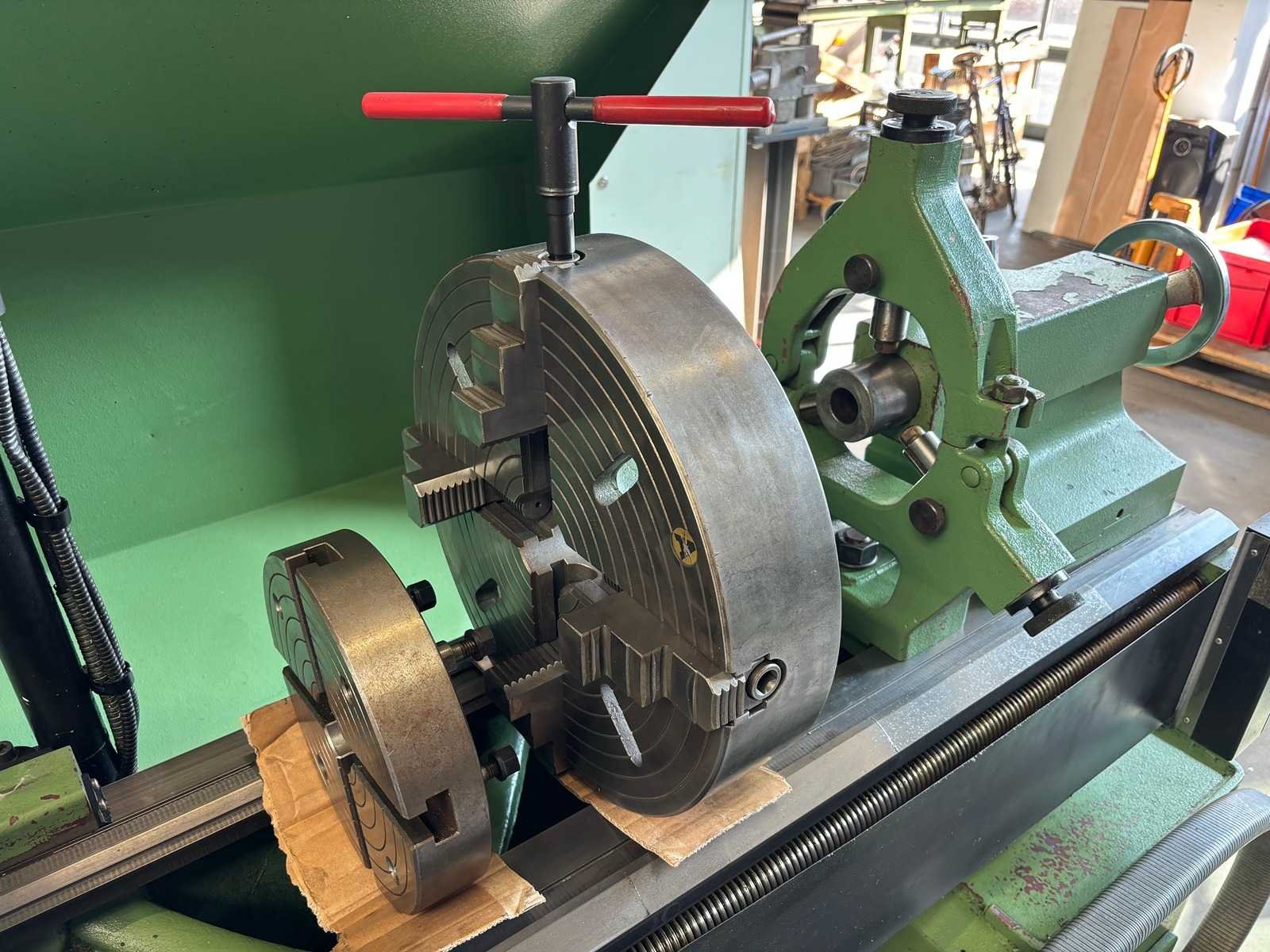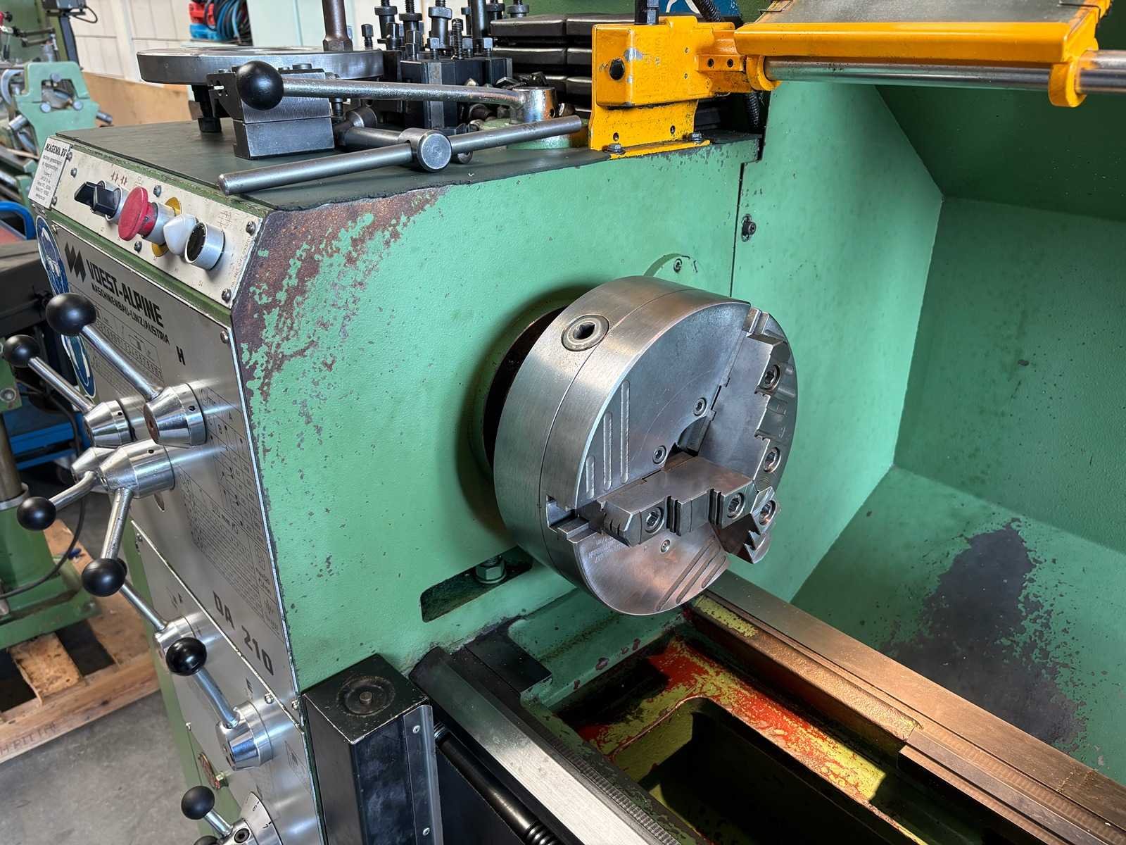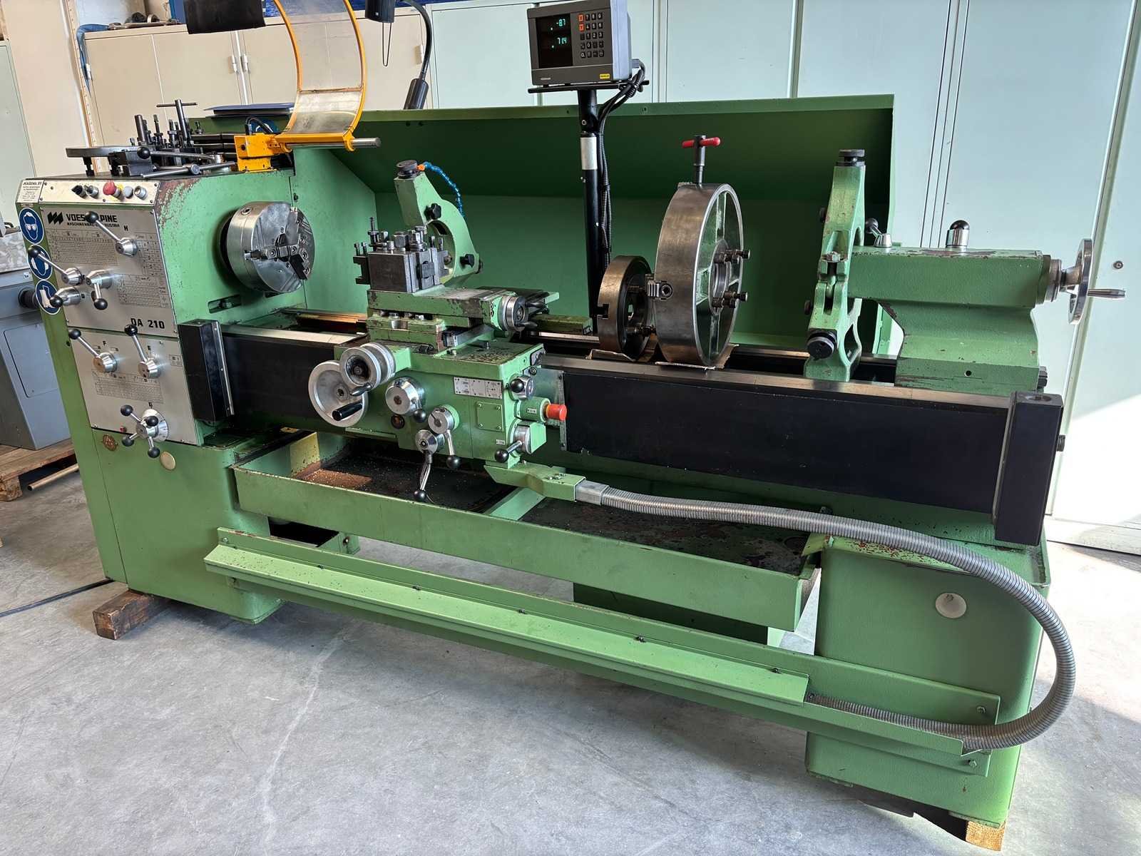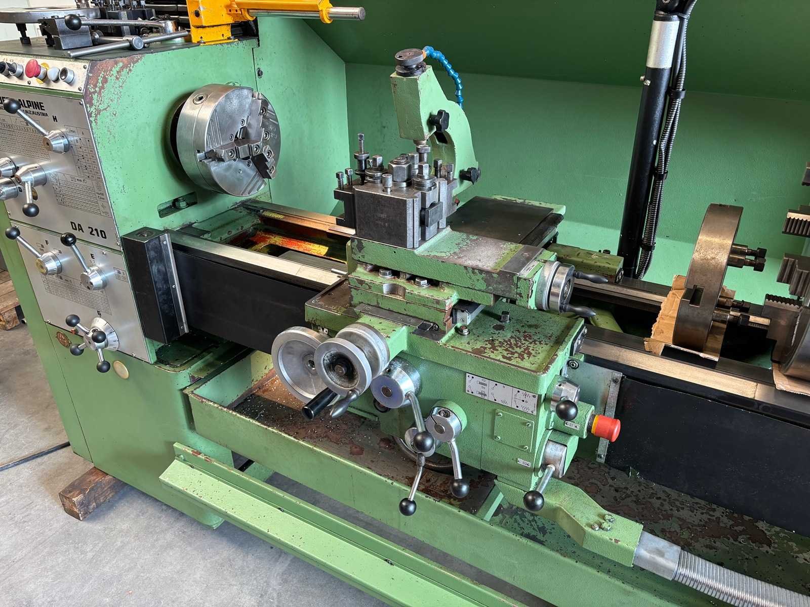 Machine geserviced, gecontroleerd op goede werking en geometrie Alles functioneert en is in goede staat compleet met Heidenhain digitale uitlezing, 3-klauwplaat 250 mm, 4-klauwplaat 400 mm, snelwisselhouder met 9 houders, meeneemplaat, spanplaat, 1 vaste bril , 1 meelopende bril, stelvoeten en koelinstallatie Merk: Voest-Alpine Type: DA210 Draailengte: 1500mm Draai: 420mm Holle spil Ø: 52mm Aantal snelheden: 12 Snelheid van n =: 33rpm Snelheid tot n =: 1500rpm Koelmiddelpomp: true Aansluiting: 400V Machinegewicht: 1750kg Afmeting l: 3200mm Afmeting b: 1400mm Afmeting h: 1600mm