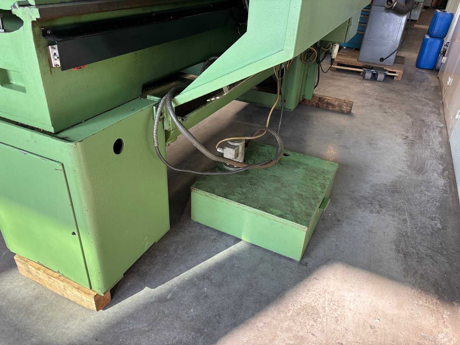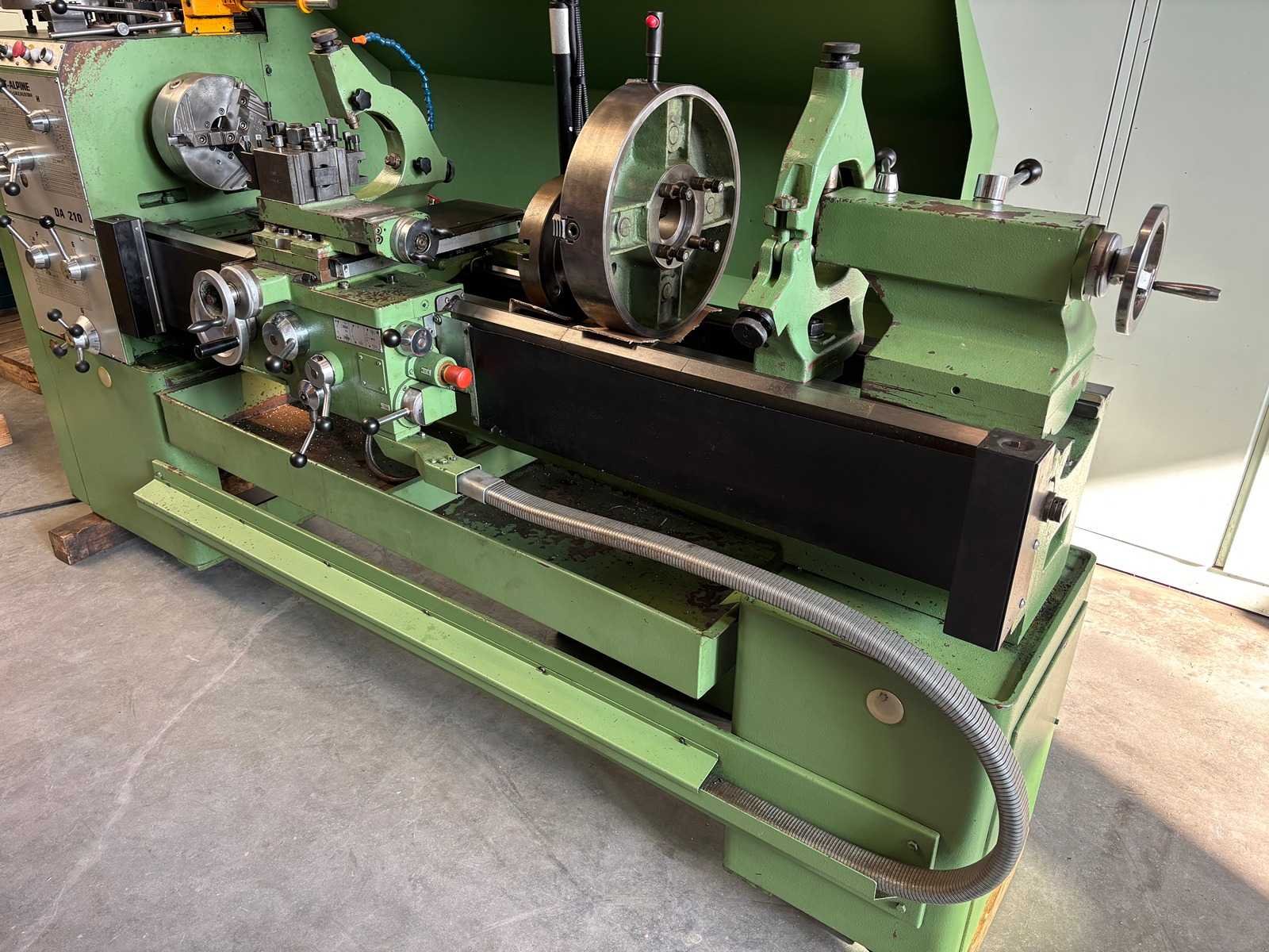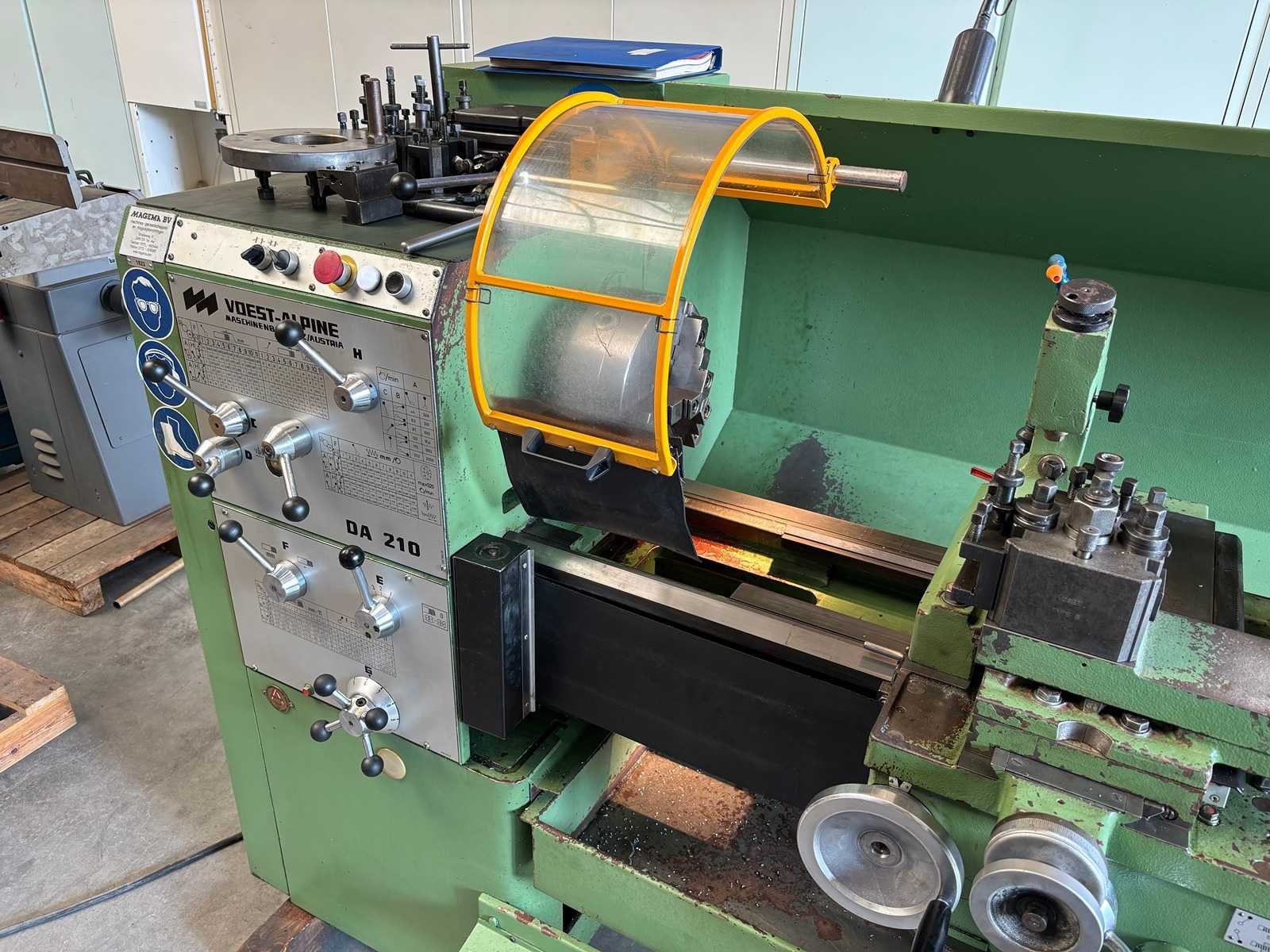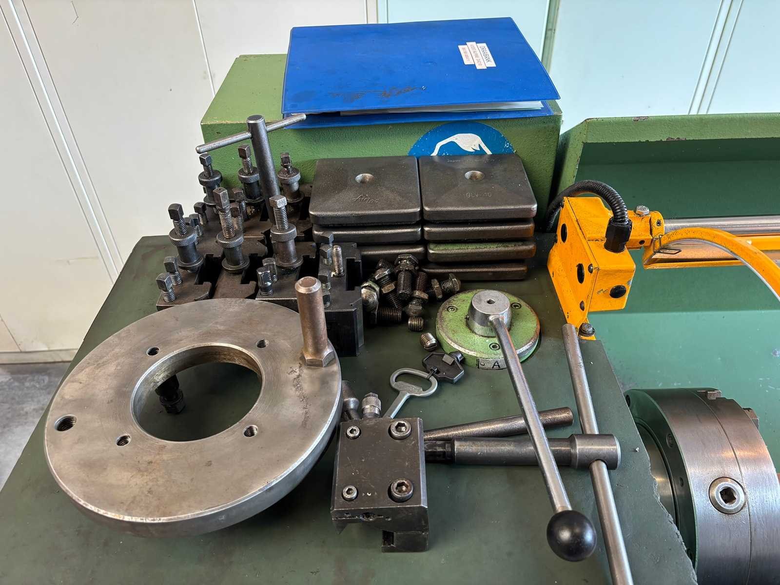 Machine geserviced, gecontroleerd op goede werking en geometrie Alles functioneert en is in goede staat compleet met Heidenhain digitale uitlezing, 3-klauwplaat 250 mm, 4-klauwplaat 400 mm, snelwisselhouder met 9 houders, meeneemplaat, spanplaat, 1 vaste bril , 1 meelopende bril, stelvoeten en koelinstallatie Merk: Voest-Alpine Type: DA210 Draailengte: 1500mm Draai: 420mm Holle spil Ø: 52mm Aantal snelheden: 12 Snelheid van n =: 33rpm Snelheid tot n =: 1500rpm Koelmiddelpomp: true Aansluiting: 400V Machinegewicht: 1750kg Afmeting l: 3200mm Afmeting b: 1400mm Afmeting h: 1600mm