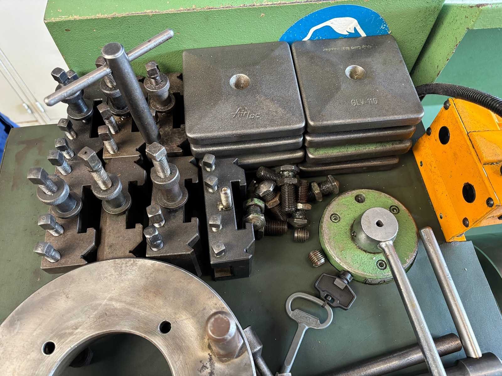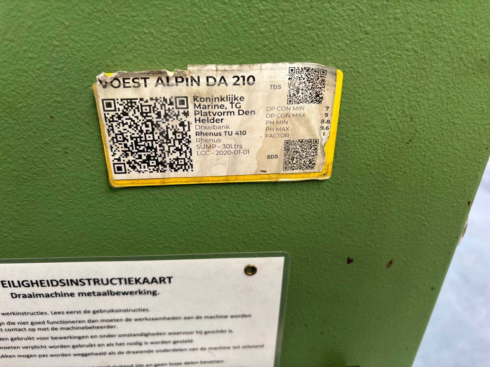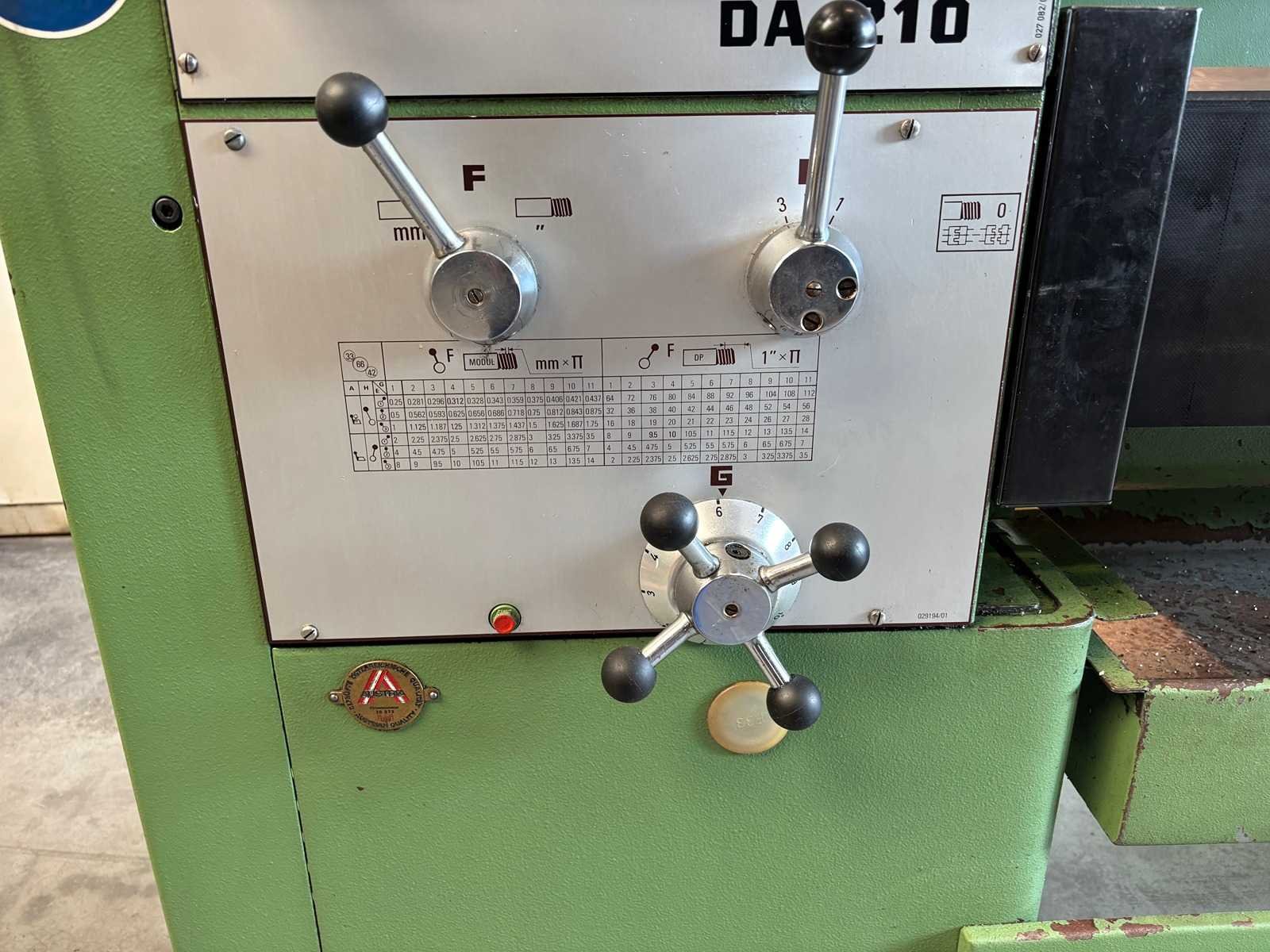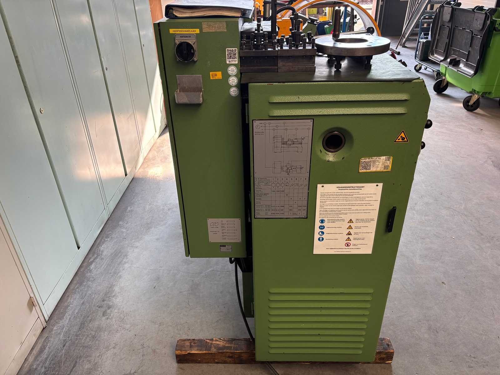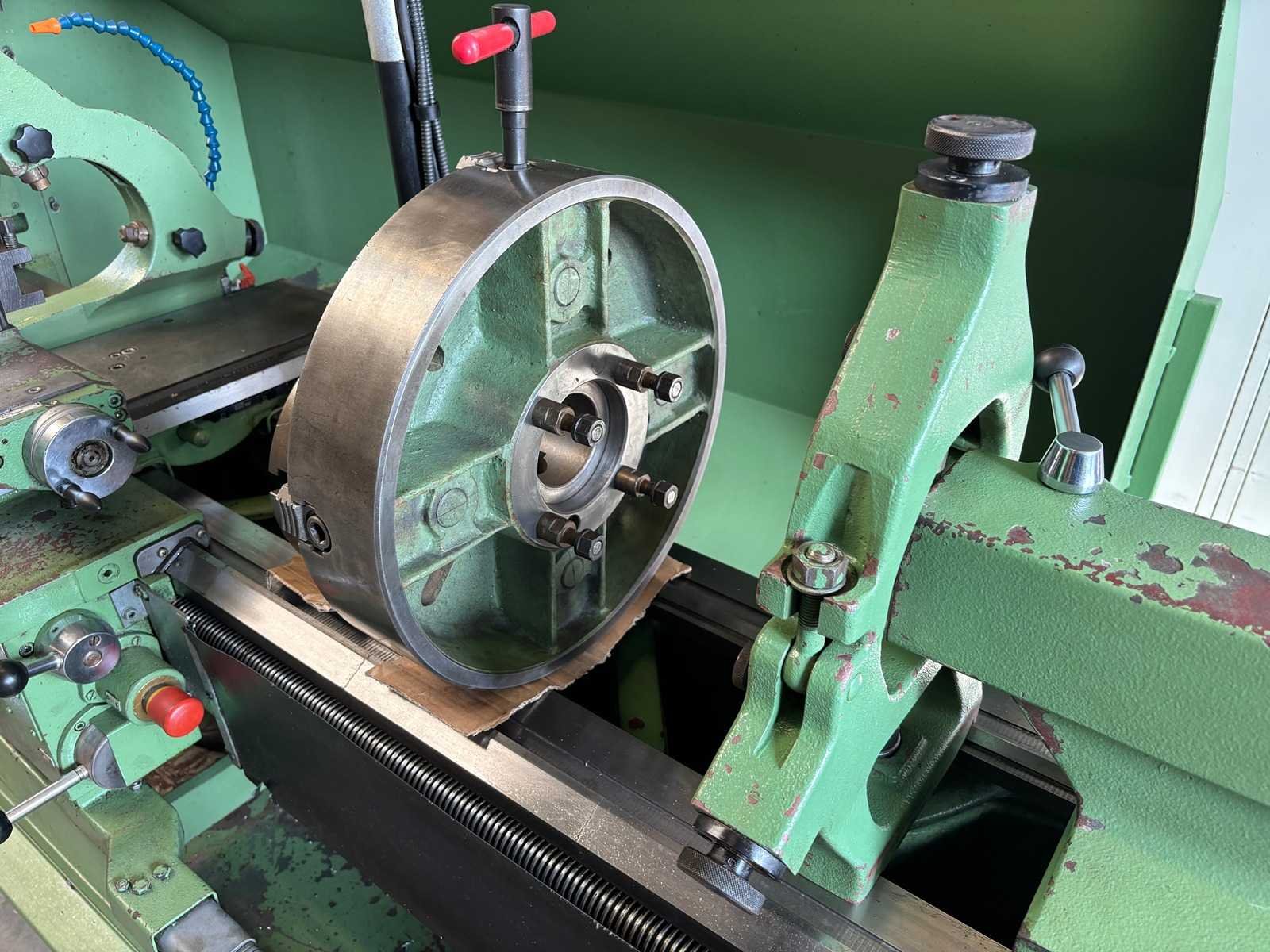 Machine geserviced, gecontroleerd op goede werking en geometrie Alles functioneert en is in goede staat compleet met Heidenhain digitale uitlezing, 3-klauwplaat 250 mm, 4-klauwplaat 400 mm, snelwisselhouder met 9 houders, meeneemplaat, spanplaat, 1 vaste bril , 1 meelopende bril, stelvoeten en koelinstallatie Merk: Voest-Alpine Type: DA210 Draailengte: 1500mm Draai: 420mm Holle spil Ø: 52mm Aantal snelheden: 12 Snelheid van n =: 33rpm Snelheid tot n =: 1500rpm Koelmiddelpomp: true Aansluiting: 400V Machinegewicht: 1750kg Afmeting l: 3200mm Afmeting b: 1400mm Afmeting h: 1600mm