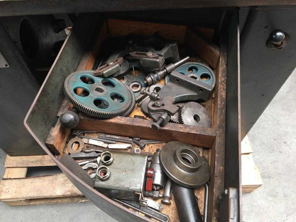 Machine werkt, verder niet getest Merk: Schaublin Type: 102VM Bouwjaar: 1969 Draailengte: 500mm Draai: 200mm Holle spil Ø: 17mm Snelheid van n =: 40rpm Snelheid tot n =: 4000rpm Aansluiting: 400V Machinegewicht: 600kg Afmeting l: 1000mm Afmeting b: 400mm Afmeting h: 1200mm