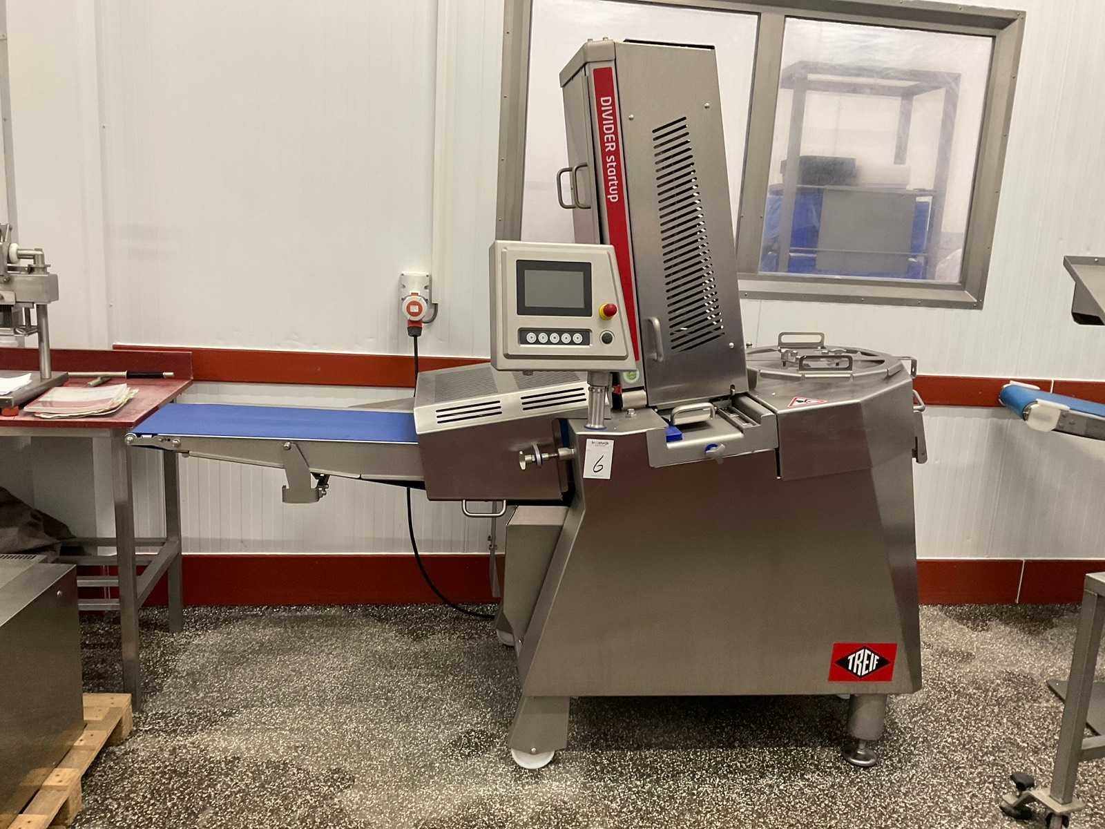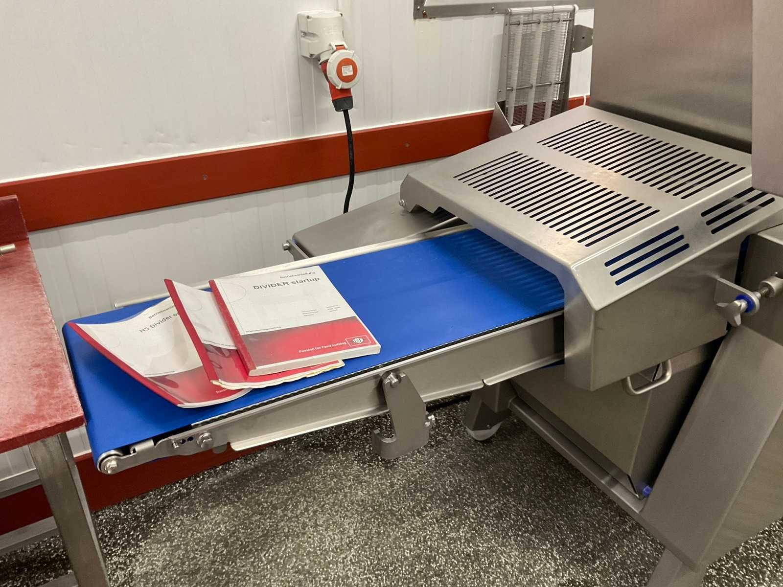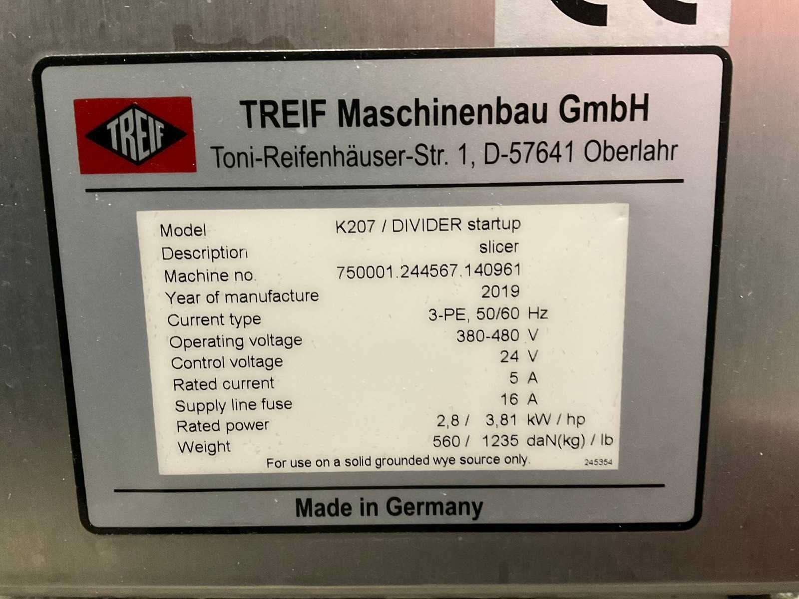 Voltage: 380V, Vermogen: 2,8kW, Afmeting van de slijpbare messen: Diameter 460mm (Bereik: 450-465mm), Snijkantshoek voor de voorzijde van het mes: 18° en 30°, Belast gewicht: 35kg, Maximale inleglengte: 600 mm, Maximale productdoorsnede: 280 x 160 mm, Snijdikte: 0,5 – 25 mm. Inclusief messenslijp kast. Merk: Treif Type: K207 Divider startup Bouwjaar: 2019 Serienummer: 750001.244567.140961 Aansluiting: 400V Eigen gewicht: 560kg Totale afmeting L: 2400mm Totale afmeting Breedte: 900mm Totale afmeting Hoogte: 2050mm