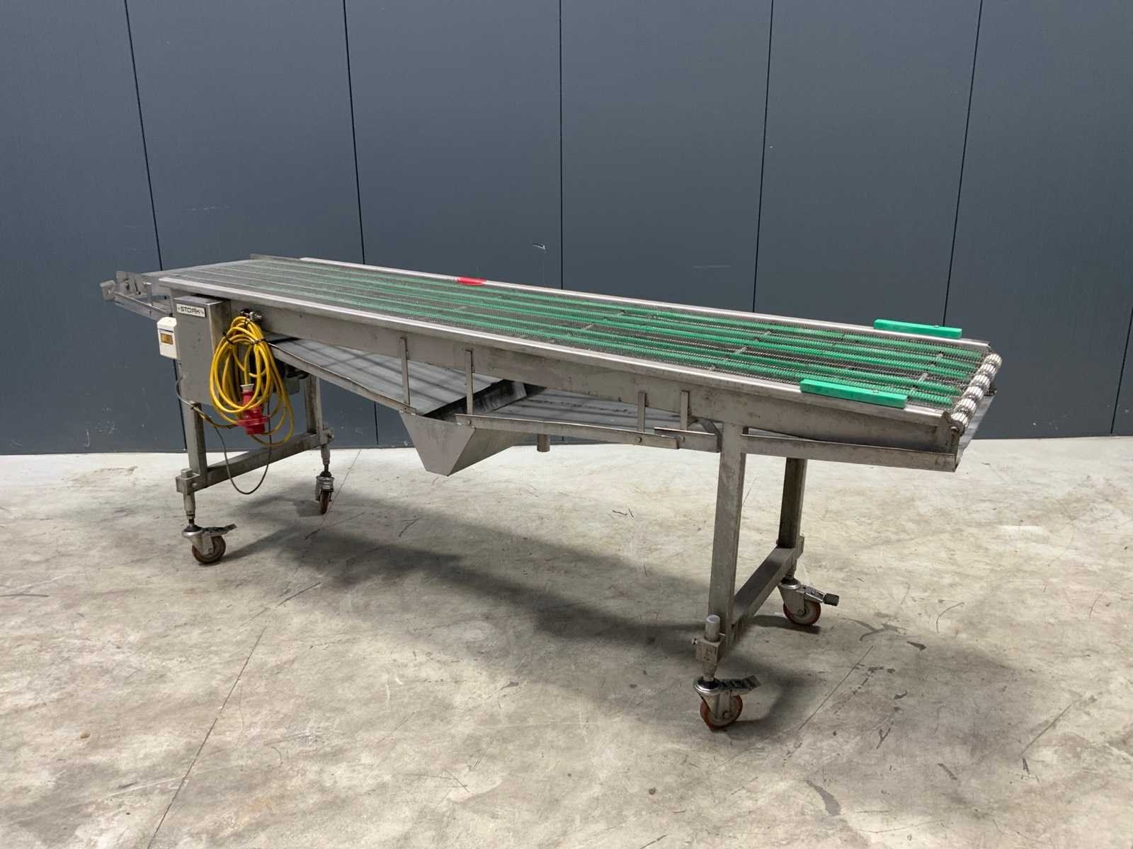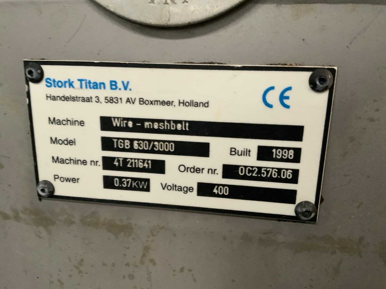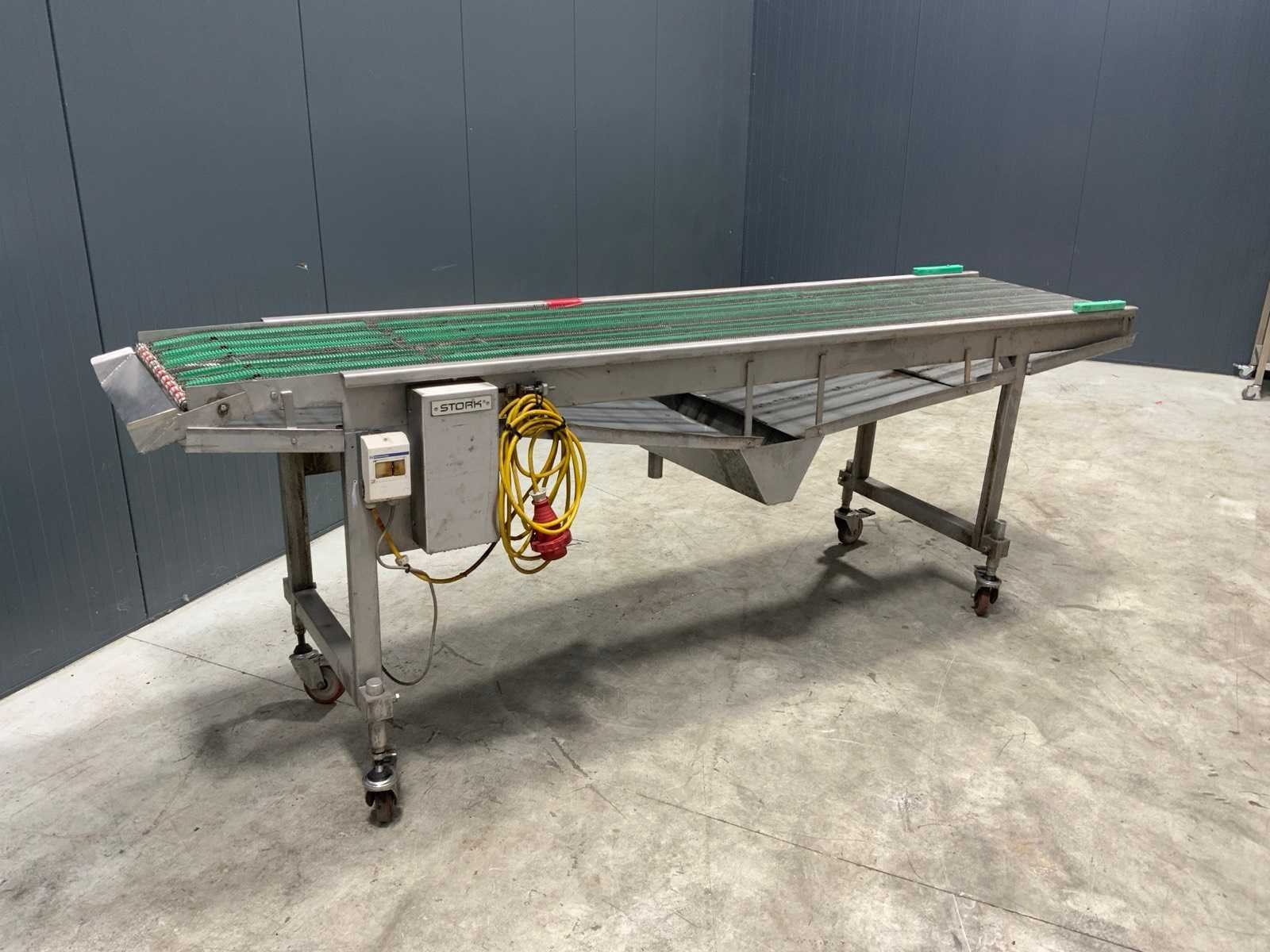 Voorzien van aandrijfmotor. Merk: Stork Band afm. l: 3100mm Band afm. b: 630mm Totale afmeting L: 3100mm Totale afmeting Breedte: 800mm Totale afmeting Hoogte: 1150mm