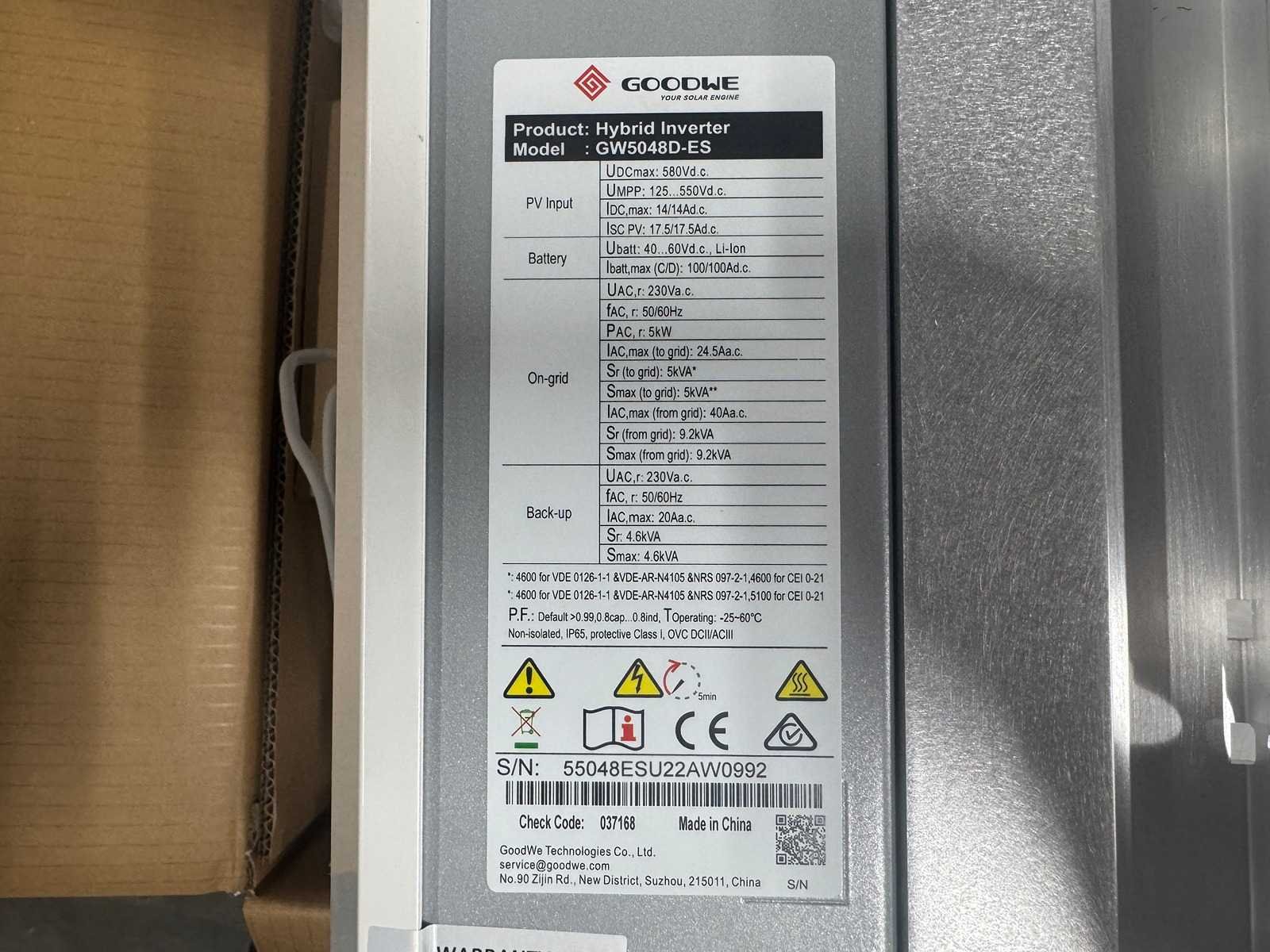 Omvormer: GoodWe 5048 hybride omvormer, incl. meetspoelen en meter. Batterij: 6x Dyness B4850 2.4kWh Lithium accu, inclusief kabelset Conditie: ongebruikt Merk: Goodwe + Dyness